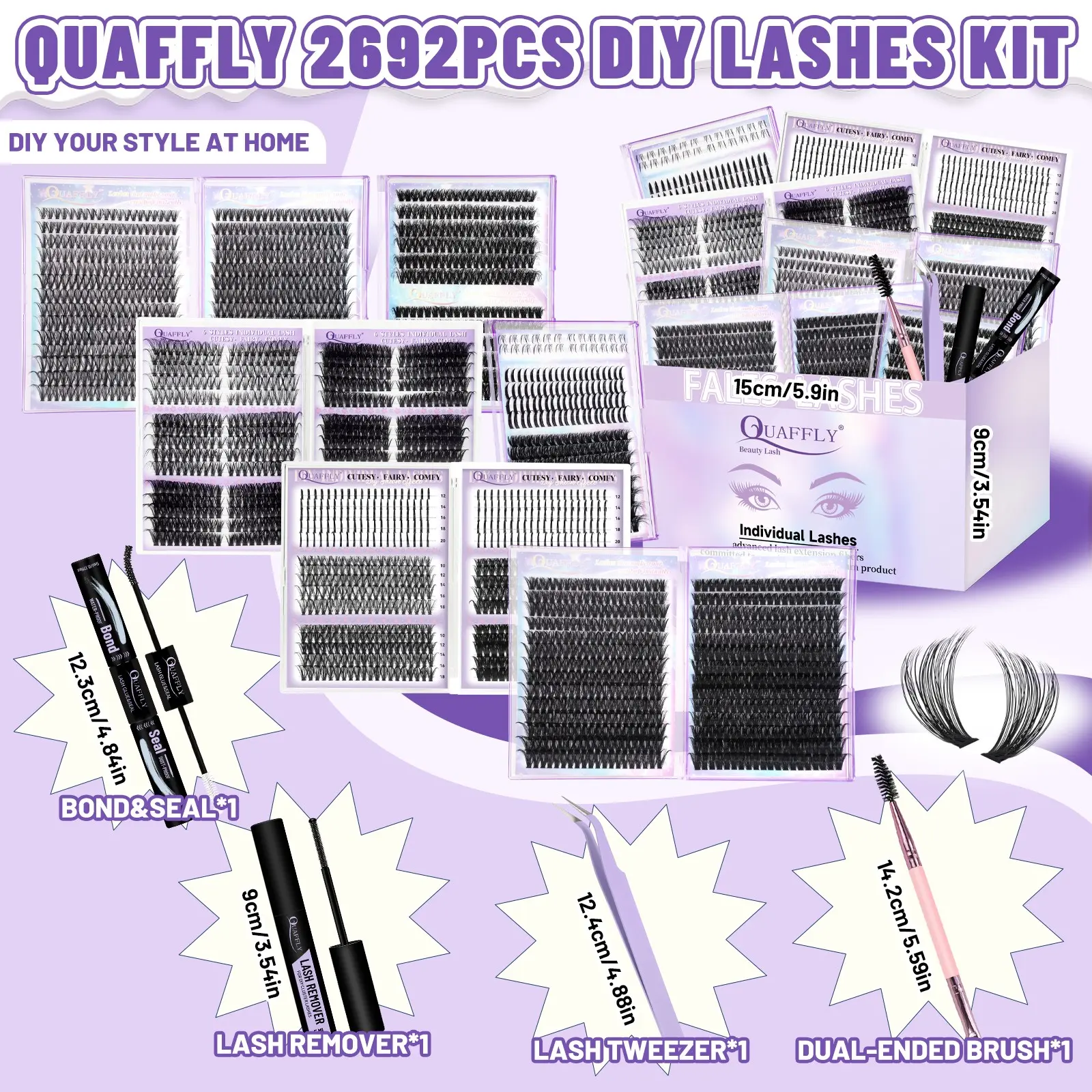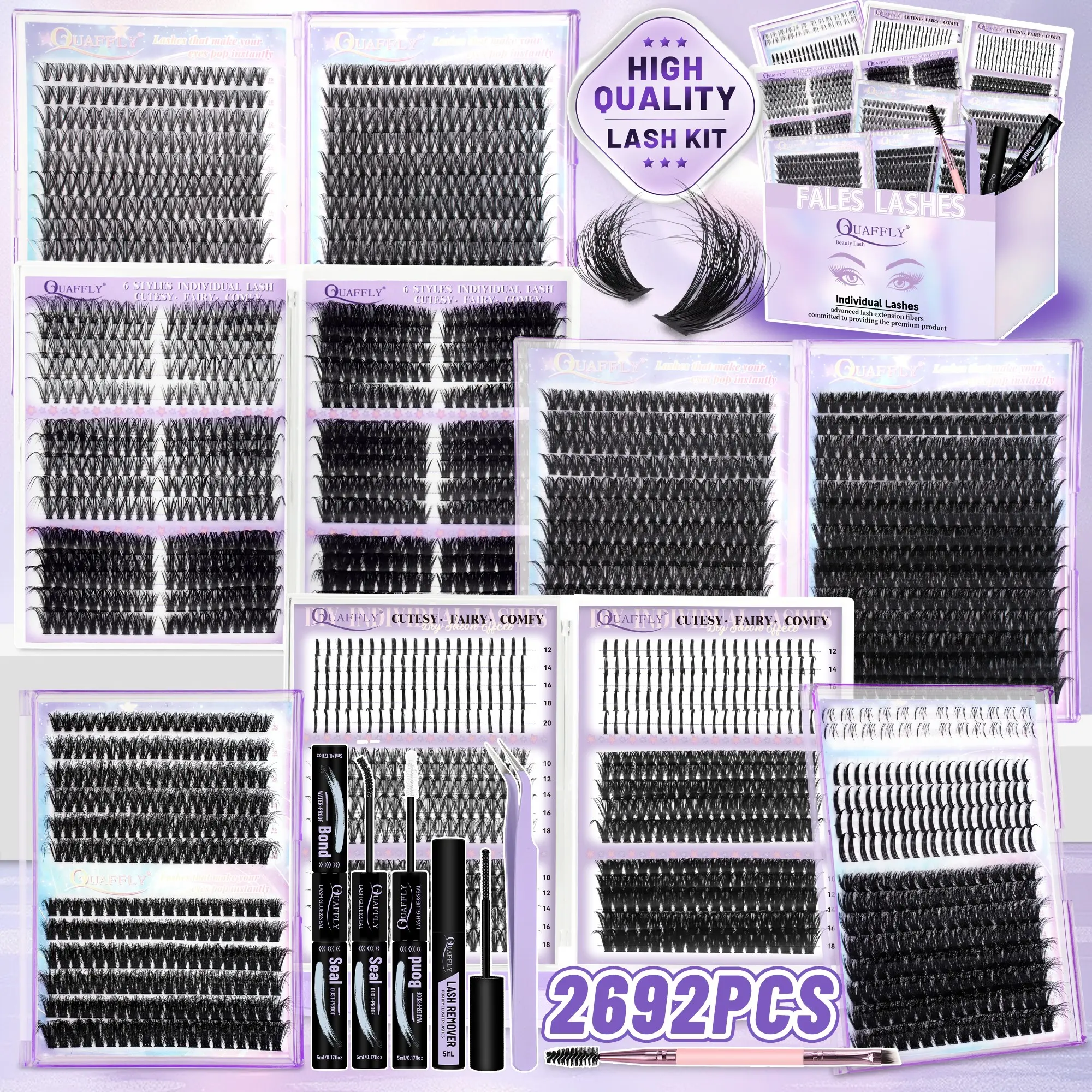 5. QUAFFLY Mega Lash Clusters Kit 2692Pcs, Makeup Eyelashes Extension 10 Trays Variety Pack Eyelash Clusters Extensions, Includes Volume/Wispy/Spikes/Bottom Lashes, DIY At Home Lash Extension Kit with Lash Bond&Seal Remover Tweezer Dual-Ended Brush