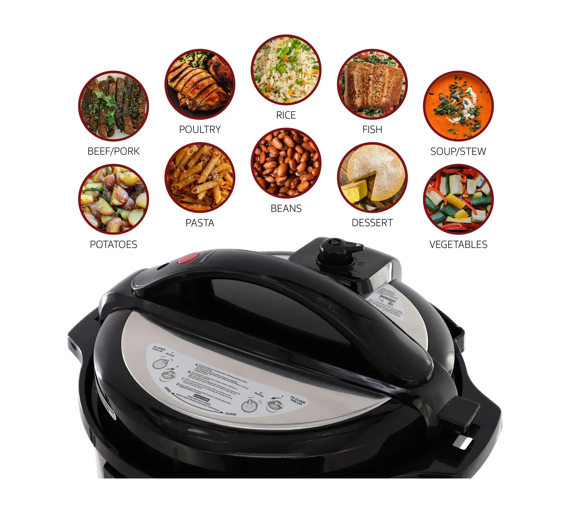 ·Includes 12-qt pressure cooker, tempered glass lid, measuring cup, paddle, drip catcher, user manual
