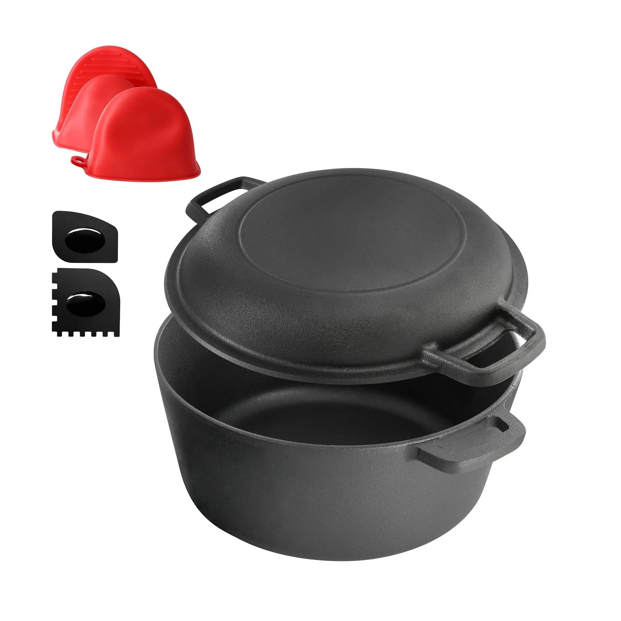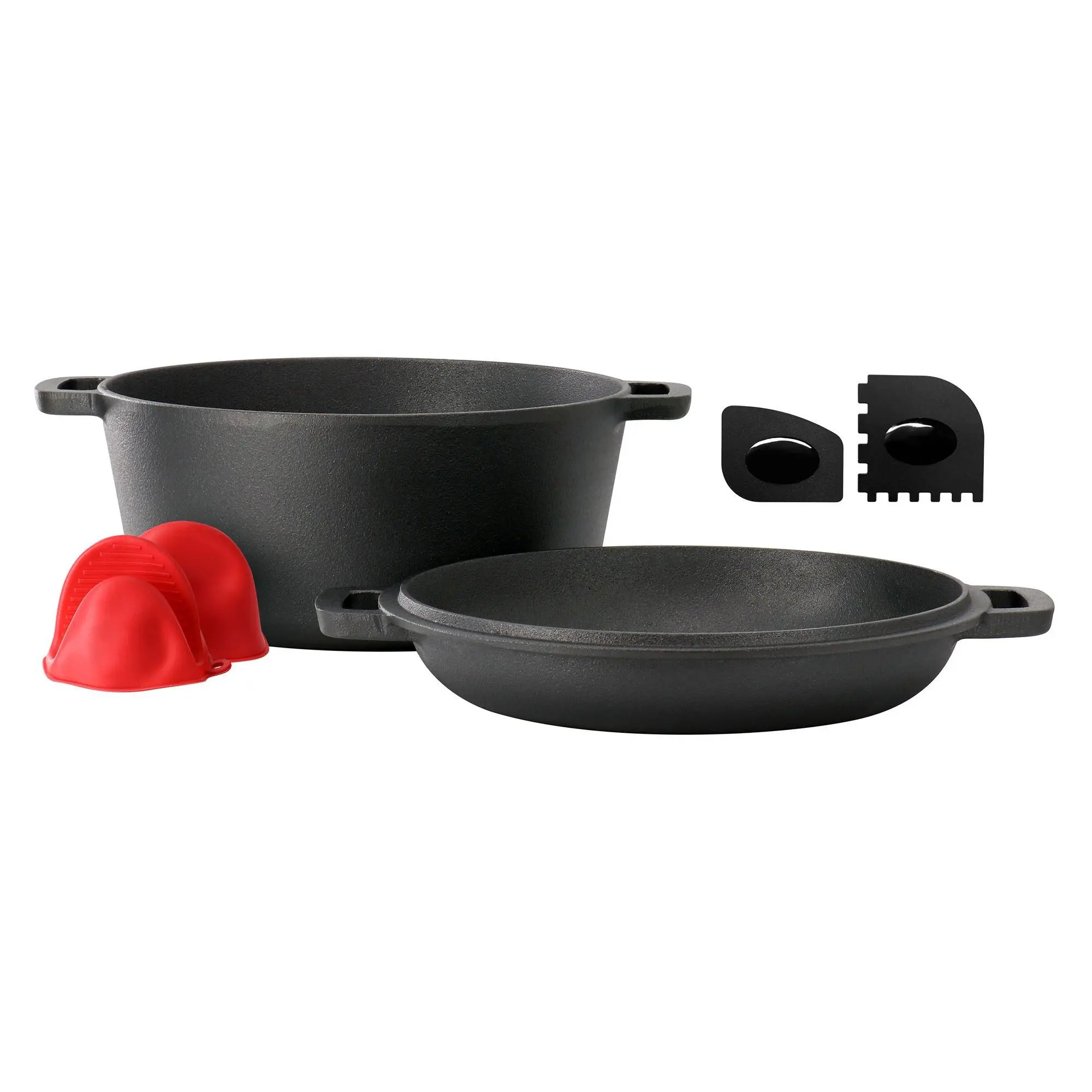 ·Includes 5 qt dutch oven, 9.5" lid/skillet, 2 silicone pot holders, 2 scrapers