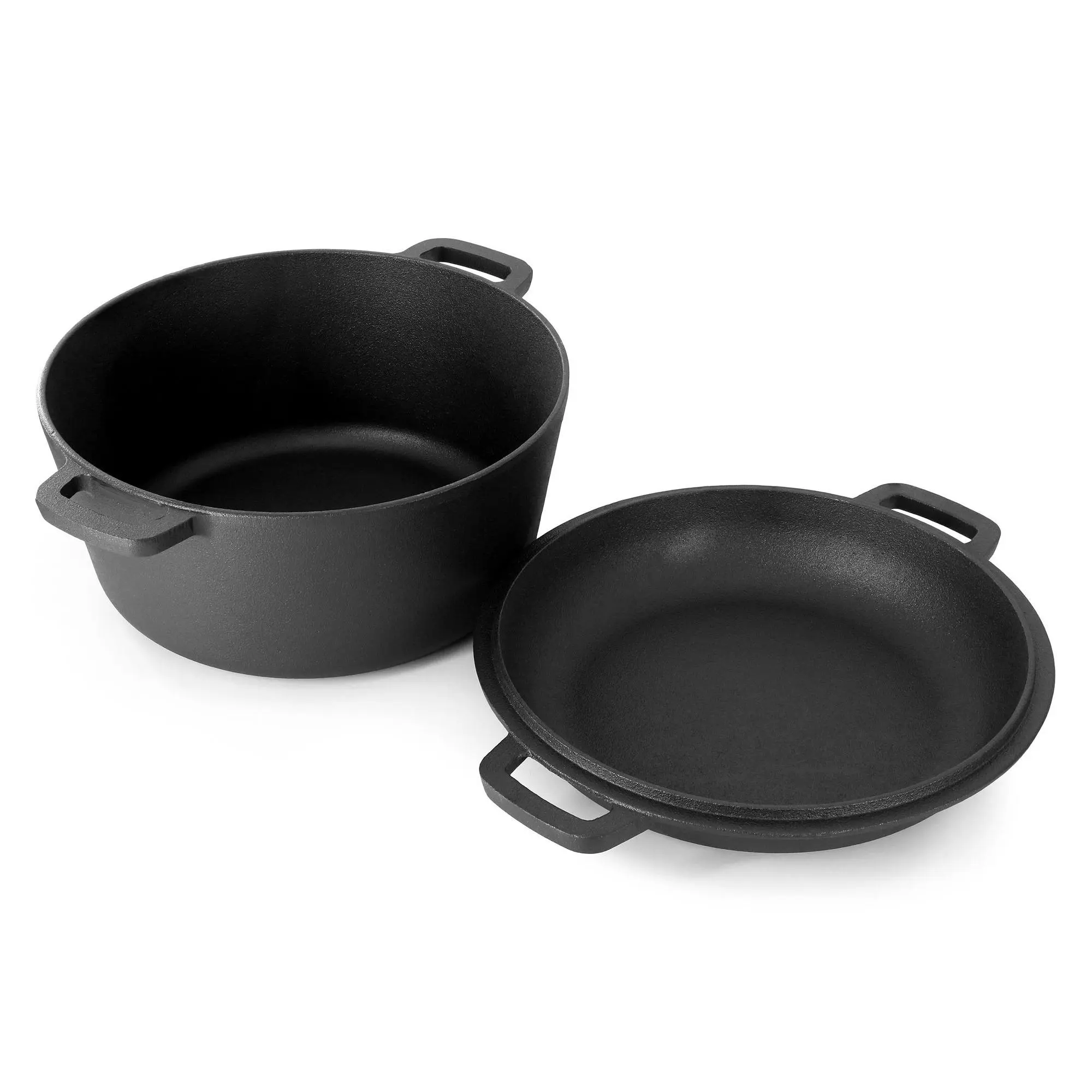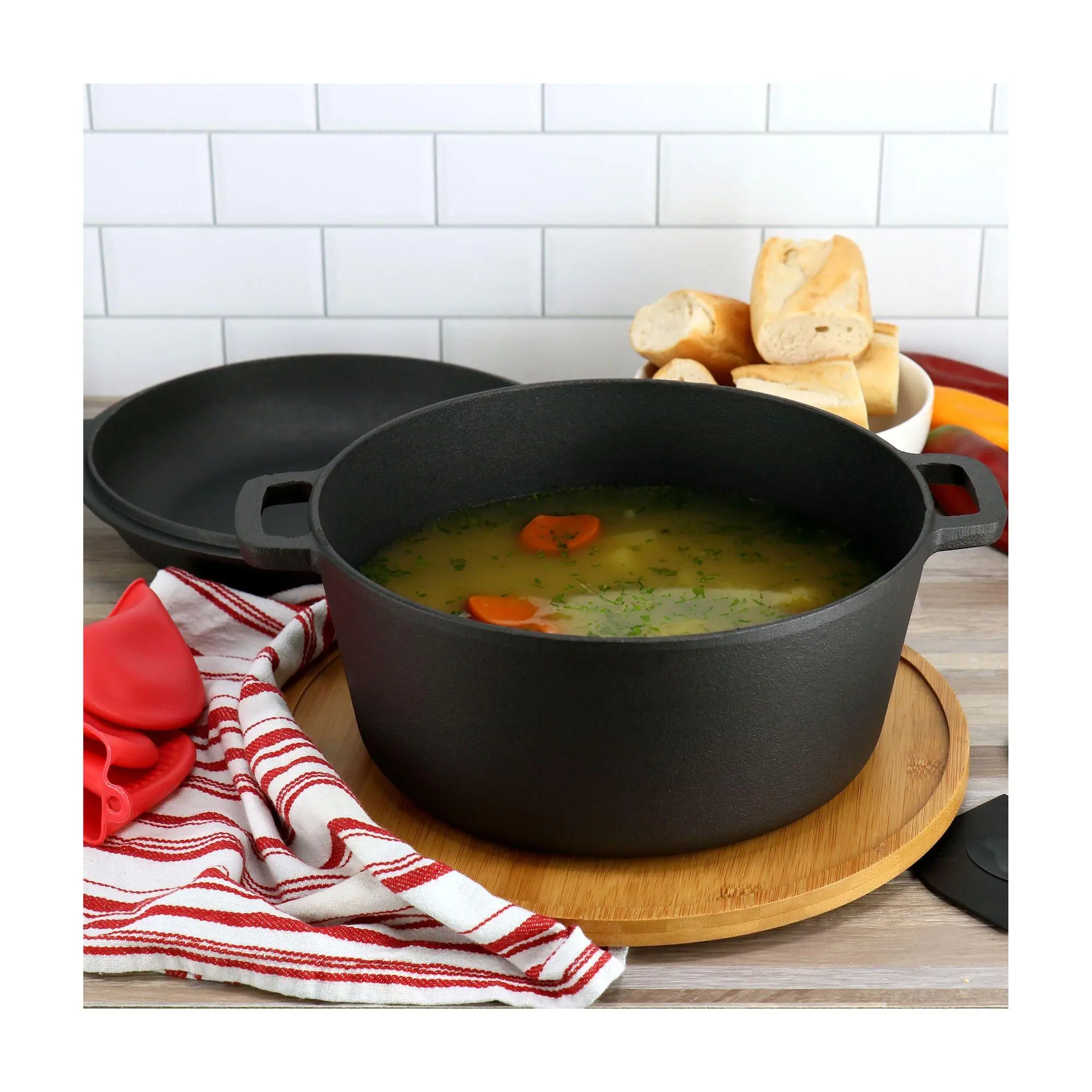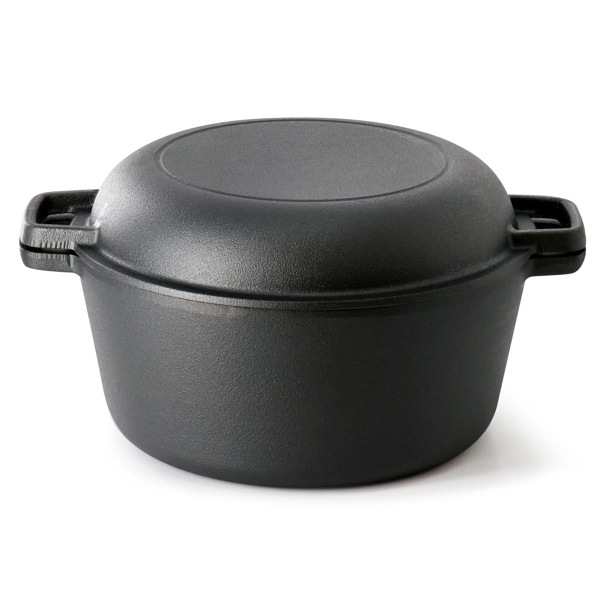 Transform your kitchen experience with the versatility of this MegaChef 5 Quart Pre-Seasoned 2-in-1 Cast Iron Dutch Oven and Skillet. Perfect for sauting, simmering, braising, baking, roasting, and frying, this set ensures even cooking both indoors and out. From MegaChef.
