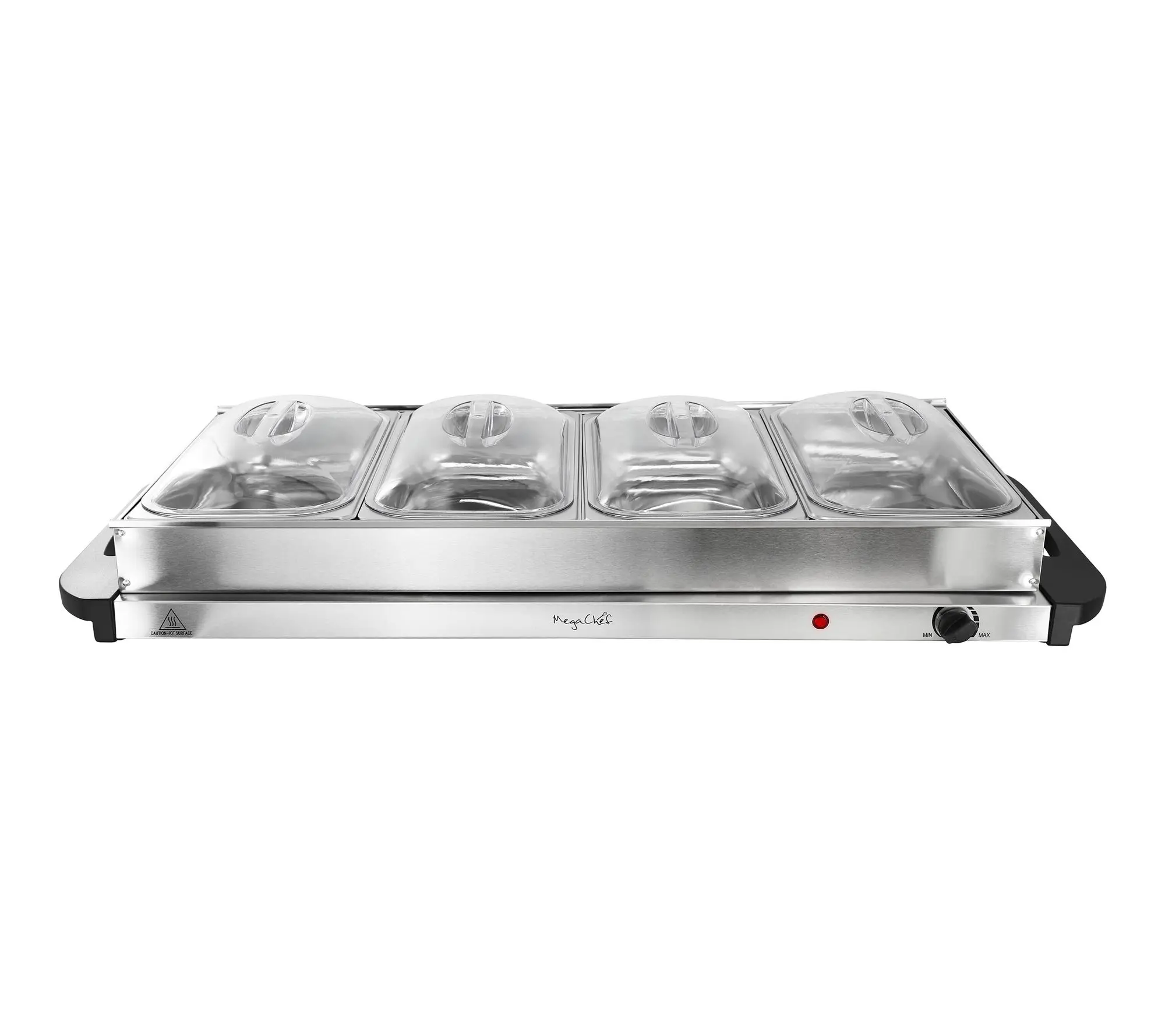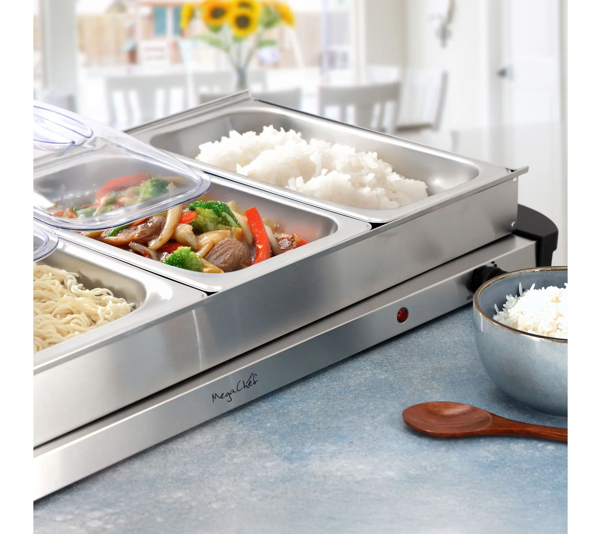 The MegaChef Buffet Server & Food Warmer With 4 Removable Sectional Trays , Heated Warming Tray and Removable Tray Frame is designed with you in mind. This ultimate party sidekick will make your guests feel as though they are being served a delicious hot meal at the most exclusive banquet. You will love the versatility of this wonderful buffet server at your next party or gathering.