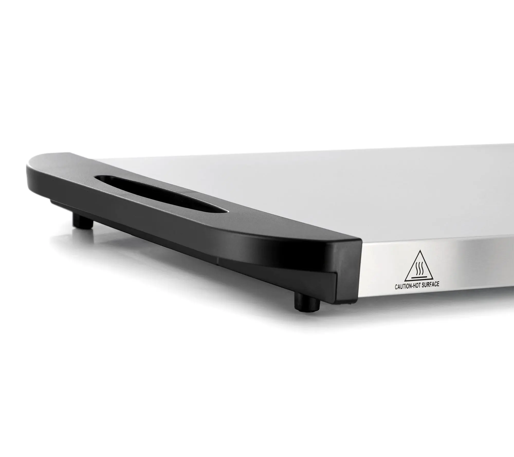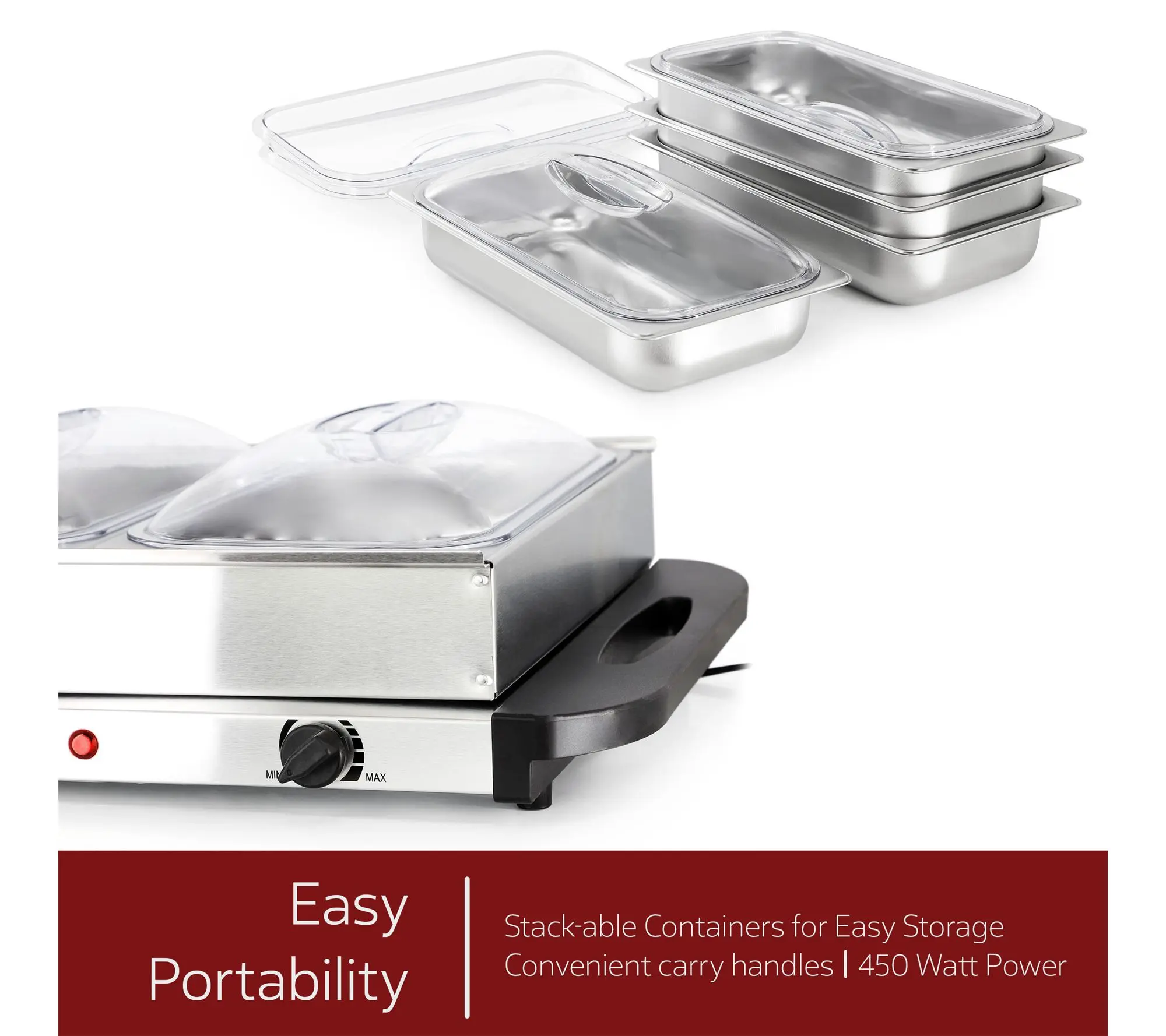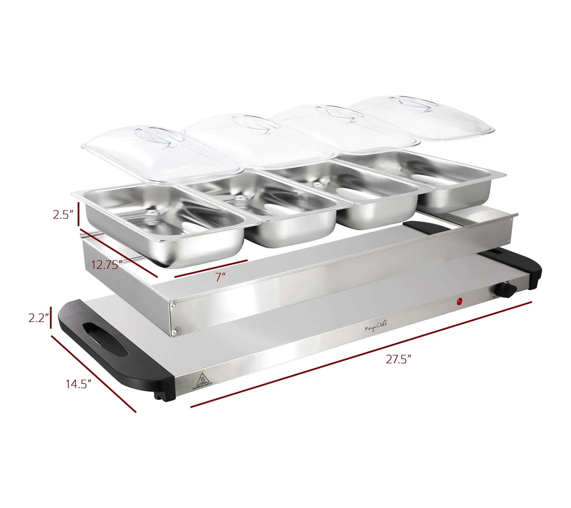 This large capacity buffet server and warming tray offer you the ability to serve food that may be warmed in the stainless steel containers or on the warming tray which is the base of the unit. The warming tray comes with hard mounted side handles to ensure that you can easily transport your buffet server from one location to another without worry. This lightweight and compact portable food warmer is safe to use on your kitchen counters or serving tables.