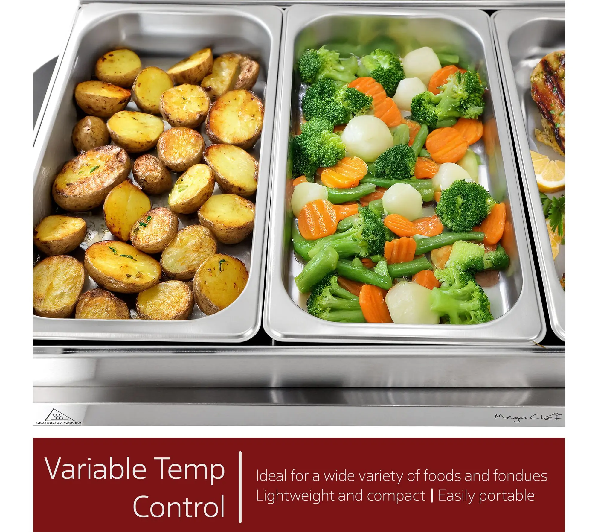 Having quality stainless steel containers to serve your meals in will give you piece of mind, and you'll need not worry about leaving these containers in the sink overnight! MegaChef understands that you have a variety of surfaces on which meals may be served, for added protection this unit features 4 bottom legs which provide spacing between your surfaces and the buffet server. In addition to the large capacity stainless steel food warming containers, you'll also have the option of using the base warming tray to keep sauces, appetizers and much more warmed up for your guests by using the large base warming tray. All in all, this unit will have you covered from the beginning of your party to the very end!