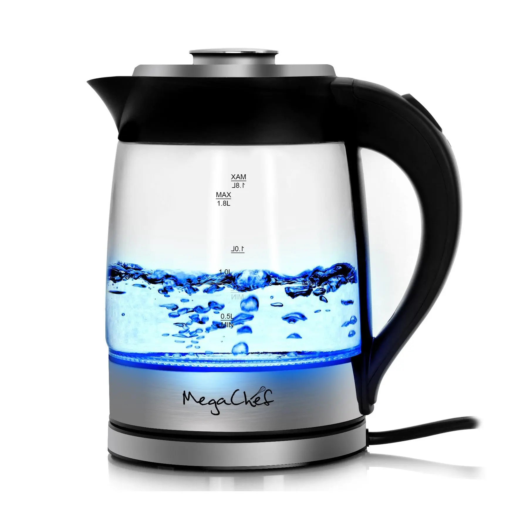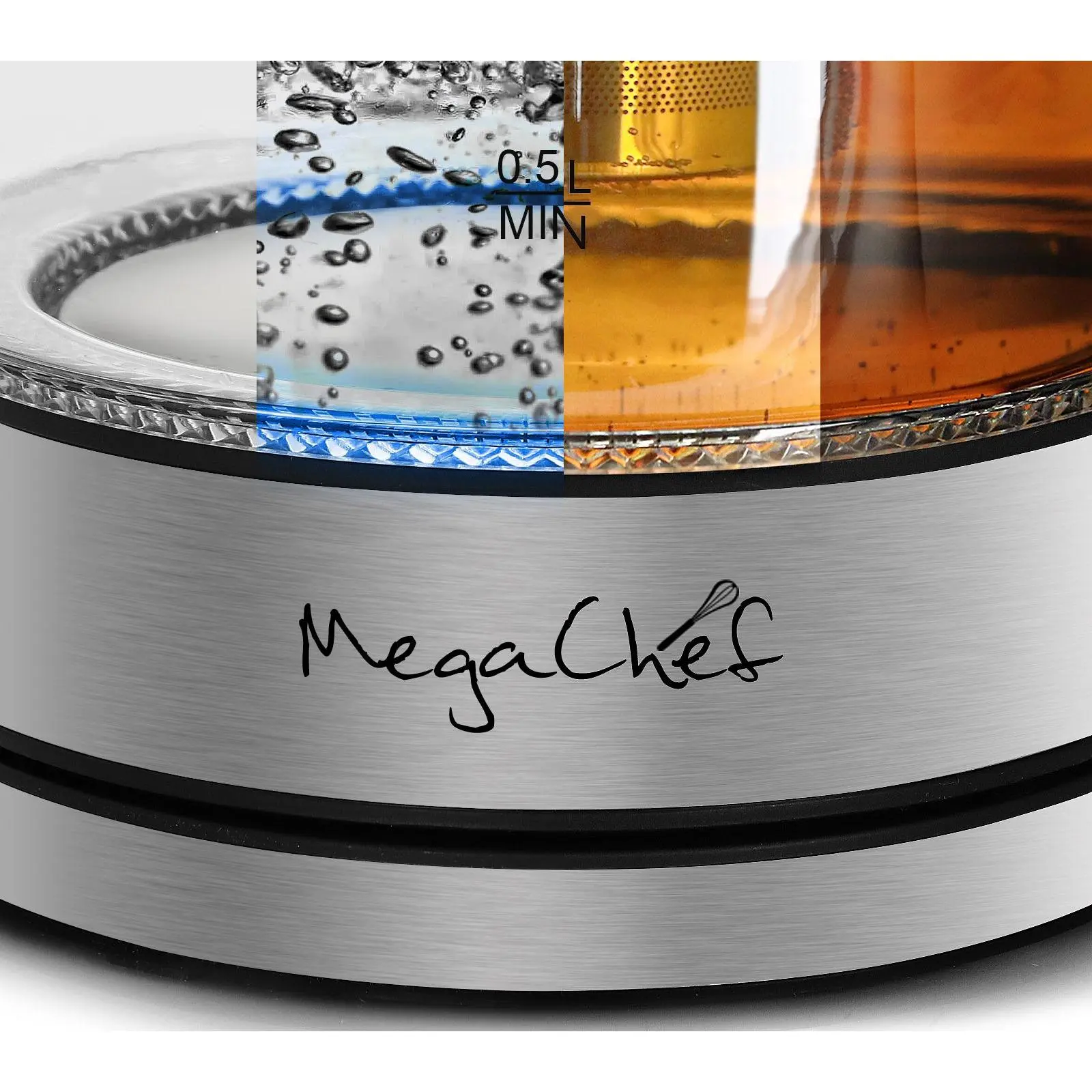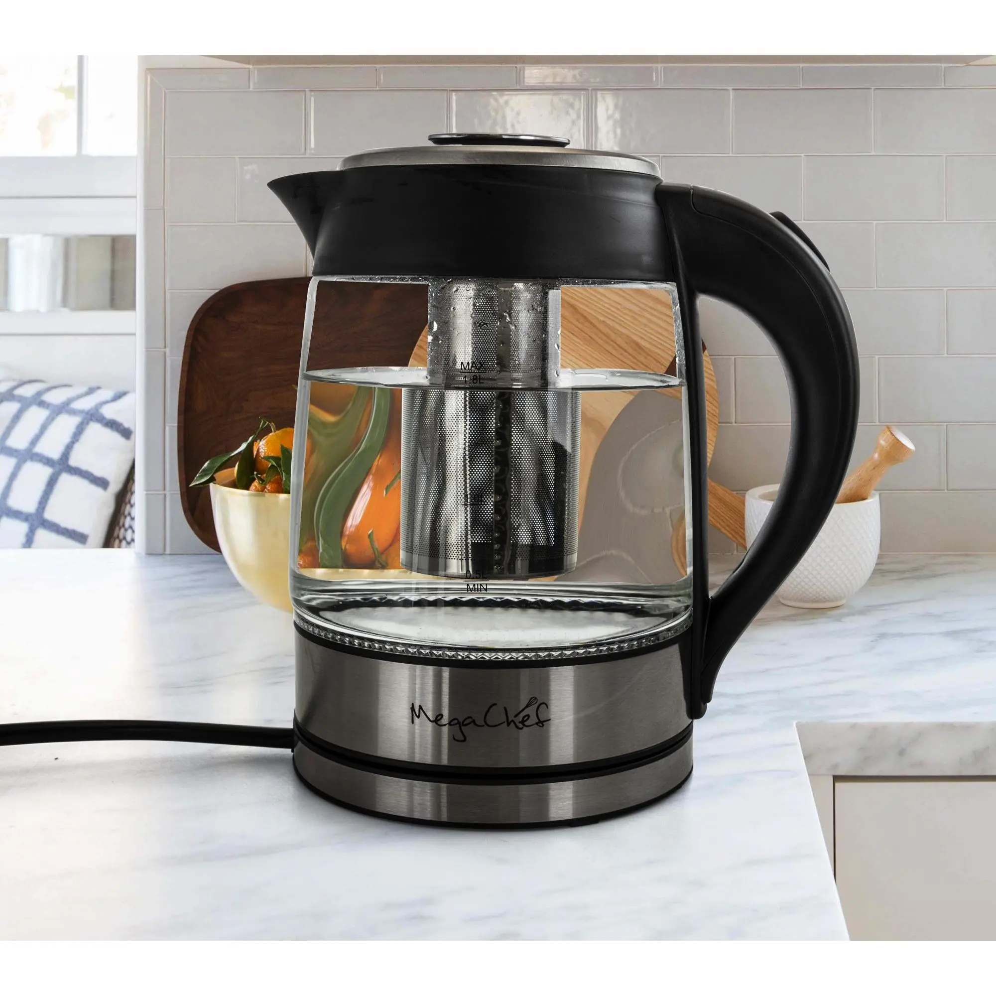 Sleek and style-rich, this glass and stainless steel tea kettle with a tea infuser is at the ready for all your favorite hot beverages. From MegaChef.