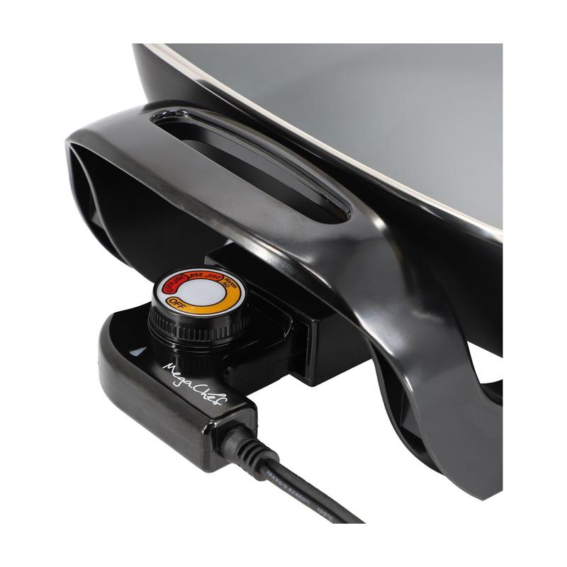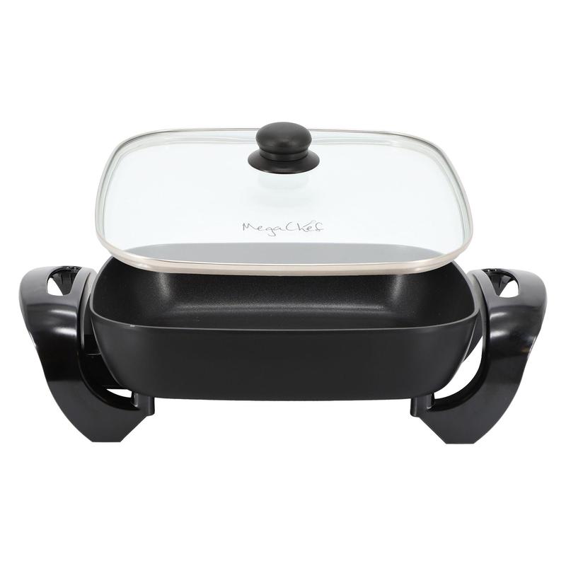 Make mealtime a breeze with the MegaChef electric skillet. Perfect for whipping up quick weeknight dinners or hosting a family gathering, its spacious 11.81" cooking surface effortlessly handles large meals. This kitchen essential features a die-cast aluminum pan and a two-layer non-stick coating for optimal heat distribution and easy cleanup. The heat-resistant Bakelite handles ensure safe handling, while the tempered glass lid retains heat and moisture, allowing you to monitor your cooking. From MegaChef.