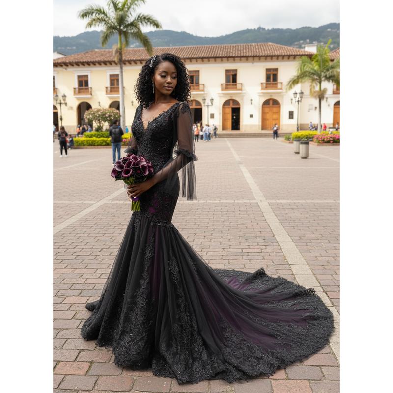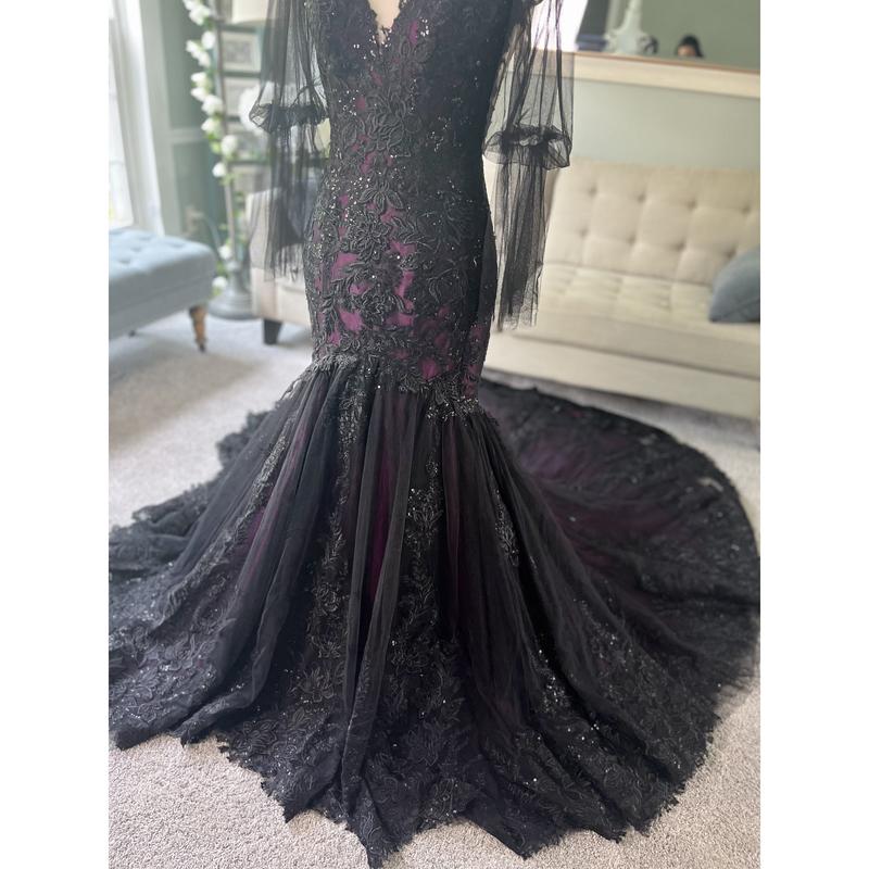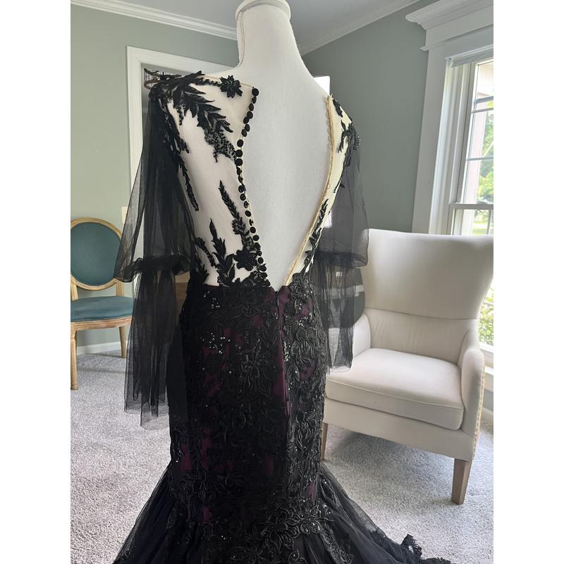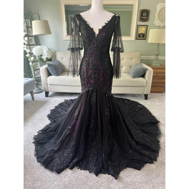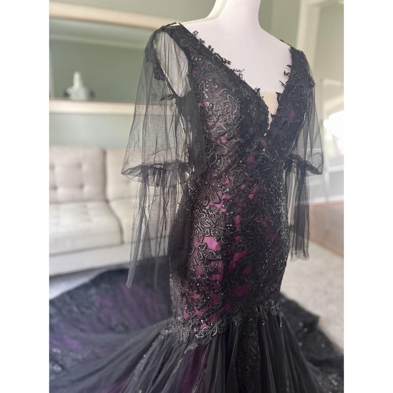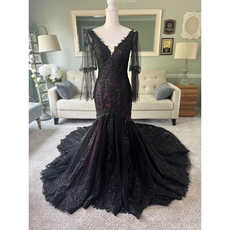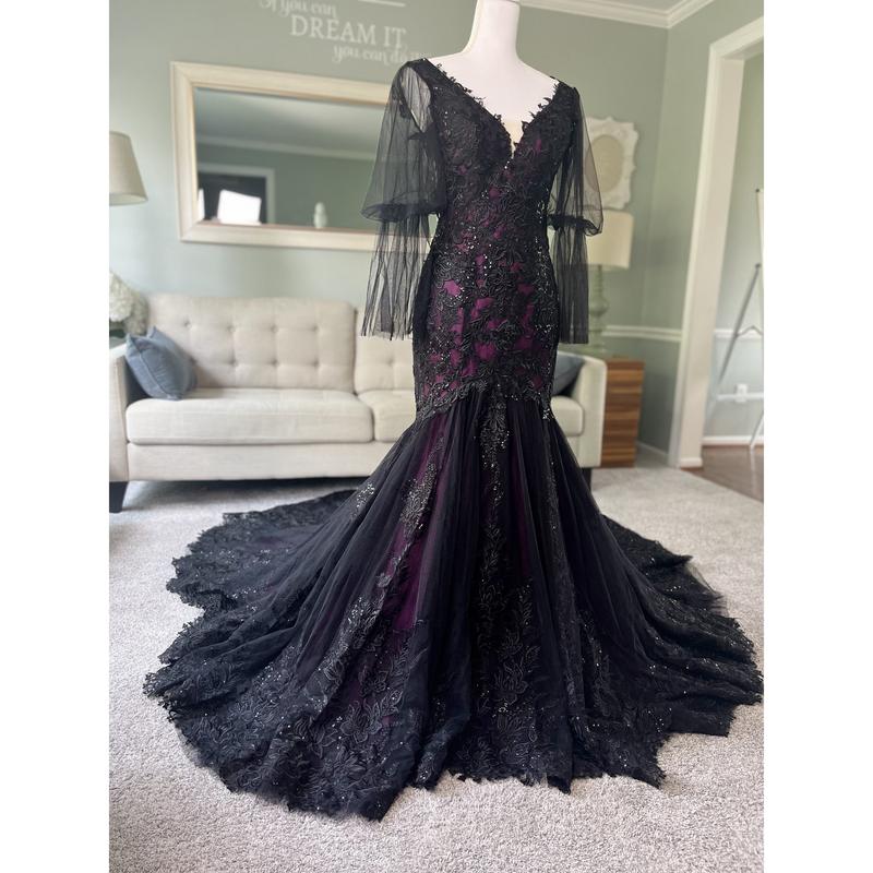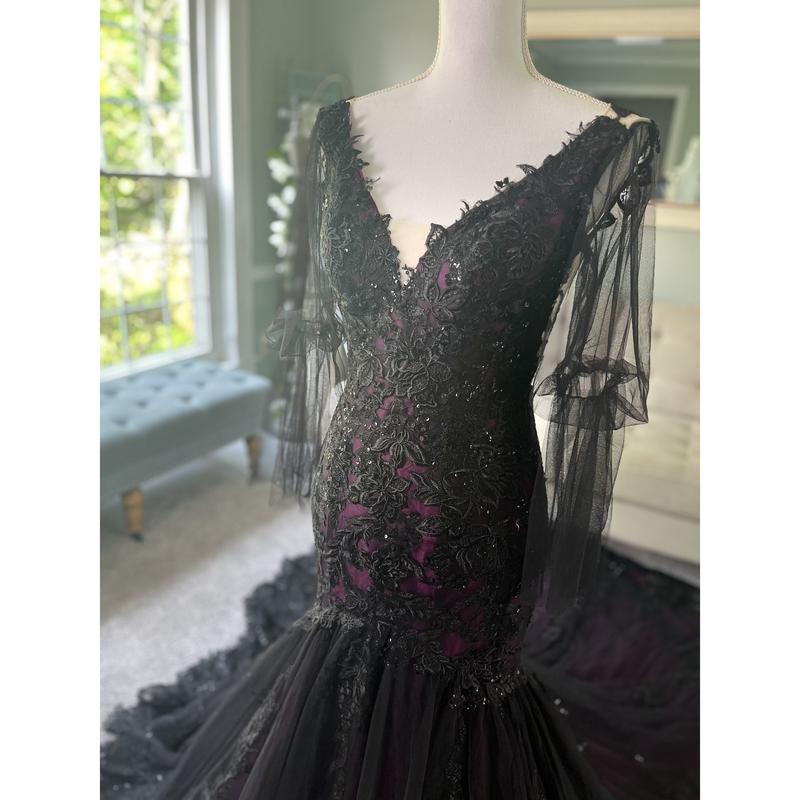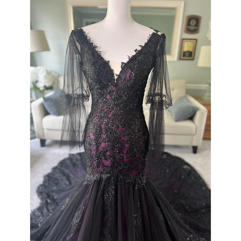 Our Megan Black and Purple Wedding Dress is another version of our black/purple best-seller. In this version, we changed the neckline into a V shape, added long tulle sleeves and the illusion back is still the same ( Couldn't button it because the mannequin is of a different size than the dress ).