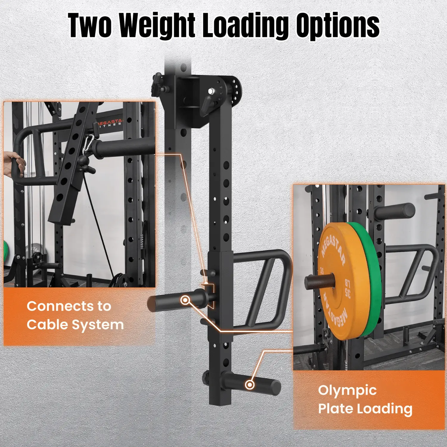 Connect to your rack’s cable system or load with 2" Olympic plates on the pegs; switch in seconds.