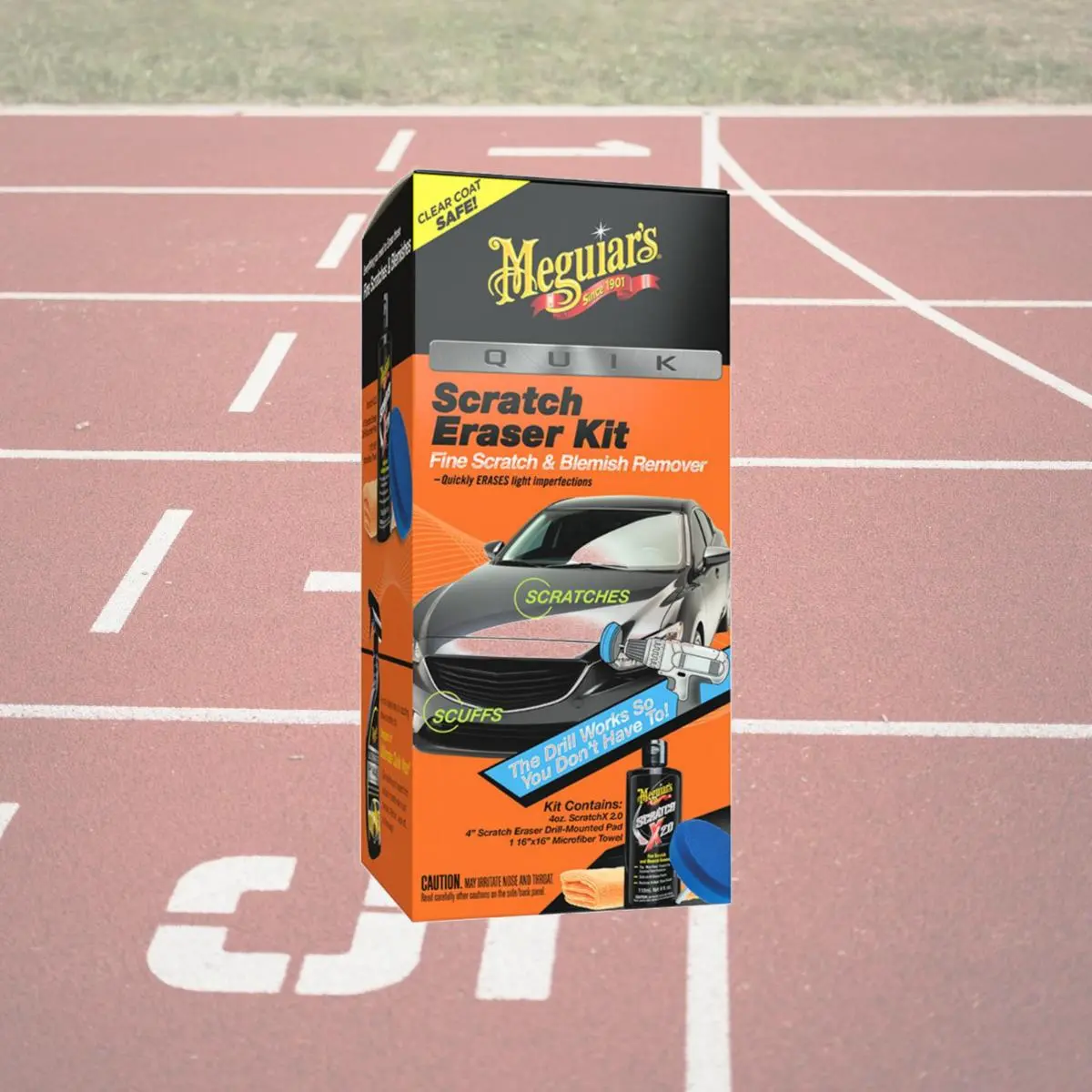 Quik Scratch Eraser Kit. If you have light scratches and scuffs but don’t want to work by hand there’s now a great solution with Meguiar’s Quik Scratch Eraser Kit. This kit includes everything you need to remove light imperfections quickly and easily. The kit comes with Meguiar’s proprietary 4" Scratch Eraser Pad that attaches to a standard household drill greatly reducing the time and effort it takes to remove light defects when used with Meguiar’s ScratchX 2.0, also included in the kit. Meguiar’s ScratchX 2.0 contains microscopic abrasives to quickly and safely erase blemishes like light scratches, scuff marks, paint transfer, fingernail marks around door handles, light defects and more. The last component in the kit is a premium microfiber towel to safely and gently remove the ScratchX 2.0 and bring up a brilliant shine. So, if you have fine scratches and blemishes let the drill do the work and erase them with Meguiar’s Quik Scratch Eraser Kit. Features Minimal effort erase fine scratches & remove paint blemishes quickly and with minimal effort. erase scratches & scuffs use the power of your drill to quickly erase light scratches, scuffs, paint transfer & more. drill activated with scratch eraser pad & scratchx 2.0, the drill works, so you don't have to. all in one kit kit includes everything you need to quickly & safely remove fine scratches & blemishes. clear coat safe safe and effective on all glossy paints and clear coats. Erase fine scratches & remove paint blemishes quickly and with minimal effort. Use the power of your drill to quickly erase light scratches, scuffs, paint transfer & more. With Scratch Eraser Pad & ScratchX 2.0, the drill works, so you don't have to. Kit includes everything you need to quickly & safely remove fine scratches & blemishes. Safe and effective on all glossy paints and clear coats. Specifications Weight: 0.55 lbs.