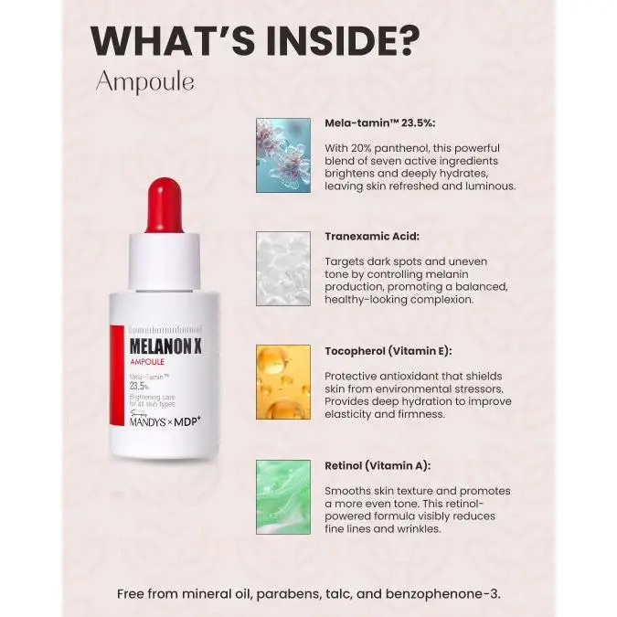 | Ingredients | Ampoule: Water, Panthenol, Butylene Glycol, Butyrospermum Parkii (Shea) Butter, Niacinamide, 1,2-Hexanediol, Methyl Gluceth-20, Glycerin, Prunus Mume Fruit Extract, Methyl Glucose Sesquistearate, Pyrus Malus (Apple) Fruit Extract, Carica Papaya (Papaya) Fruit Extract, Vitis Vinifera (Grape) Fruit Extract, Propanediol, Cetearyl Olivate, Sorbitan Olivate, Caprylic/Capric Triglyceride, Carbomer, Caprylyl Glycol, Inulin Lauryl Carbamate, Tromethamine, Lavandula Angustifolia (Lavender) Flower Extract, Chamomilla Recutita (Matricaria) Flower Extract, Borago Officinalis Extract, Centaurea Cyanus Flower Extract, Alpha-Arbutin, Salvia Sclarea (Clary) Extract, Hyacinthus Orientalis (Hyacinth) Extract, Hippophae Rhamnoides Water, Hippophae Rhamnoides Fruit Extract, Adenosine, Lactobacillus Ferment, Xanthan Gum, Disodium EDTA, Elaeis Guineensis (Palm) Oil, Hydrogenated Lecithin, Calcium Pantothenate, Maltodextrin, Sodium Starch Octenylsuccinate, Garcinia Cambogia Fruit Extract, Glutathione, Camellia Japonica Flower Extract, Alteromonas Ferment Extract, Phenethyl Alcohol, Hydrolyzed Sponge, Artemisia Annua Extract, Pentylene Glycol, Citrus Unshiu Peel Extract, Sodium Ascorbyl Phosphate, Sodium Hyaluronate, Hydrolyzed Hyaluronic Acid, Hyaluronic Acid, Tocopheryl Acetate, Pyridoxine HCl, Ethylhexylglycerin, Sucrose Palmitate, Ascorbic Acid, Tocopherol, Menadione, Polyglyceryl-4 Oleate, Linoleic Acid, Retinyl Palmitate, Arachis Hypogaea (Peanut) Oil, Sodium Phosphate, Linolenic Acid, Lecithin, Retinal, Silica, Tranexamic Acid, Rosmarinus Officinalis (Rosemary) Leaf Extract, Acetyl Hexapeptide-8, Helianthus Annuus (Sunflower) Seed Oil, sh-Oligopeptide-1, sh-Oligopeptide-2, sh-Polypeptide-1, sh- Polypeptide-10, sh-Polypeptide-60, Citrus Limon (Lemon) Peel Oil, Limonene, Citral, Hexyl Cinnamal, Linalool, Benzyl Salicylate |