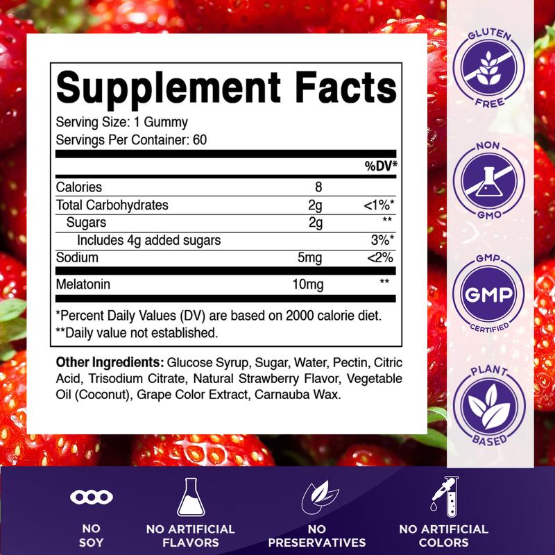 Contains melatonin, glucose syrup, sugar, pectin, citric acid, sodium citrate, natural blackberry flavor, purple carrot juice concentrate, and vegetable oil. Take 1 gummy daily or as directed by your healthcare provider. Enjoy the most pleasant tasting formula today!