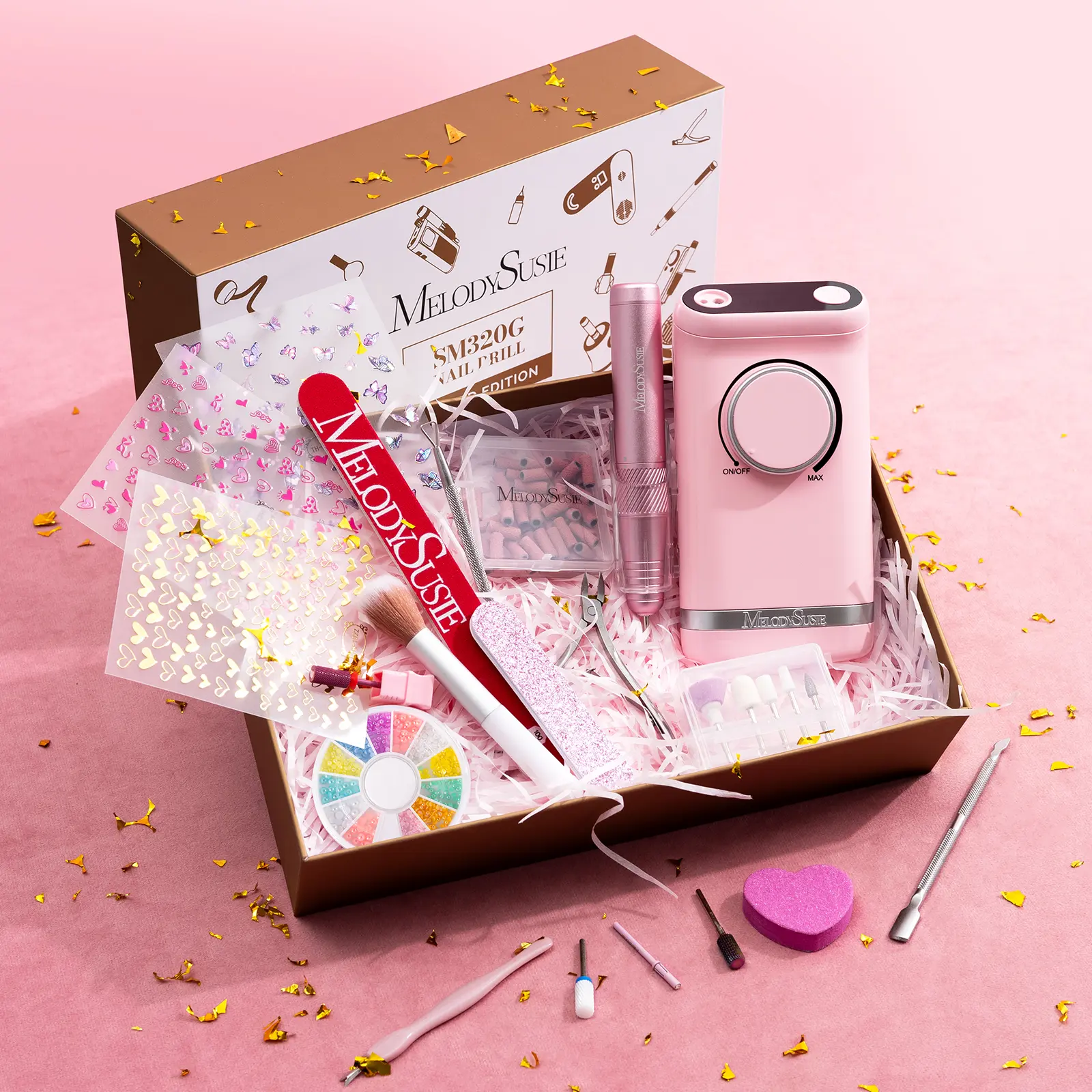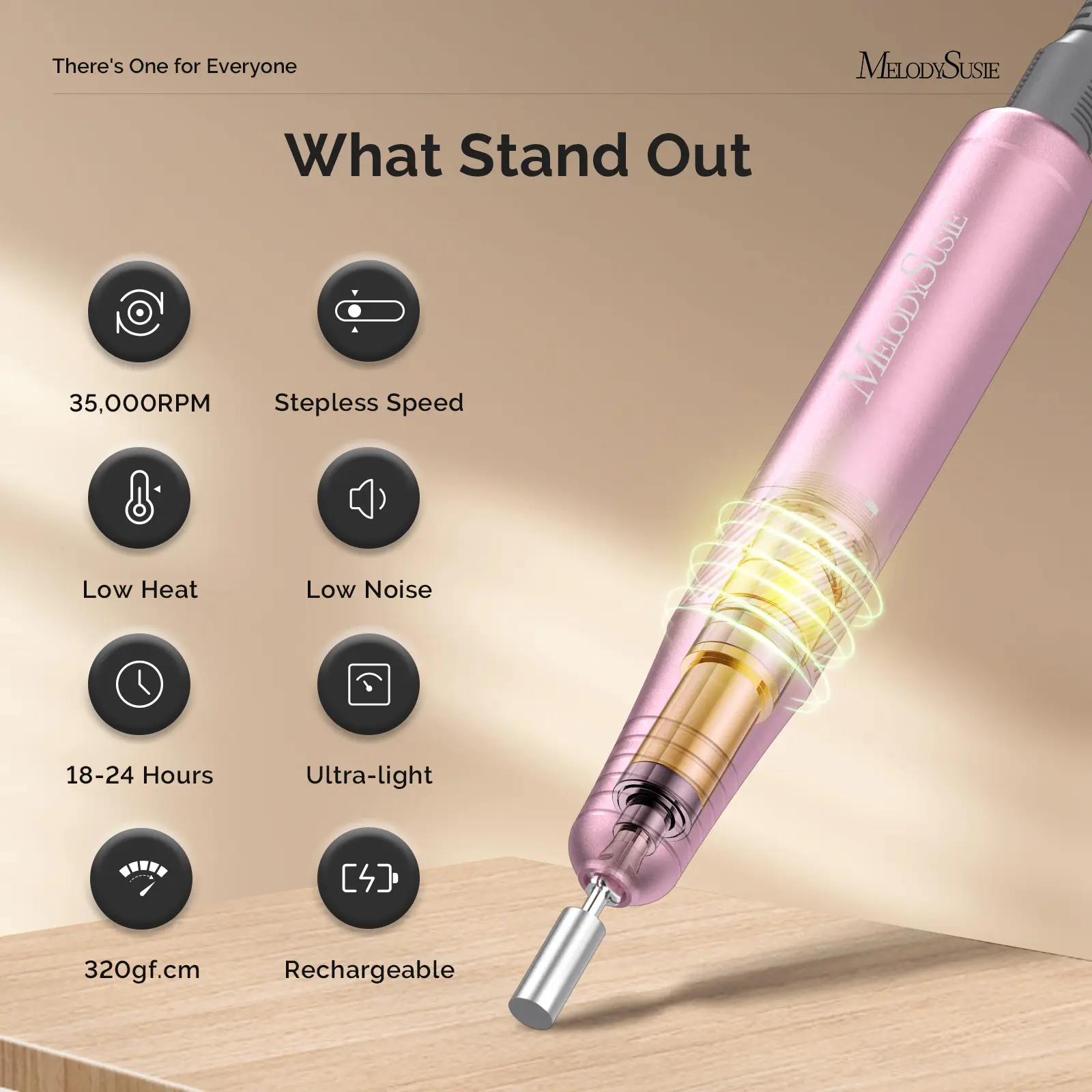 The MelodySusie SM320G is a 35000RPM professional rechargeable electric nail file. Perfect for acrylic nails, gel polishing, and removing. Ideal for manicure salons, homes, and high-speed nail drills. This cordless e-file kit includes various tools for comprehensive nail care.