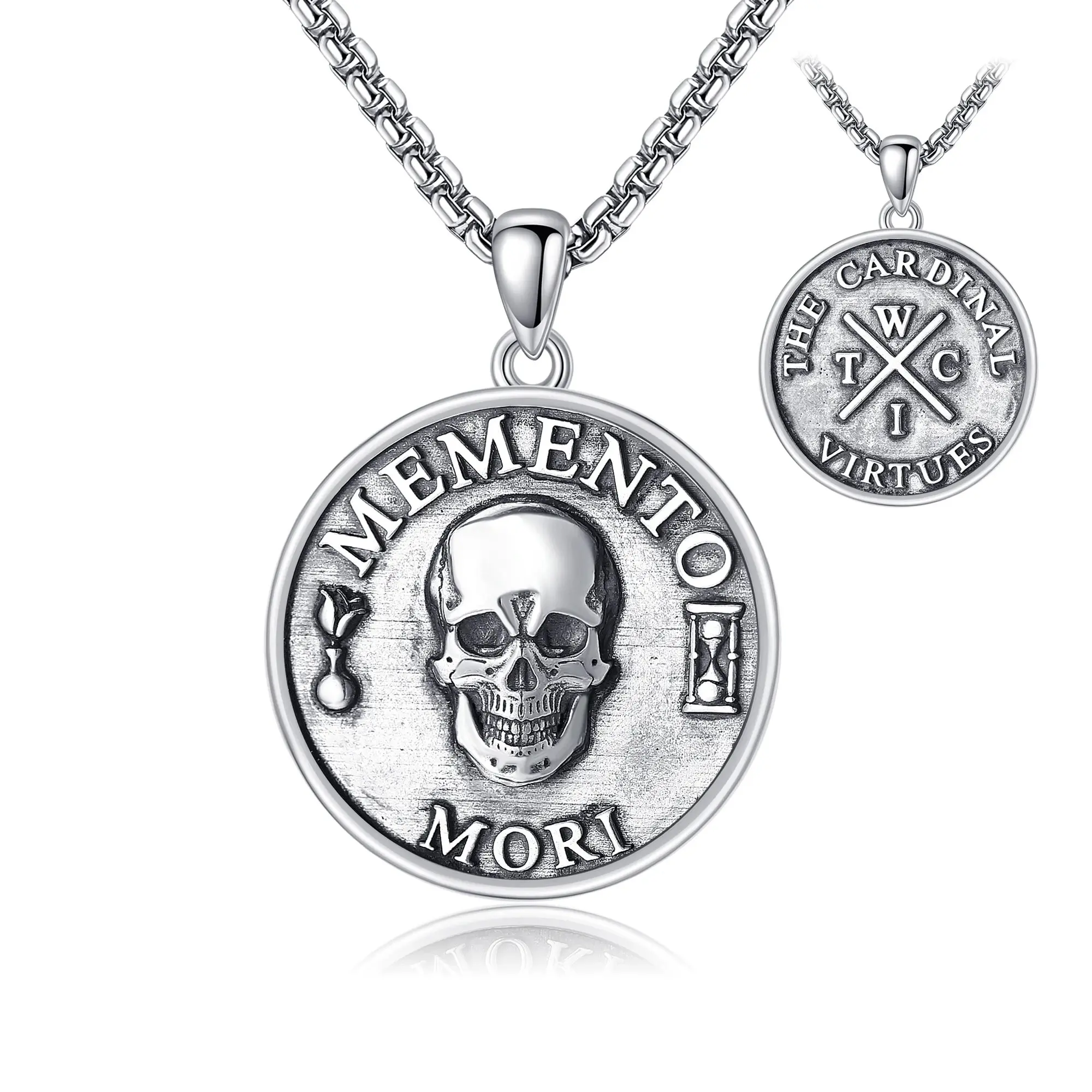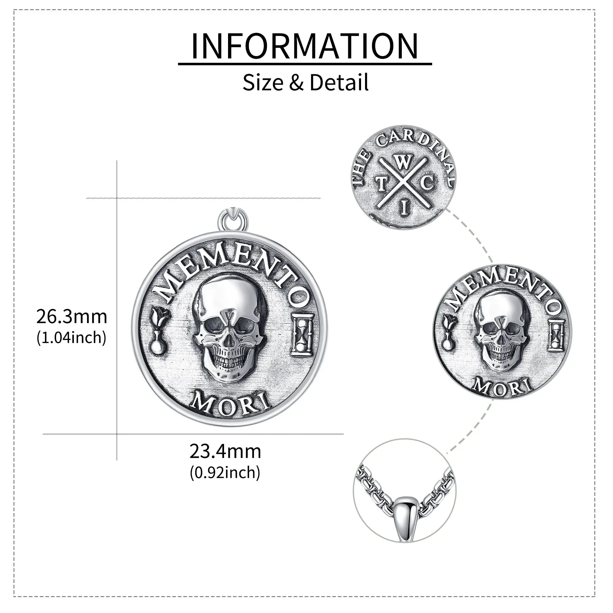 Size —— memento mori pendant size:26.3*23.4mm(0.92*1.04 inches).the chain length is made of Stainless steel, 22+2 inch,adjustable.