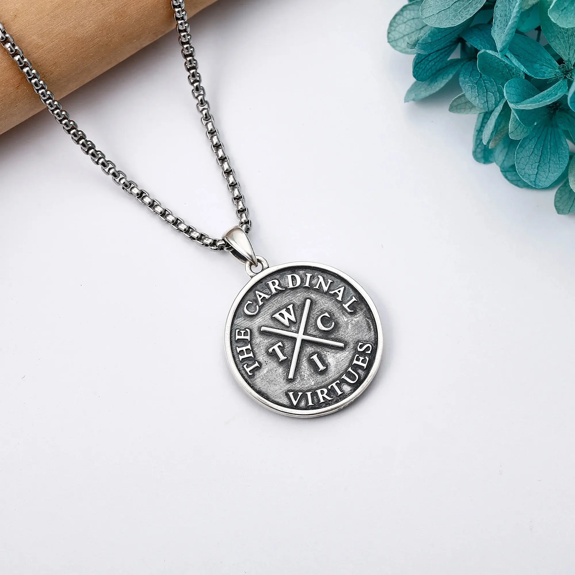 Design Meaning —— The reverse of the Stoic pendant shows the four cardinal virtues: wisdom, justice, courage, and temperance. momento mori pendant not only serves as a reminder, but it is a tool we use to return to the rhythm of nature and get us back on track when life throws us off track.