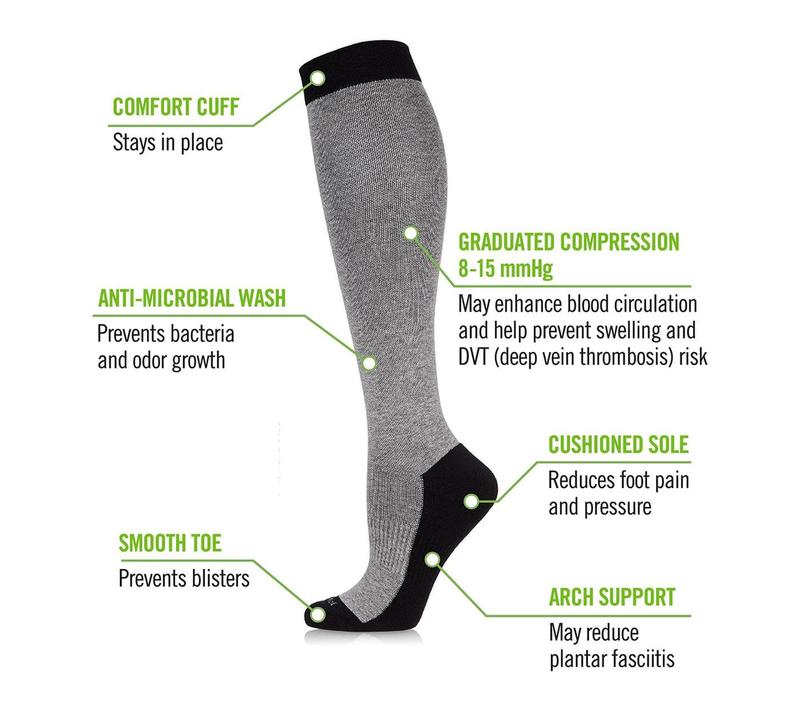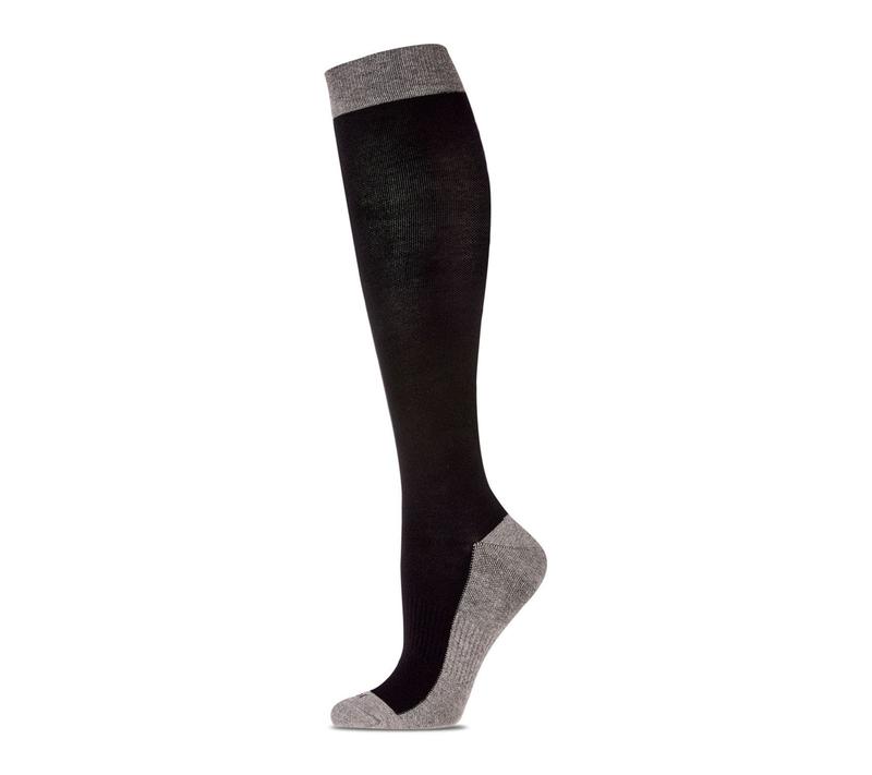 ·Features: moderate graduated compression, two-tone contrast, comfort cuff, non-slip fit, anti-microbial properties, smooth seamless toe, cushioned sole, stretchy knit