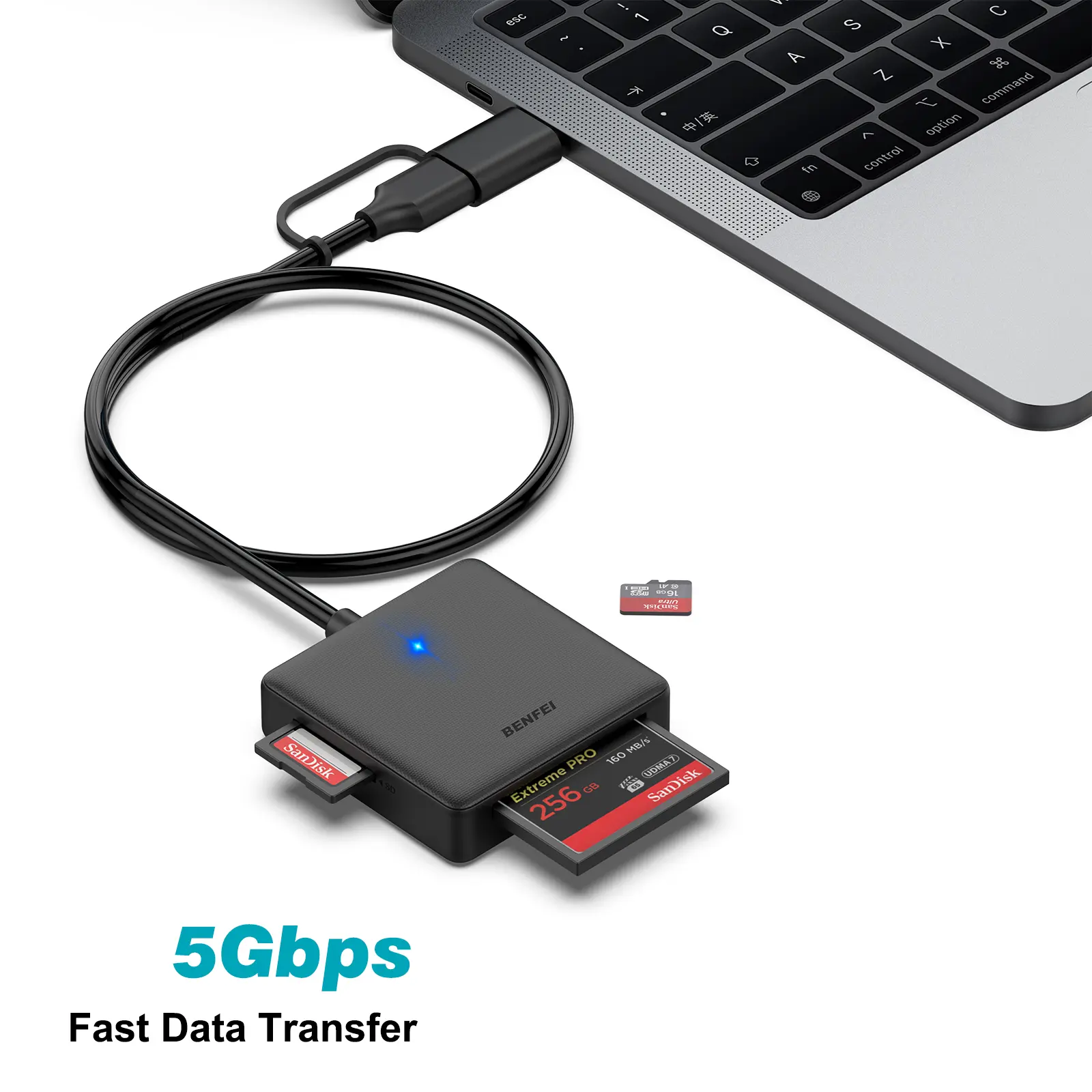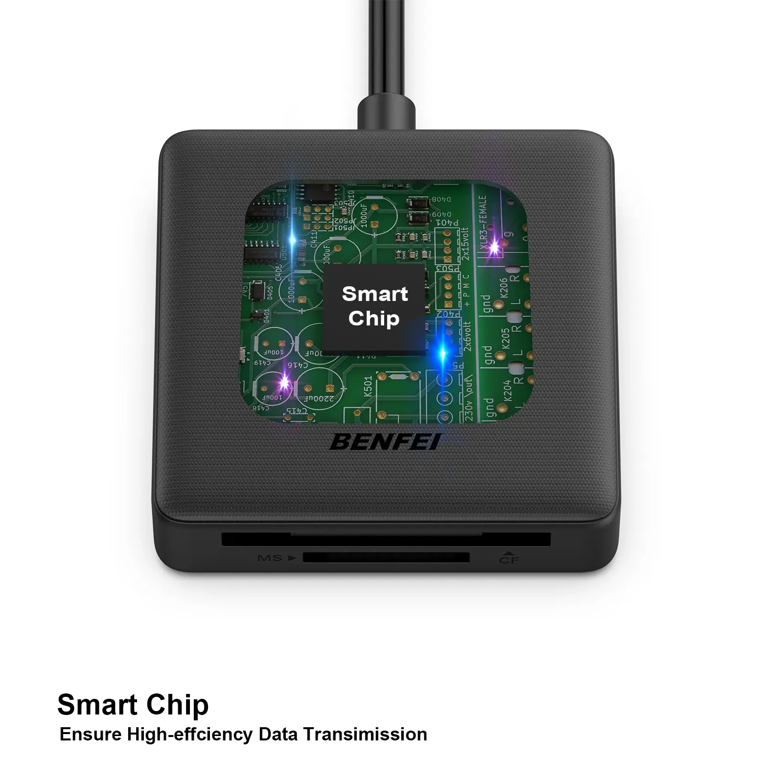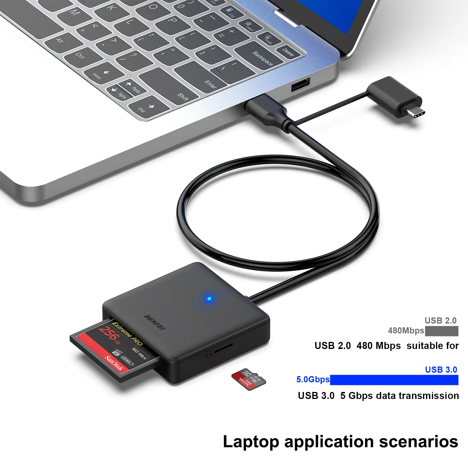 ·INTEGRATED DESIGN - The integrated-designed BENFEI USB-C/USB 3.0 card reader provide high data speed access to 4 different card type, the SD(Secure Digital), Micro SD(TF), MS(Memory Stick) and CF(Compact Flash). And with 2in1 USB-C/USB 3.0 design, BENFEI card reader could works with computer or laptop by USB 3.0/2.0 slot or the latest USB Type-C(Thunderbolt 3) slot. A universal card reader solution.