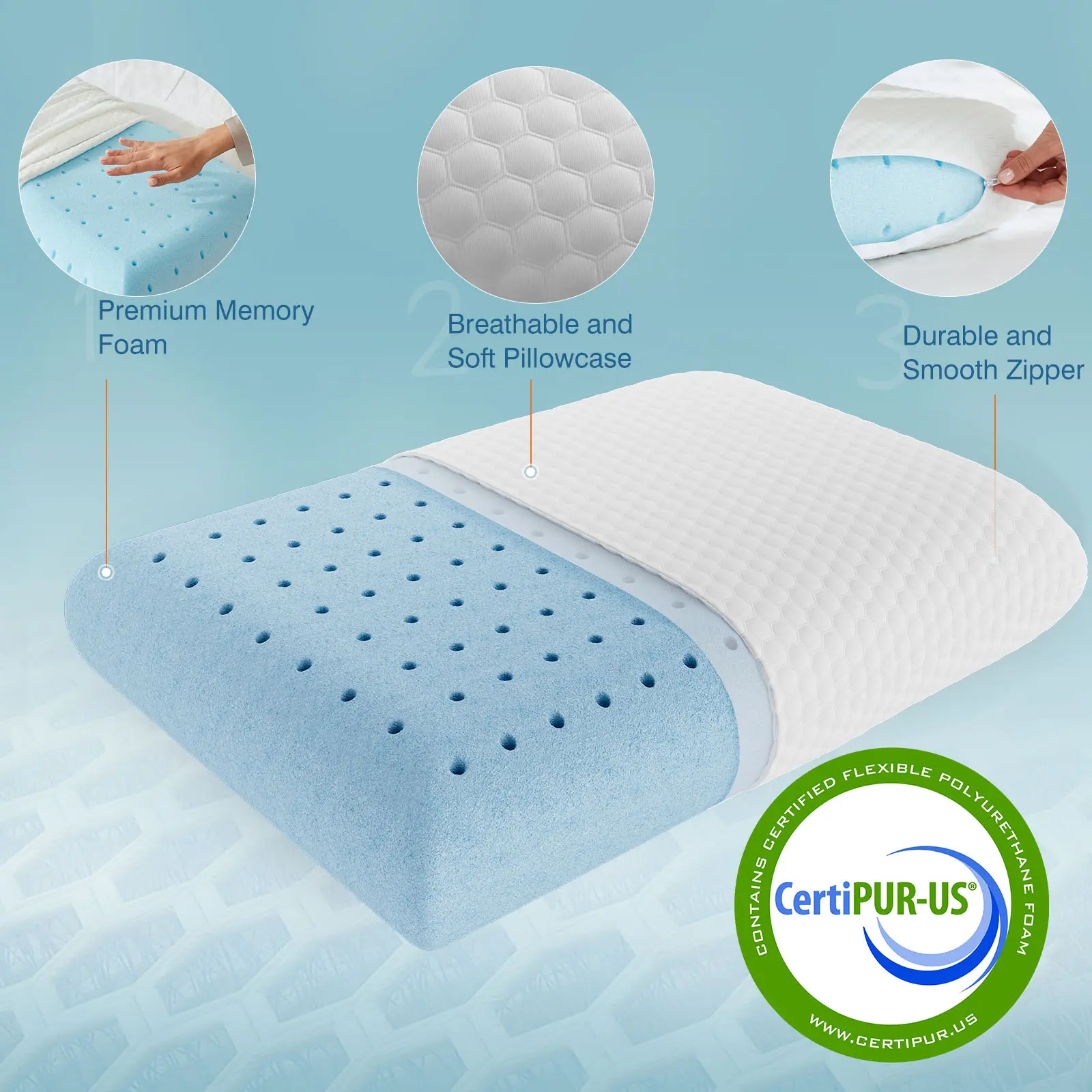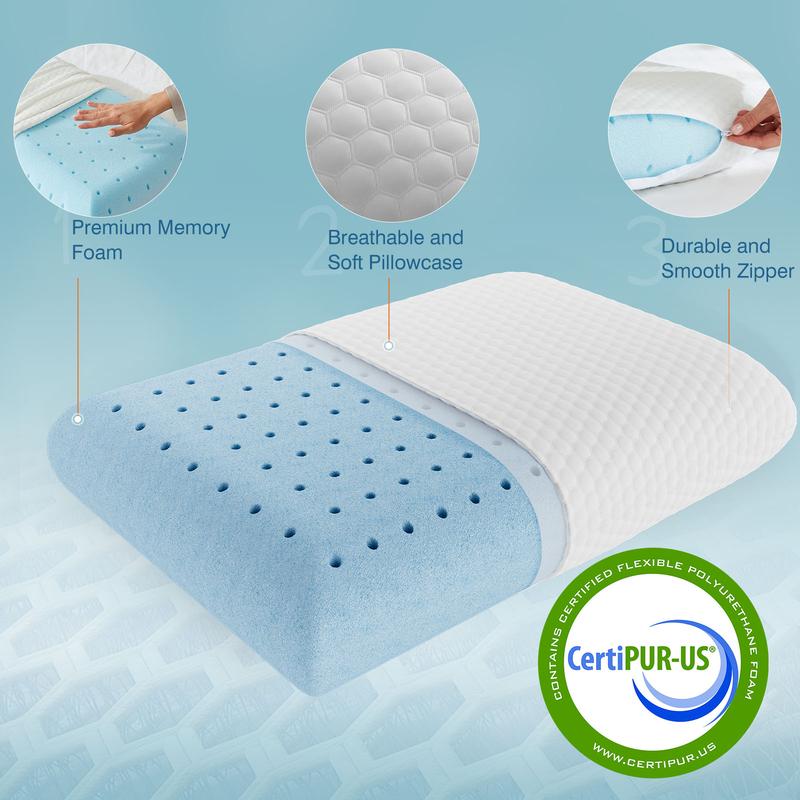 ·Contour Memory Foam: The contour design seamlessly molds to your body shape, adapting itself to your movements throughout the night. This unique feature reaffirms that our memory foam pillow is not just a purchase but a long-term investment in your sleep health. With the contour memory foam, enjoy a deep, restorative sleep that gives you a refreshed sensation every morning.