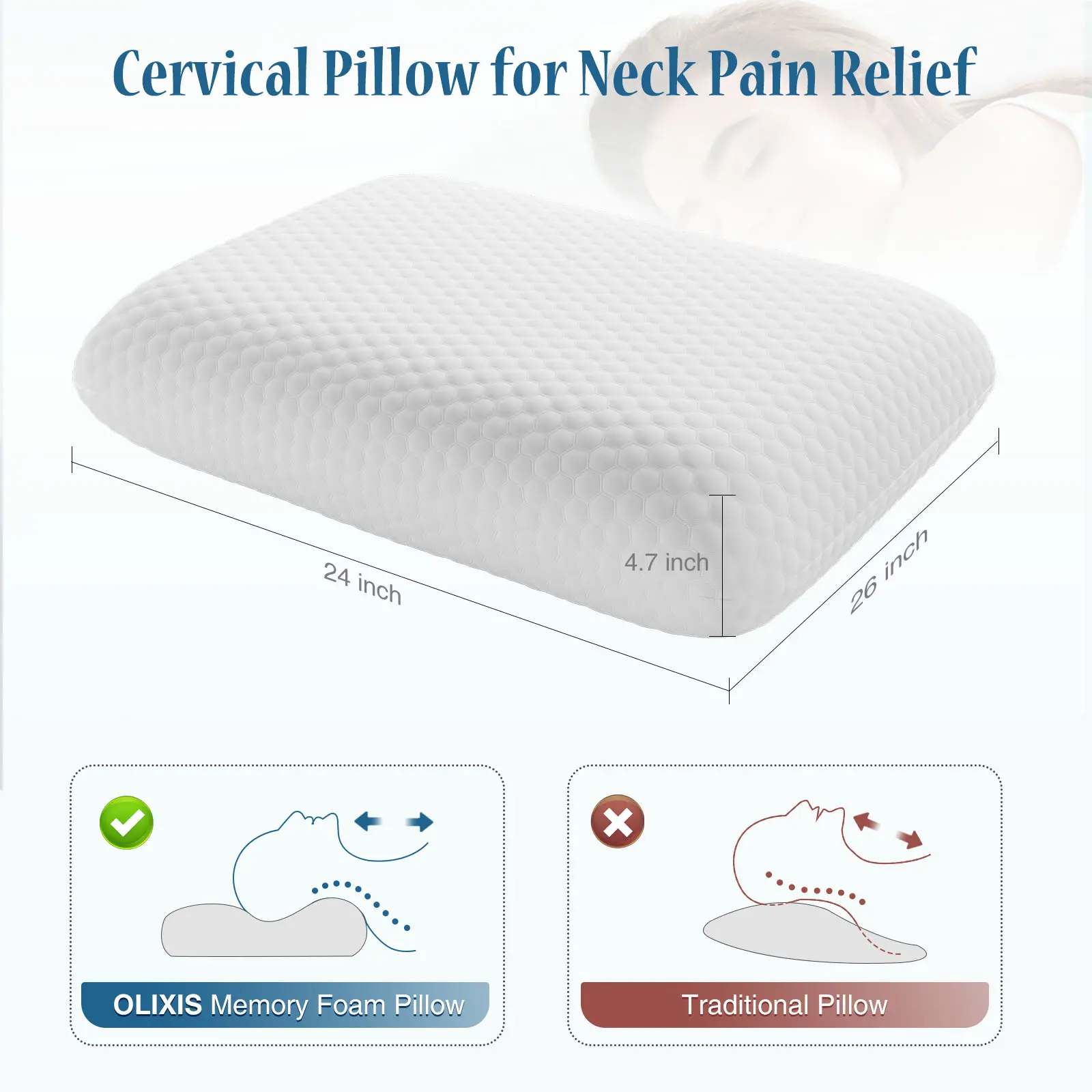 STANDARD SIZE - The soft memory foam pillow is designed to be the perfect size for most individuals, standard size 24" x 16" x 4.7". Pillows for bed dimensions are carefully tailored to provide optimal comfort and support for a wide range of users, ensuring a restful sleep experience.