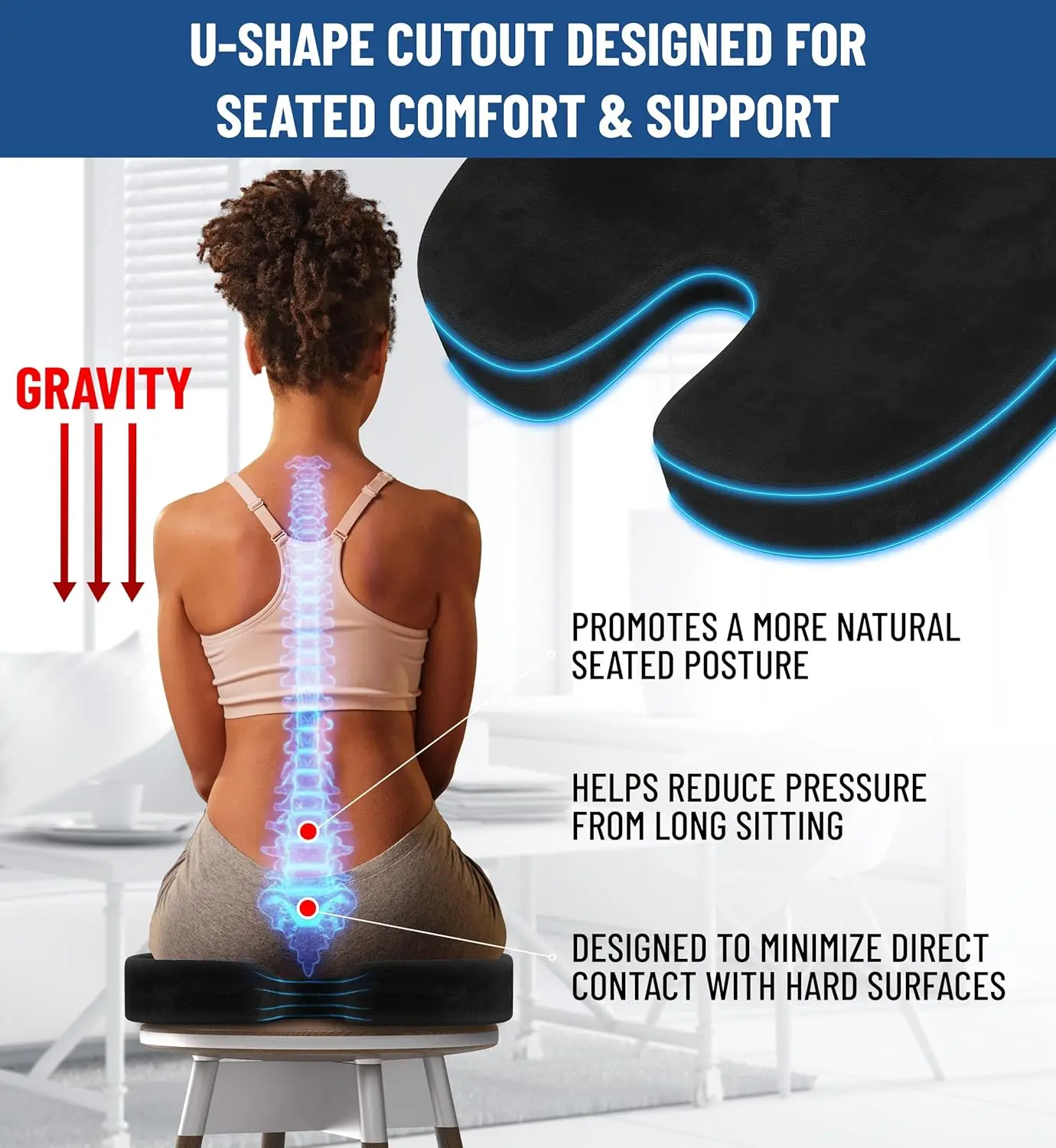 ·Pain Relief & Body Support: The ergonomic "U" shape cutout minimizes tailbone and lower back pain, supporting spinal alignment and enhancing comfort while minimizing gravity's impact on the spine