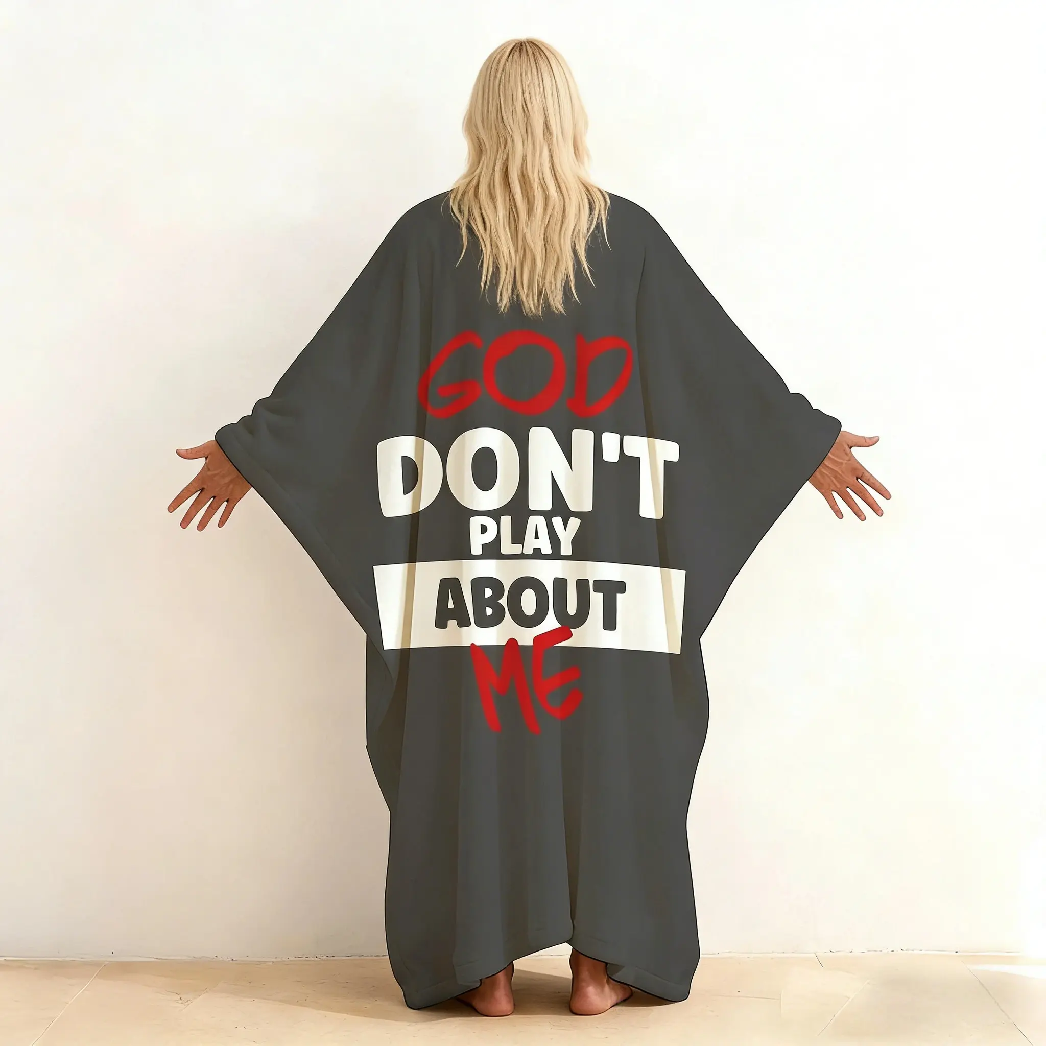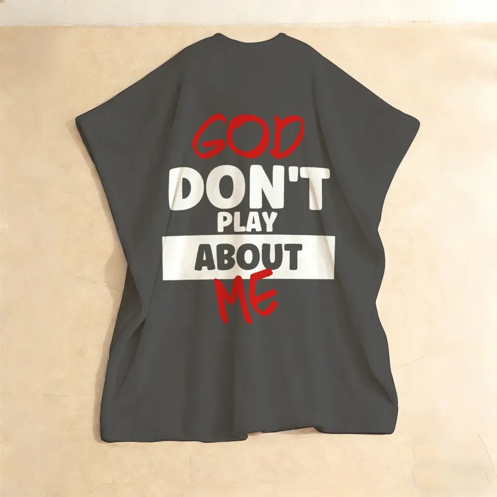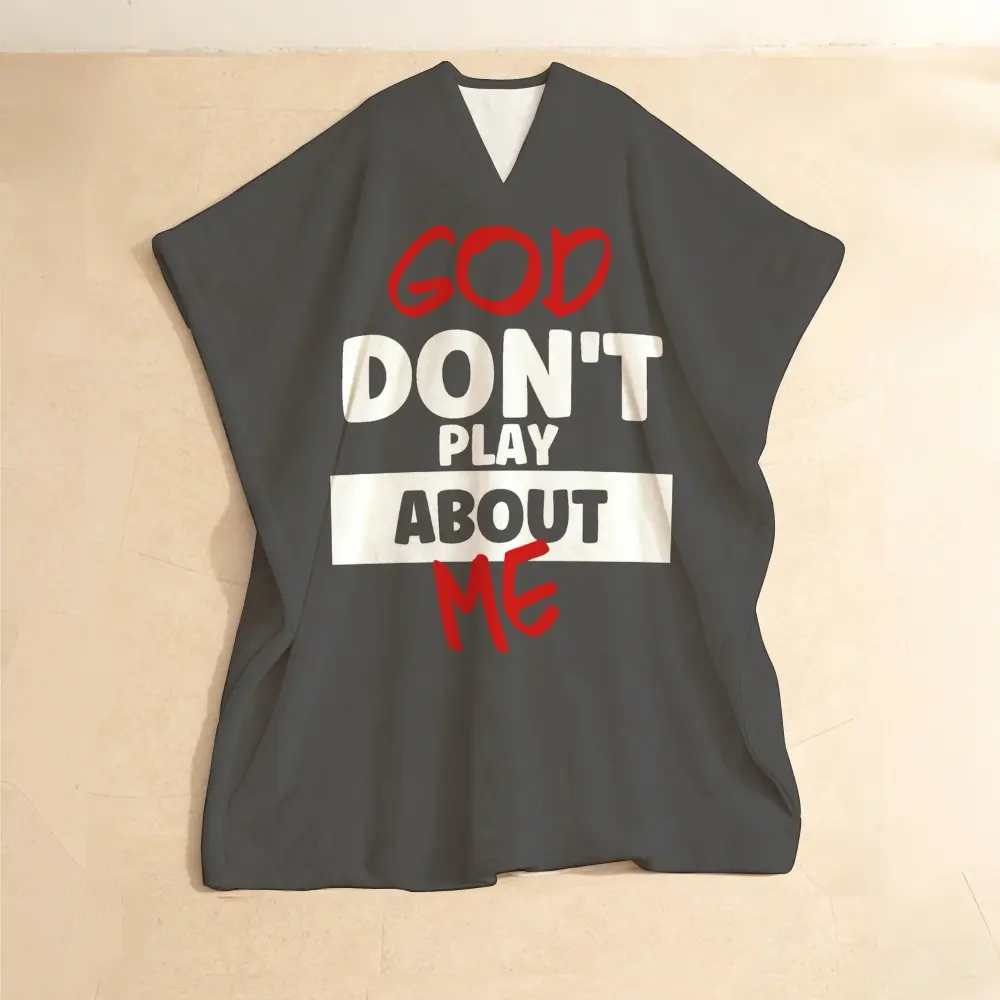 Step into your power with this statement kaftan! Bold 'GOD DON'T PLAY ABOUT ME' print, ultra-comfy flowy fit, and unapologetic energy. Perfect for turning heads and owning your day. #ConfidenceIsKey #StatementPiece #KaftanVibes