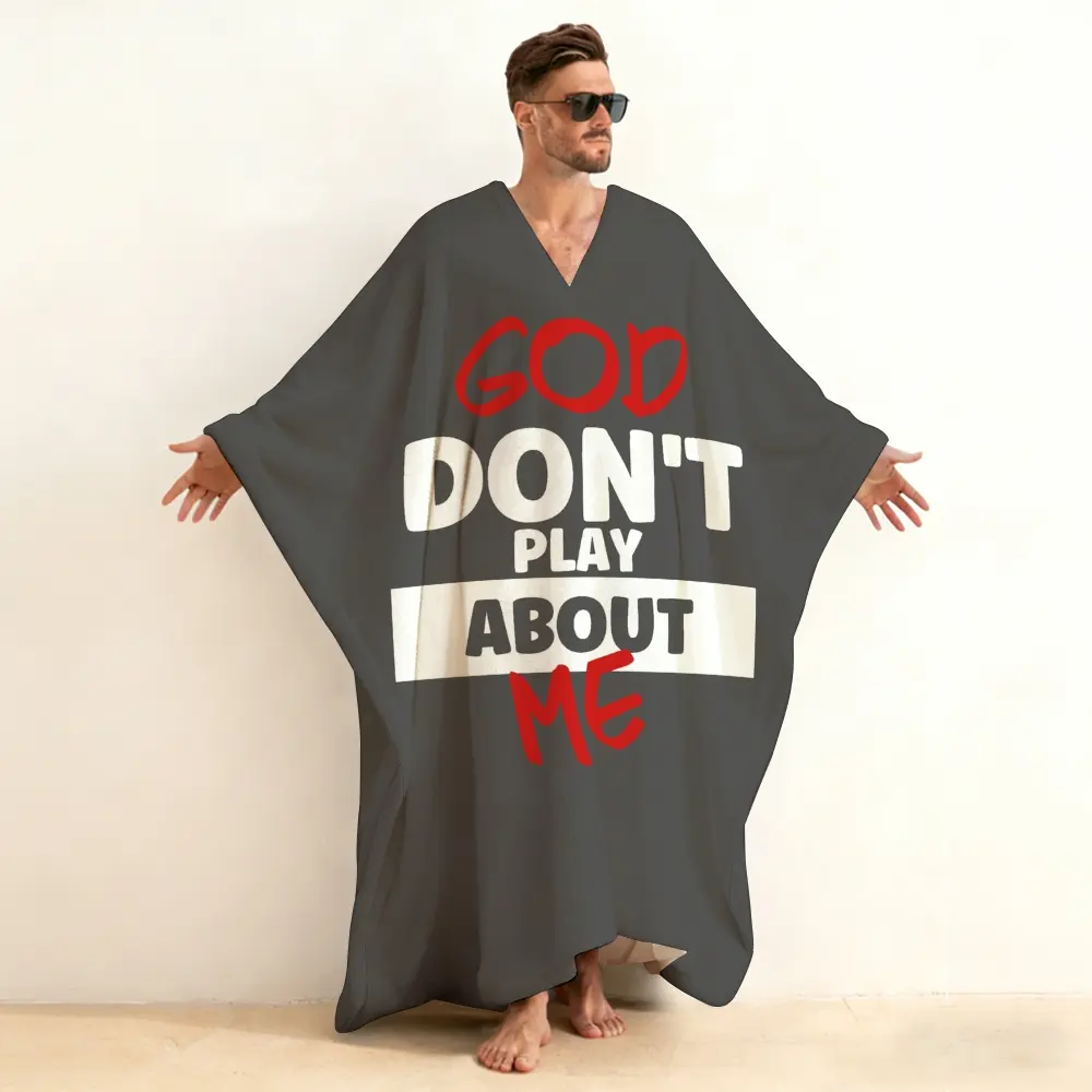 5. Men& Women V-Neck Pullover "God Don't Play About Me" Print Kaftan, Bold Inspirational Slogan Long Sleeve Closed Front Robe, Soft Cotton Pullover Loungewear, Faith Streetwear Sleepshirt for Men