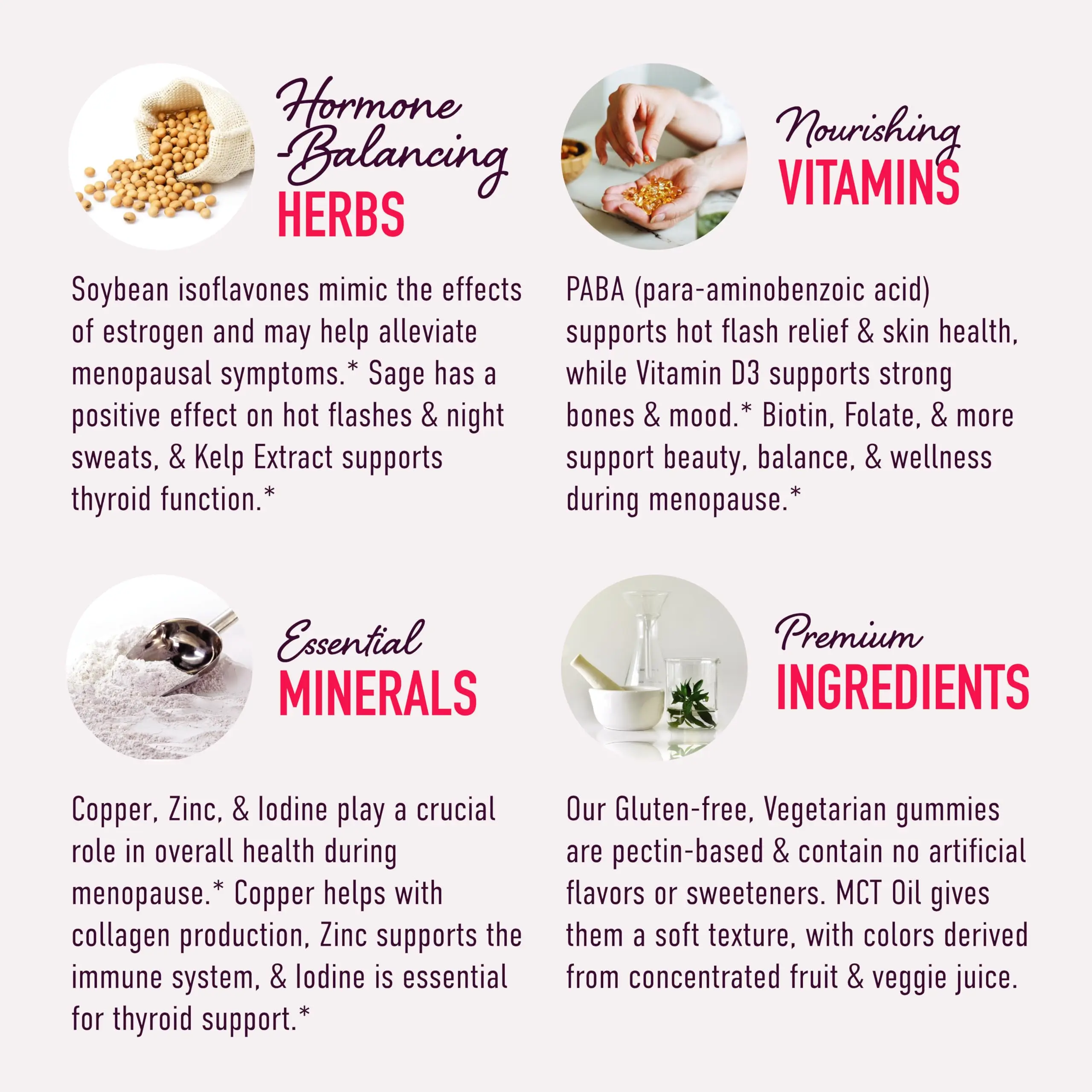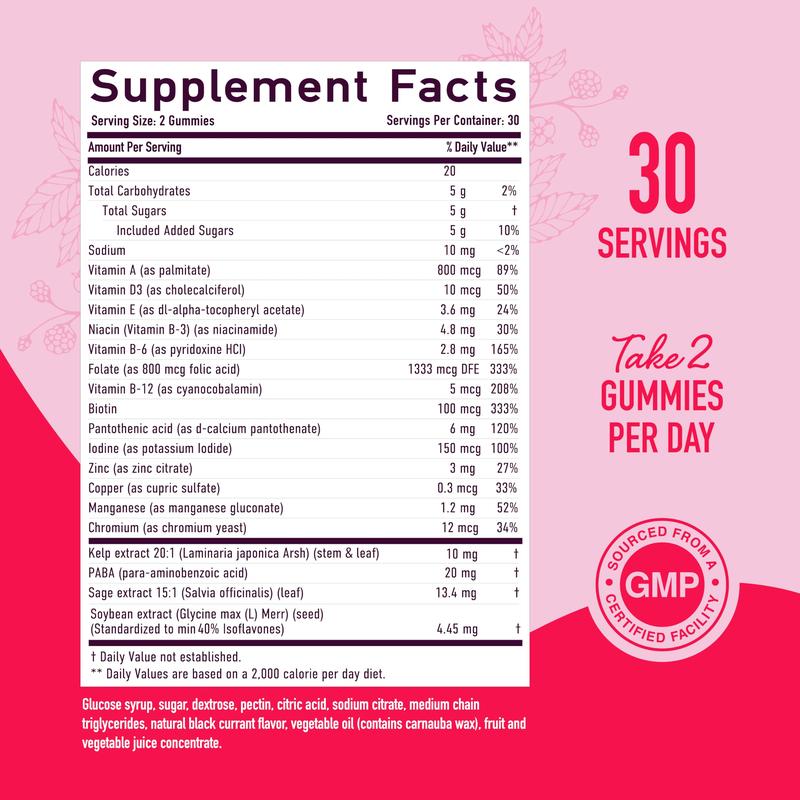·ESSENTIAL MENOPAUSE NUTRIENTS: Our gummy supplements are packed with vitamins and minerals that are crucial during menopause, including Vitamin D3 for bone strength, Iodine and Kelp for thyroid support, and Biotin and PABA for hair, skin, and nail health.*
