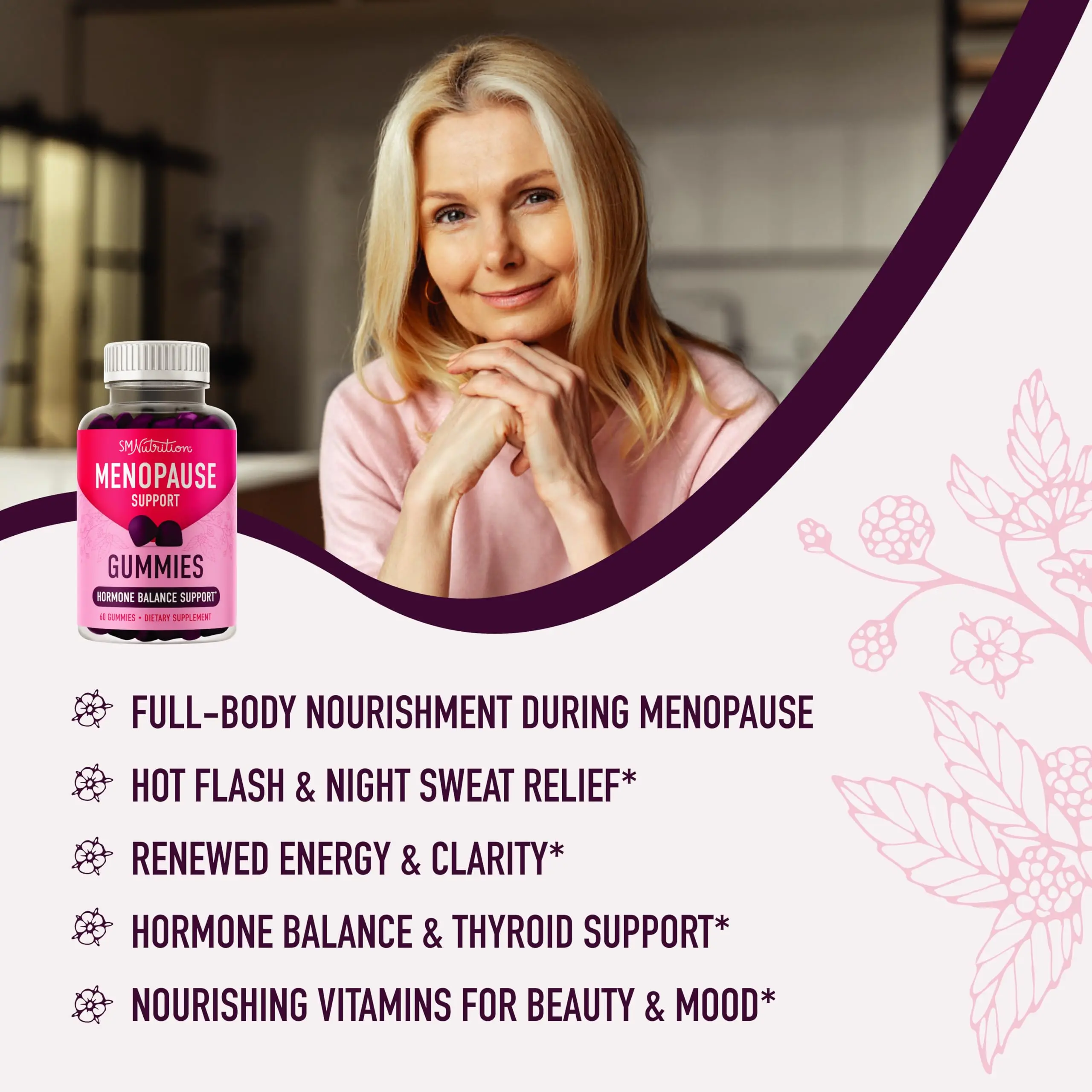·MENOPAUSE SUPPORT GUMMIES: SMNutrition’s Menopause Support Gummies for women are a tasty and convenient way to support balance and relief during every stage of perimenopause and menopause.*