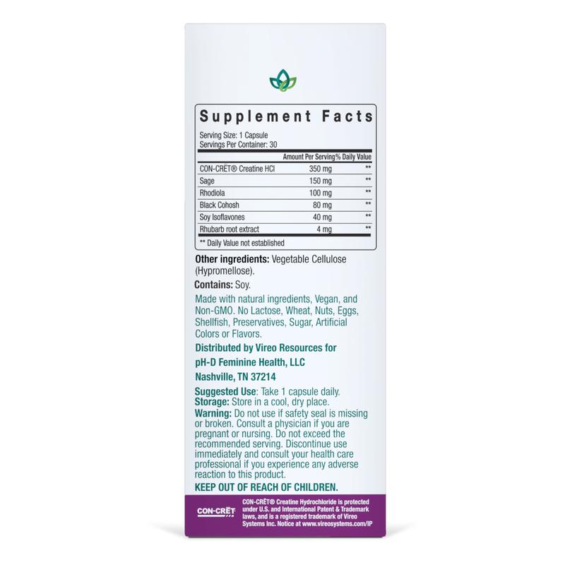 pH-D Feminine Health Menopause Support capsules promote the reduction of hot flashes, irritability, mood swings, and night sweats. Unlike any other menopause supplement on the market, these capsules contain CON-CRĒT which assists with cellular energy to support optimal  brain health.