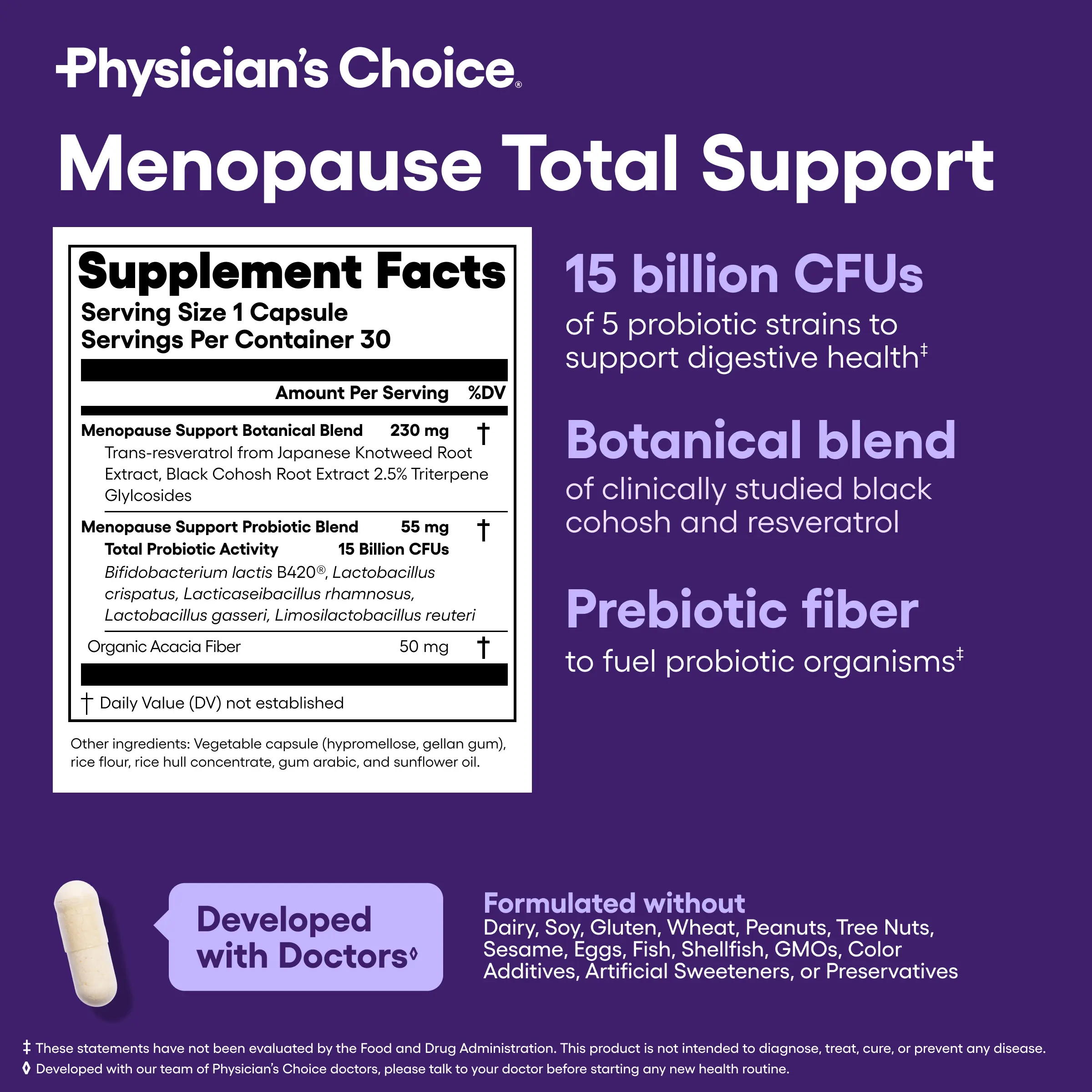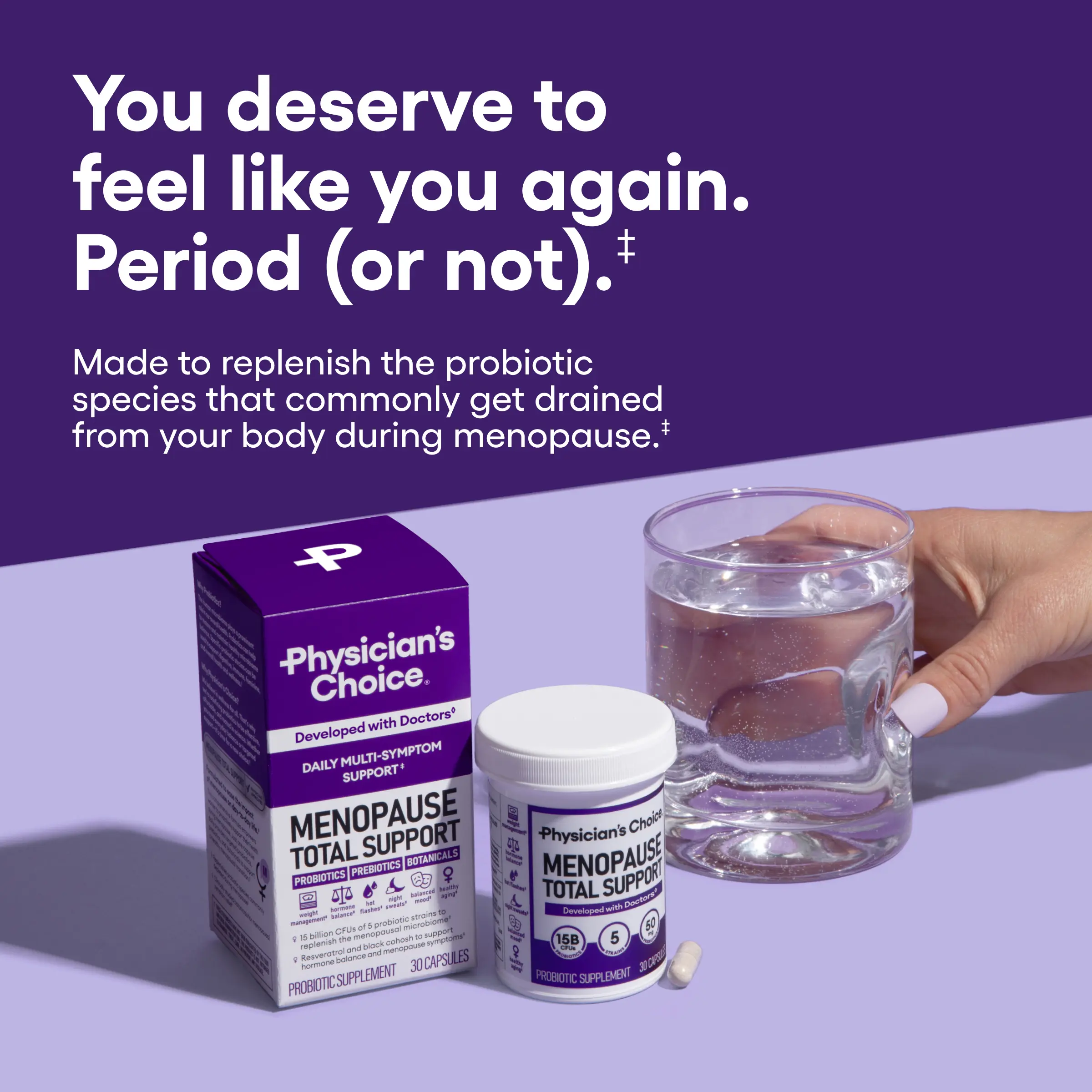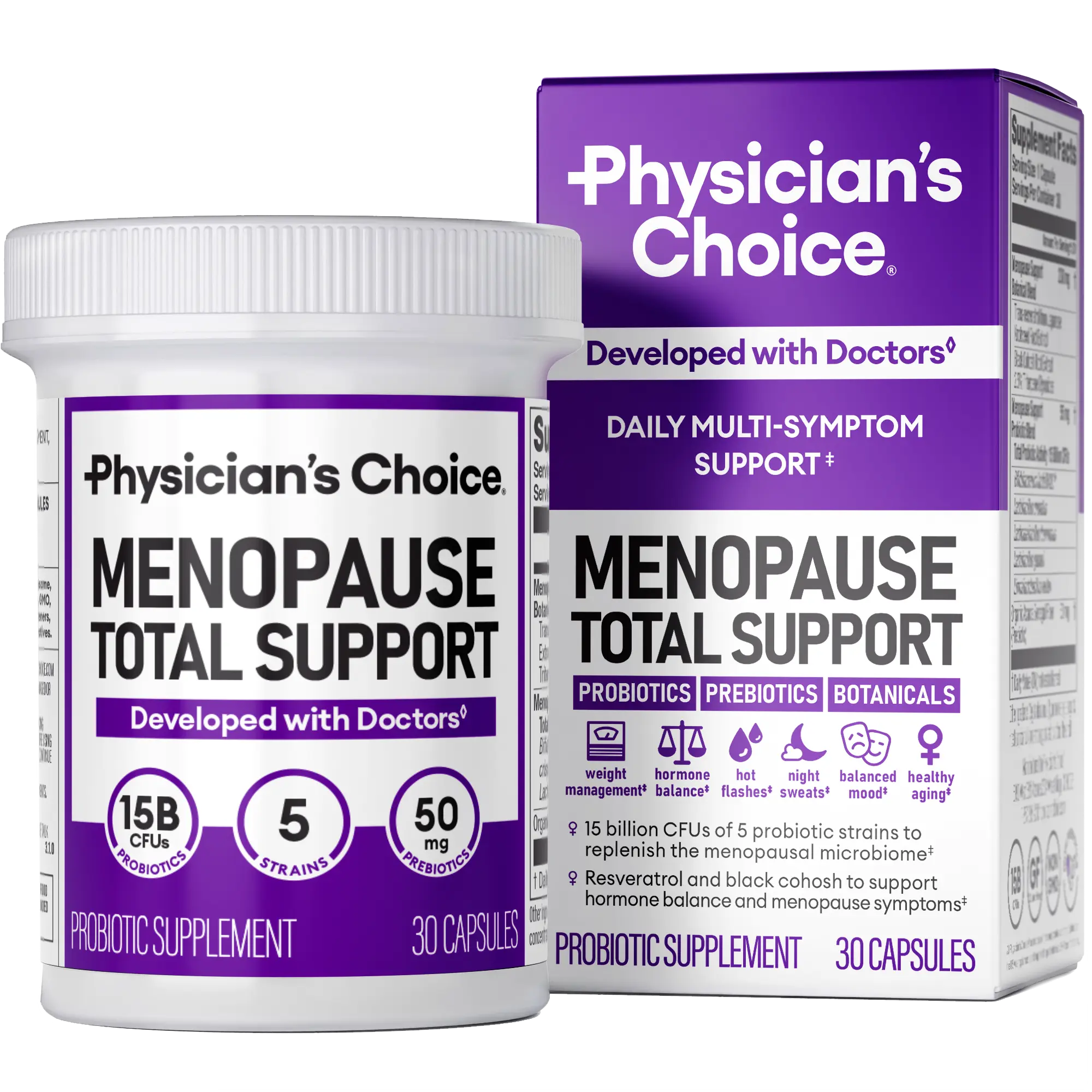 Physician's Choice Menopause Total Support is designed to help women navigate the challenges of menopause with a 3-in-1 formula of targeted probiotic strains, prebiotics, and natural botanicals.