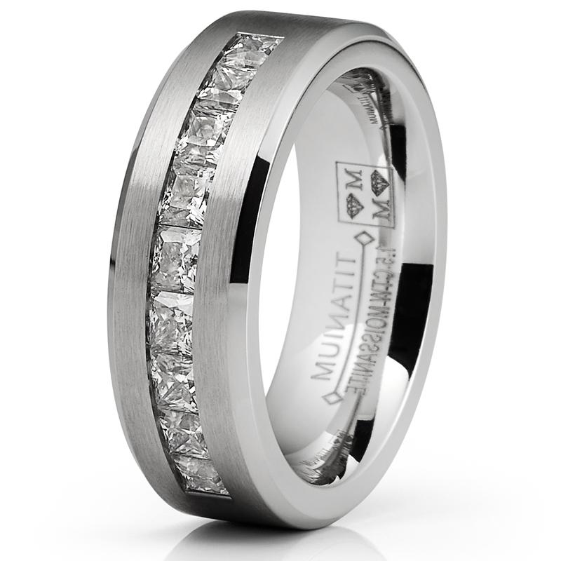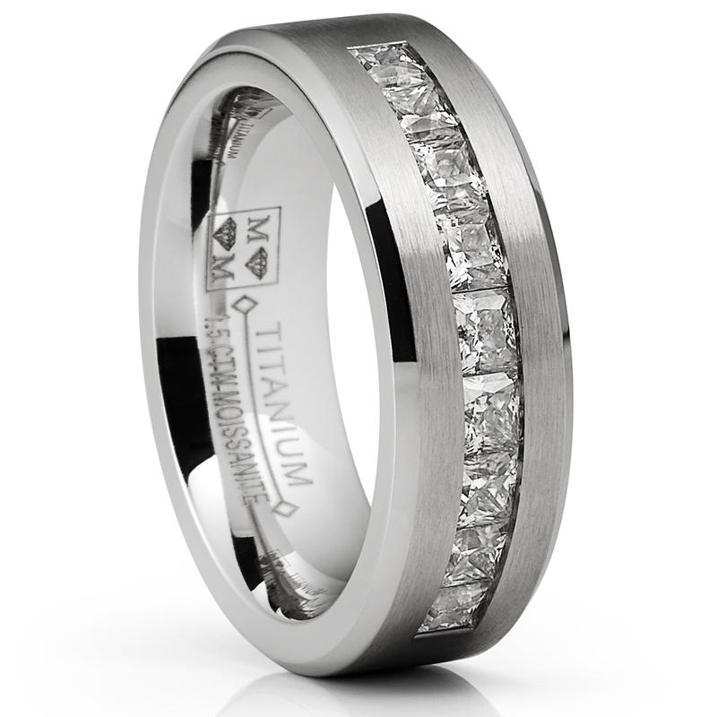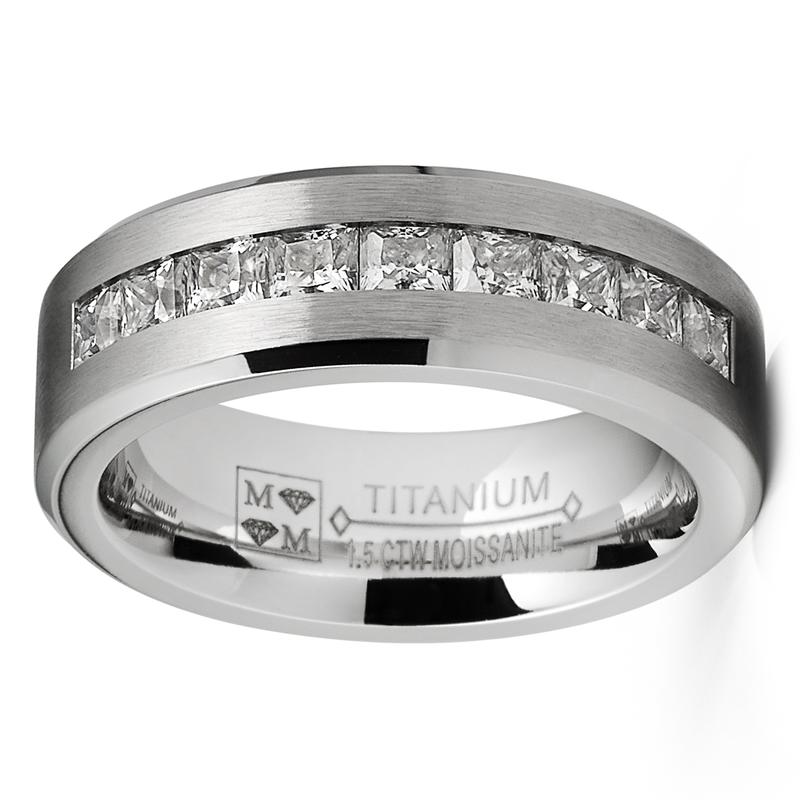 Make a bold statement of commitment with this striking Men's Moissanite Wedding Band. Crafted from strong, lightweight Titanium, this 8MM wide band features a powerful modern design. Nine brilliant Princess-Cut Moissanite stones are channel-set across the center, totaling 1.5 Carat T.W. of exceptional fire and light.