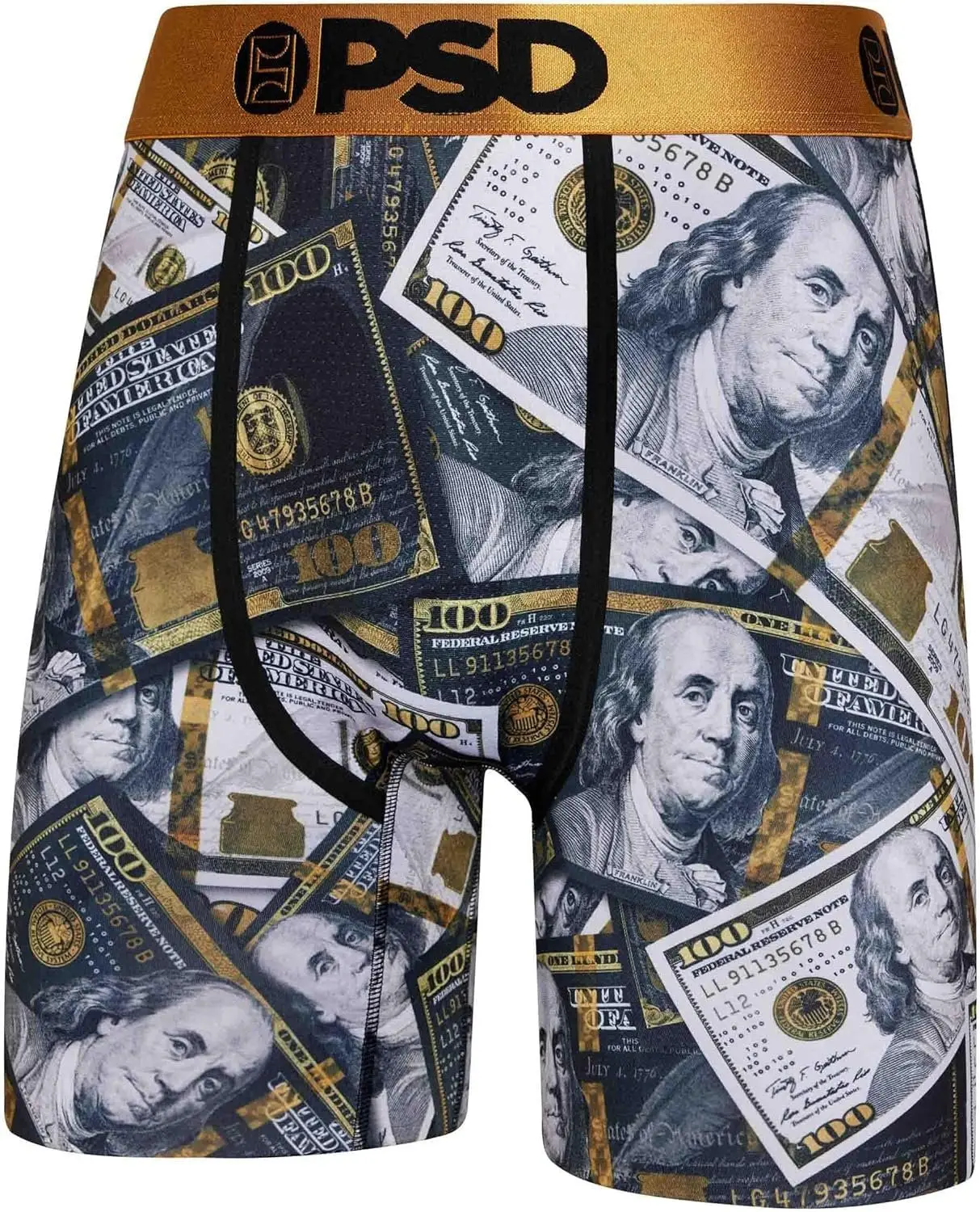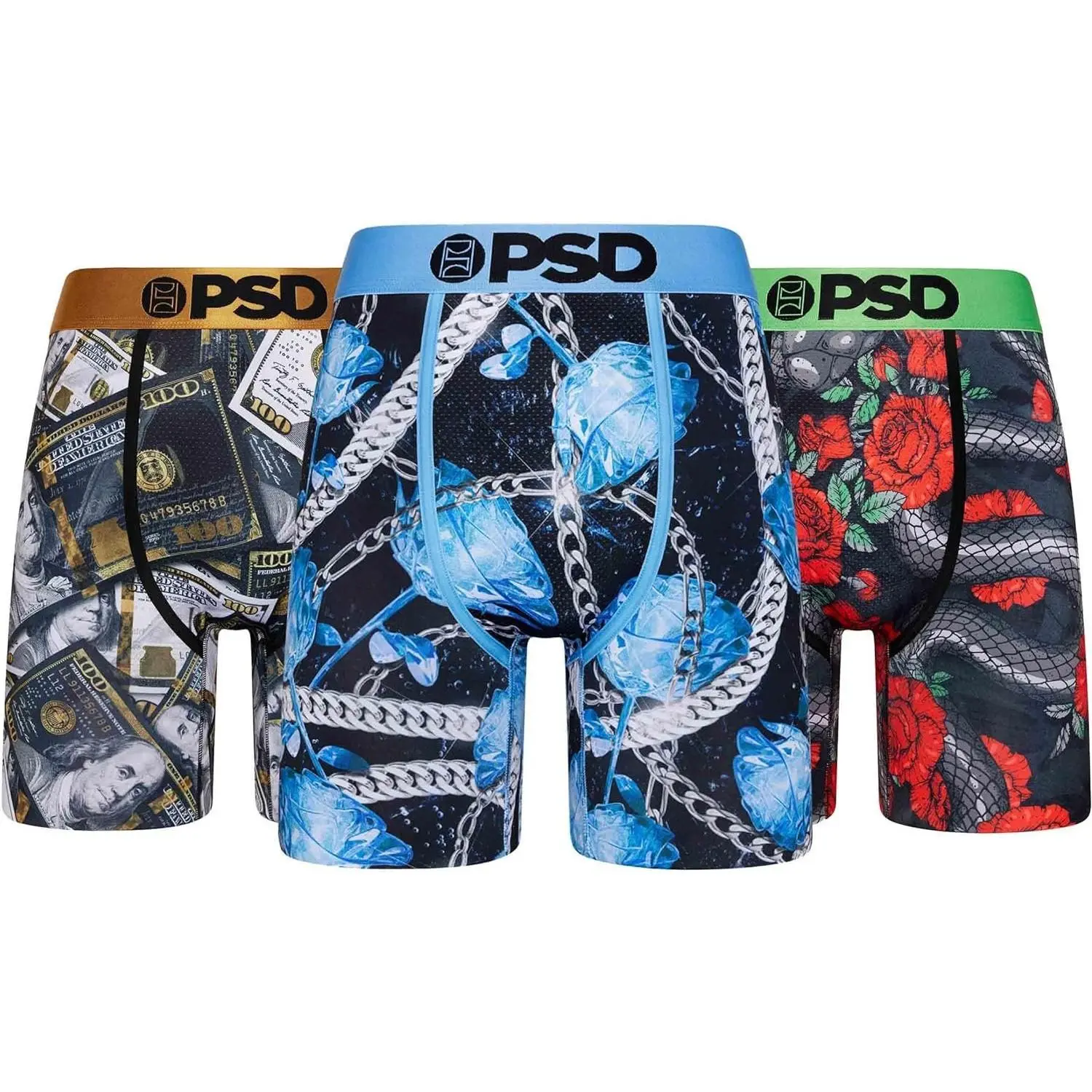 The PSD Underwear Men's Flying Lux Boxer Briefs 3-Pack combines pairs from some of our bestselling collections all in one multi-pack. Featuring Benji Gold, Frost Bloom, and Slither Rose, you get a little taste of everything. The PSD 7” Standard Length briefs feature an ultra-comfortable waistband, four-way stretch, a breathable MicroMesh pouch, and durable flatlock stitching and were made to hold up for everything from everyday wear to the toughest workouts.