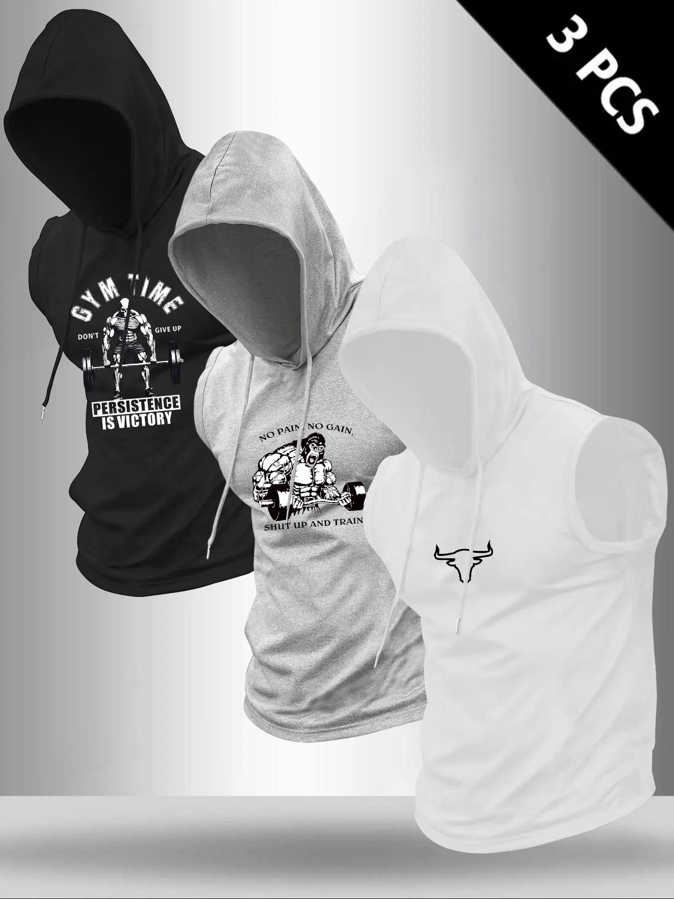 5. Men's 3-Piece Set Letter Print Hooded Sleeveless T-Shirt, Casual Comfortable Summer Outdoor Fitness Vest, Fitted Style