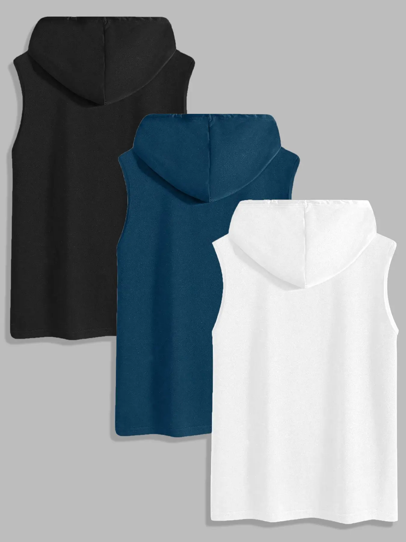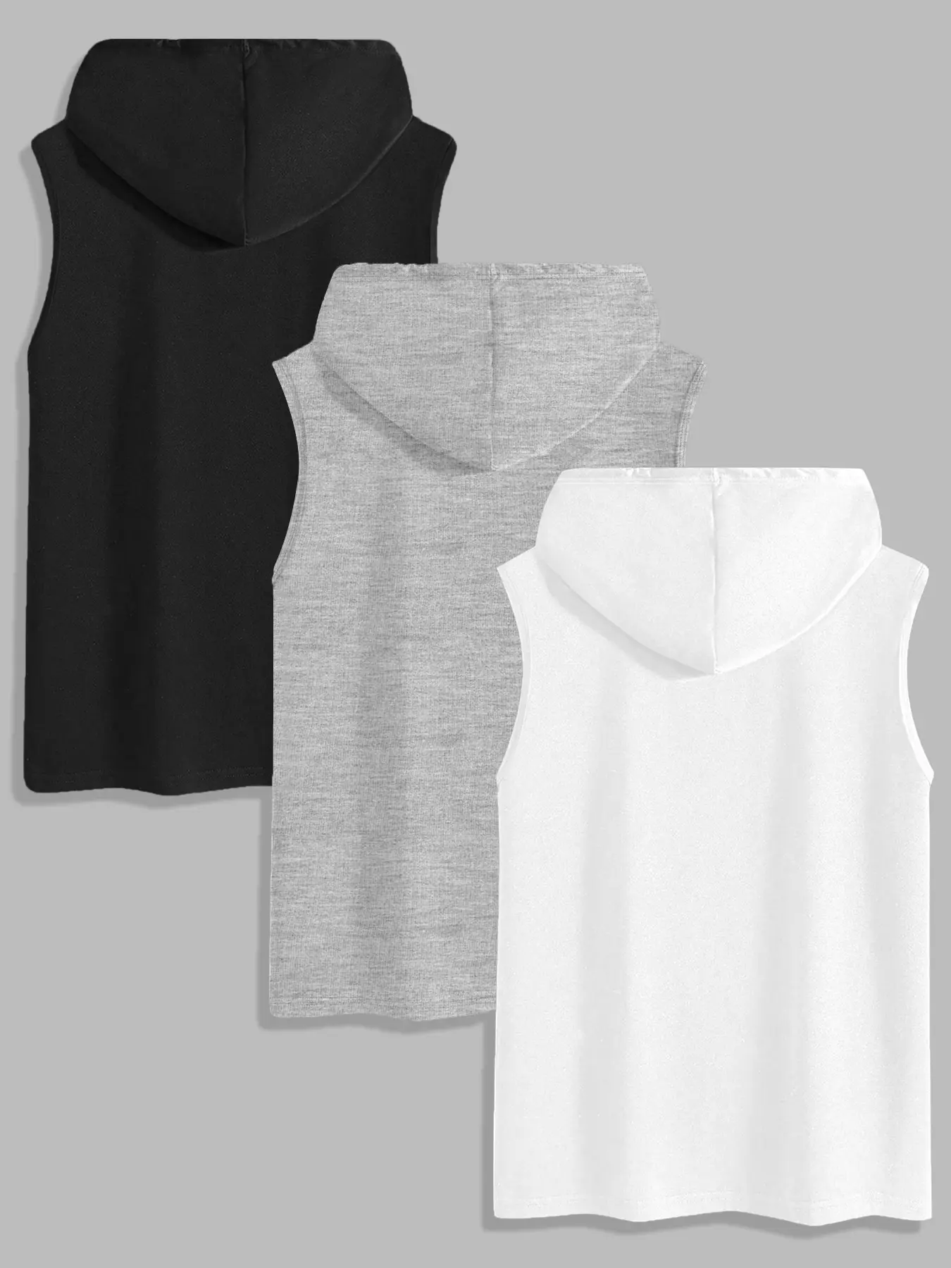 Men's 3-Piece Set Letter Print Hooded Sleeveless T-Shirt, Casual Comfortable Summer Outdoor Fitness Vest, Fitted Style