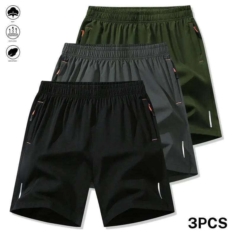 Men'S 3 Piece Set of Casual Sports Shorts, Solid Color Breathable Quick Dry Style with Zipper Pockets and Drawstring Waist, Ideal for Outdoor Activities and Fitness Training, Reflective Strip Design