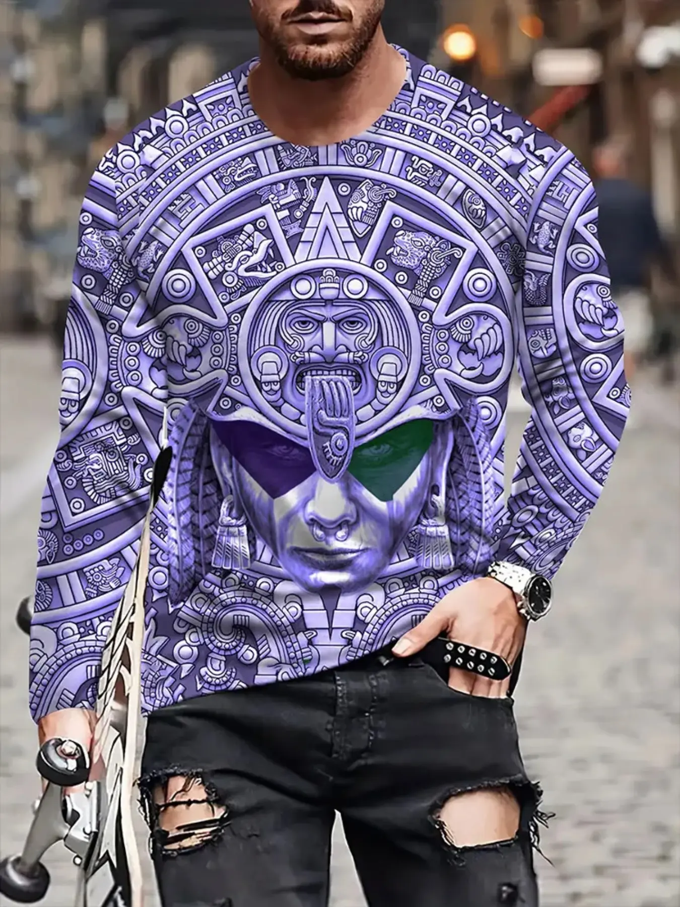 Men's Fashion 3D Maya Culture Print Long Sleeve T-Shirt #tiktokshop #fyp #spotlightfinds #fouyou #tiktokmademebuyit