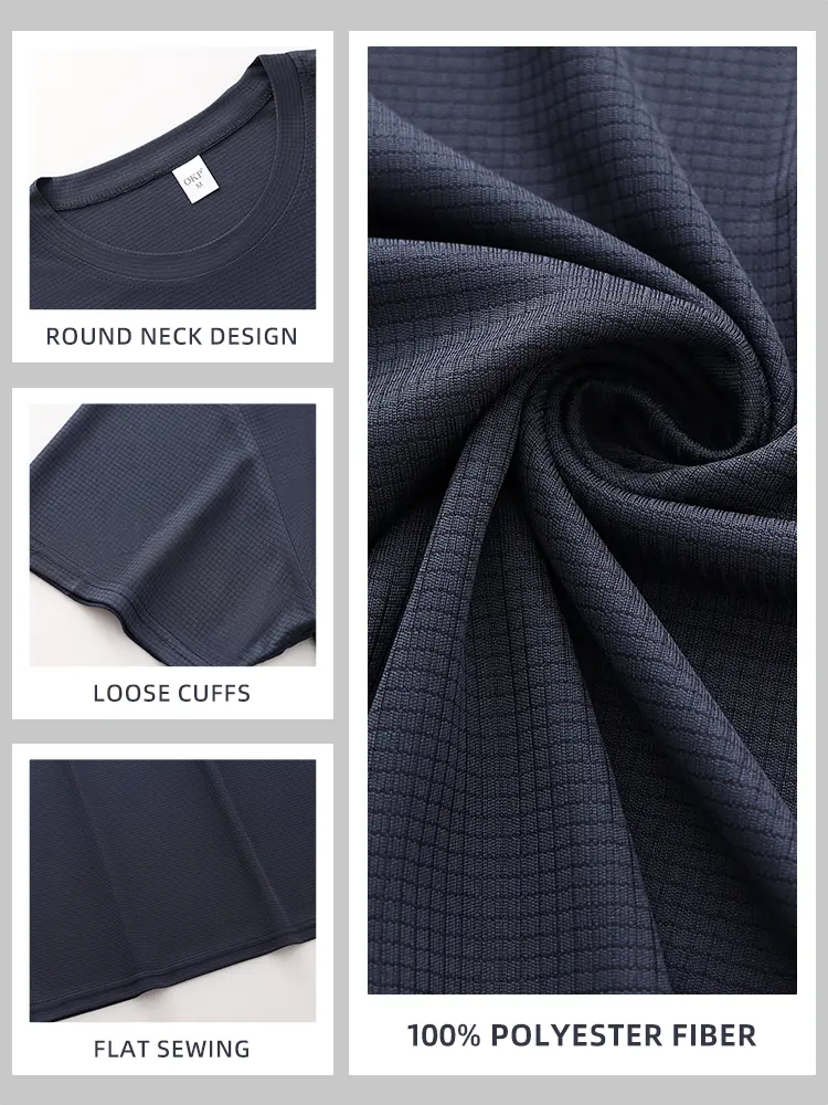 Each tee features a raised mini-square grid texture woven into the fabric. This subtle texture creates a soft matte finish, adding visual depth compared to standard flat T-shirts. The grid texture supports airflow and improves air circulation, reducing cling during activity. 🌬️
