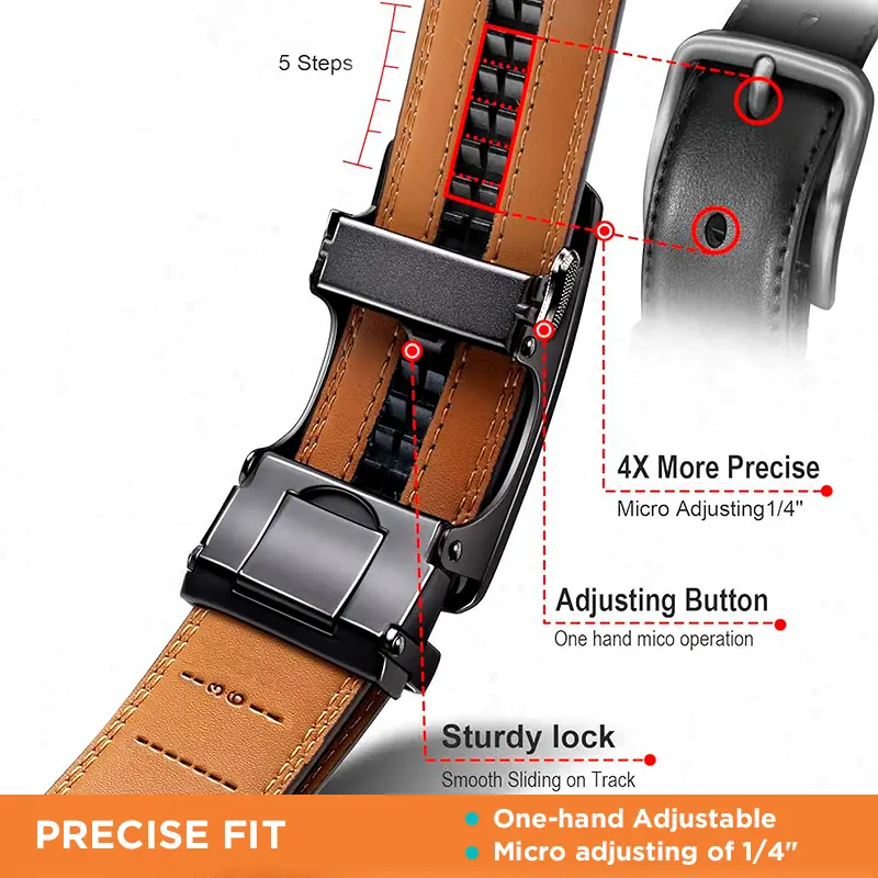 ยท[Customizable Fit]: Achieve the perfect fit with our innovative rachette belt. Enjoy up to 1/5" adjustments, ensuring a comfortable and precise fit everywhere you go. The easily removable buckle allow you to cut the belt to your ideal size, making it tailored to your unique style. Sharp, sleek, and attractive - adjustable dress belt accentuates your personality with confidence!