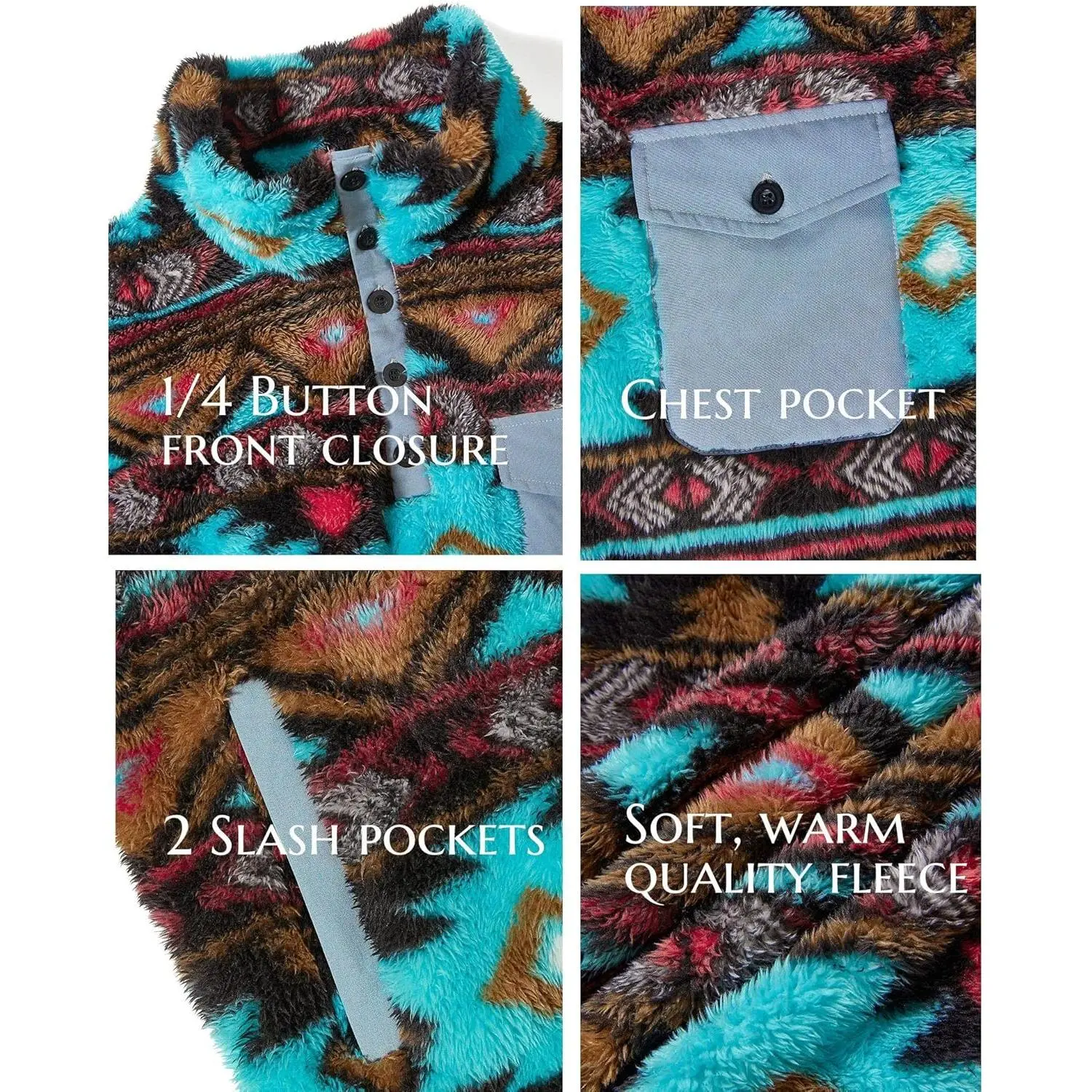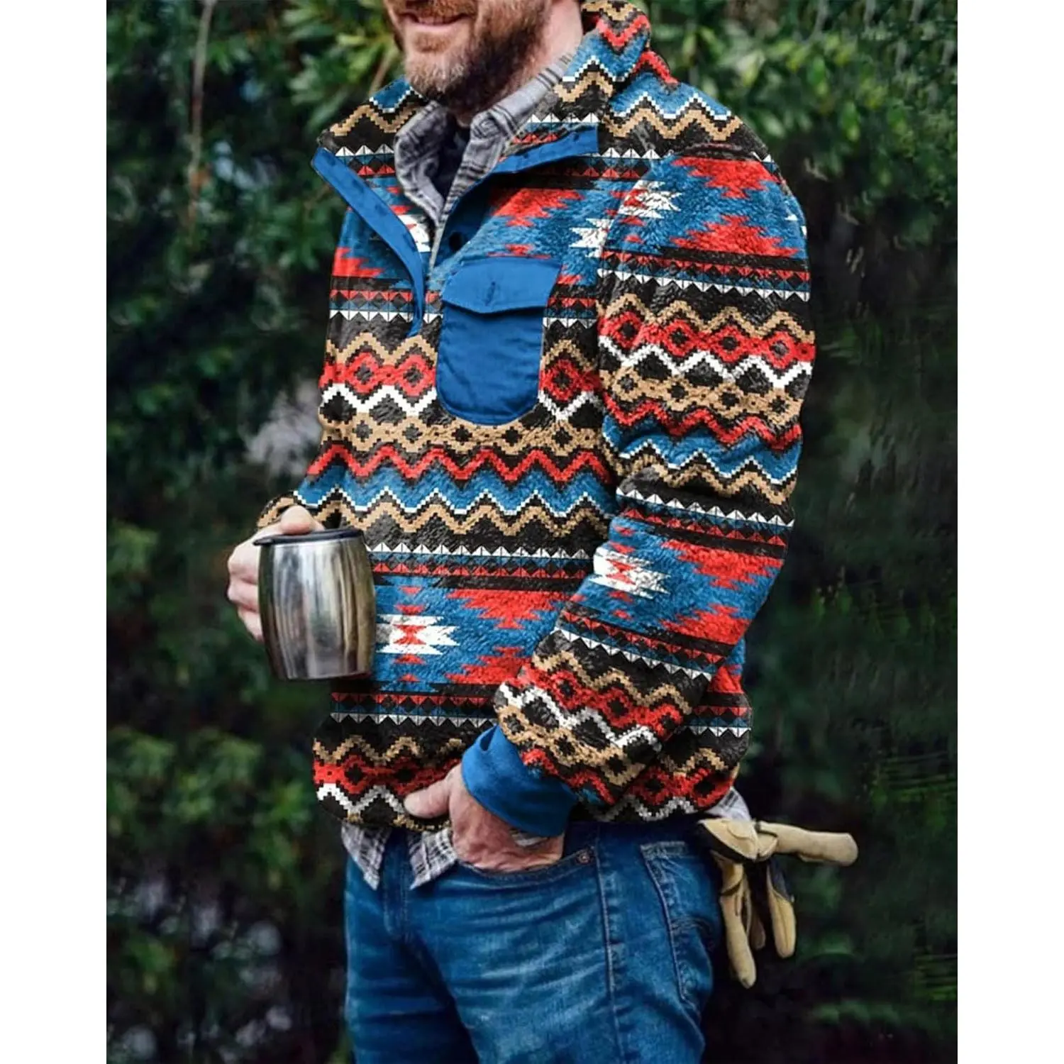 fleece jackets for men are designed with AZTEC prints that add retro style, and the fleece fabric adds warmth to any outfit. Stand collar, button up, chest pocket, 2 side pockets, stretch cuffs and hem, classic fit.