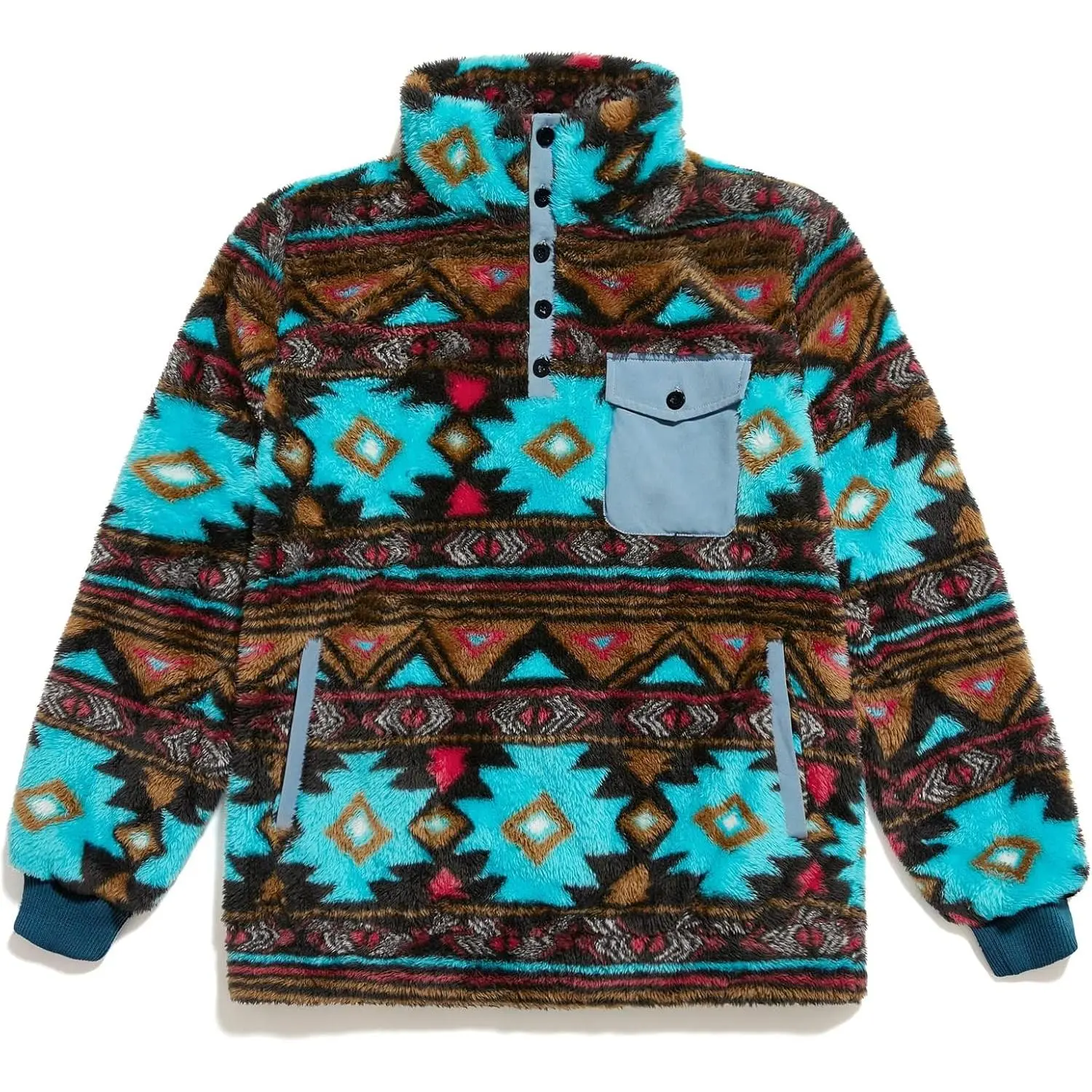 Turn heads and stay warm with this eye-catching Beotyshow Vintage 90s Fleece Pullover Jacket in a vibrant geometric Aztec print. Whether headed to grab coffee or to a photo shoot, this jacket will have eyes on it.
