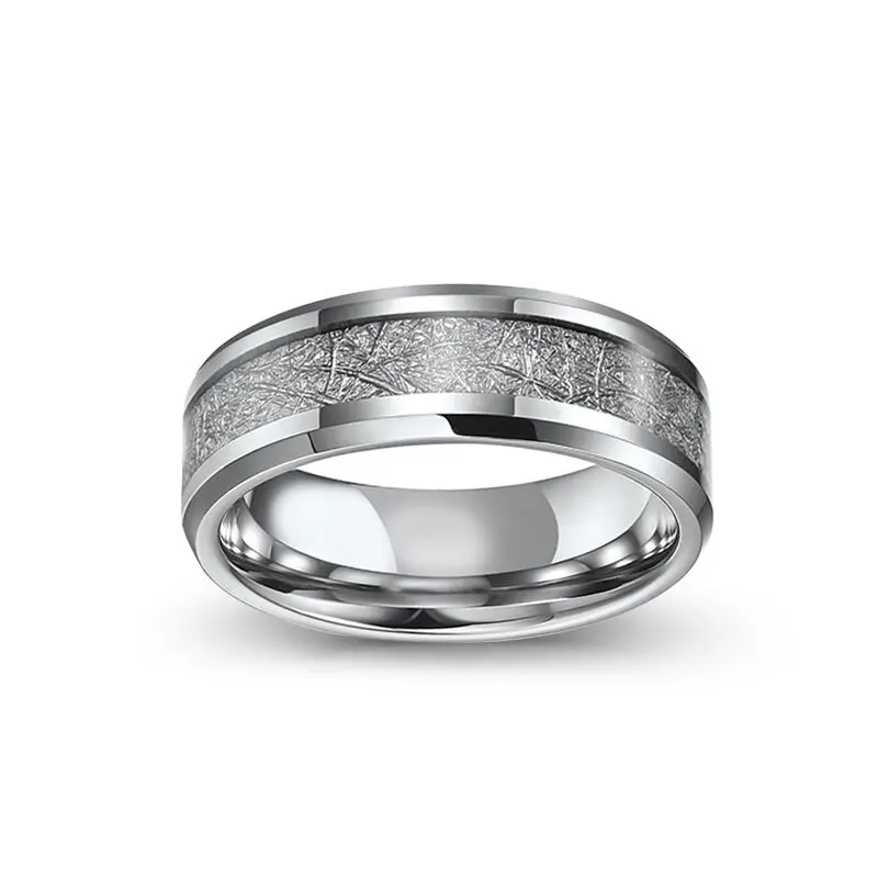 This hand-crafted titanium steel ring features a polished, white gold plated finish with a stunning imitated meteorite inlay. Your titanium steel band will maintain its luster, beauty, and shape forever. Its eternal strength is the perfect symbol of eternal love. An astounding lattice of crystalline markings, known to science as Widmanstätten patterns, is a hallmark of iron ore procured from Muonionalusta meteorite. These intricate scars celebrate survival across 4 billion years of history - now they record the adventures of your journey.