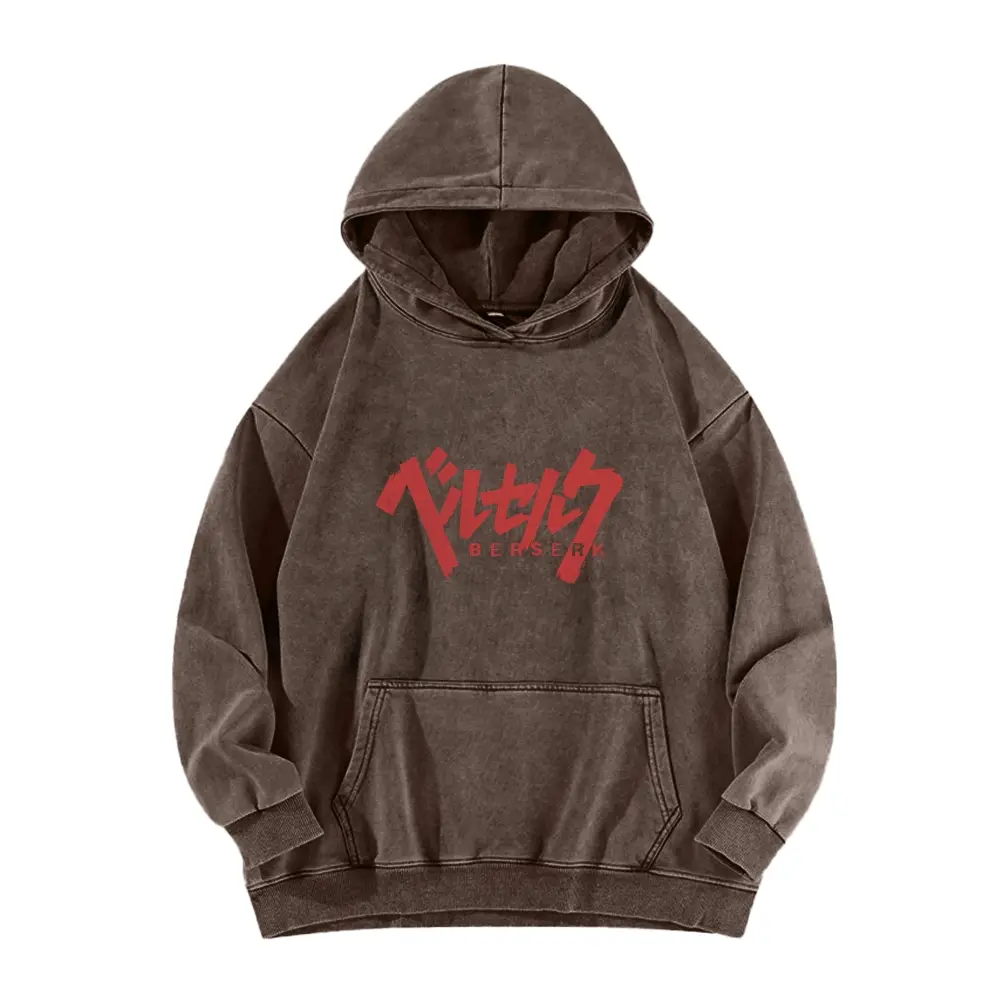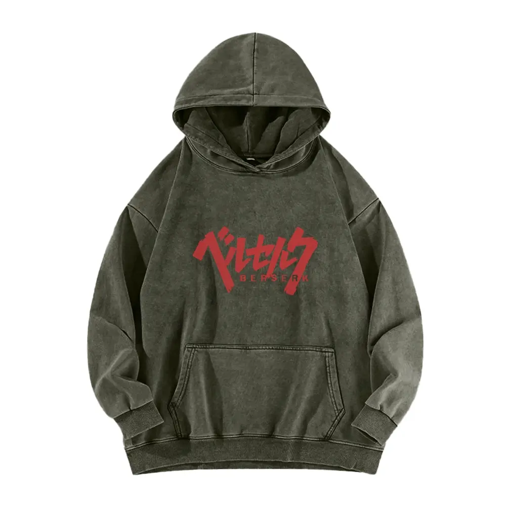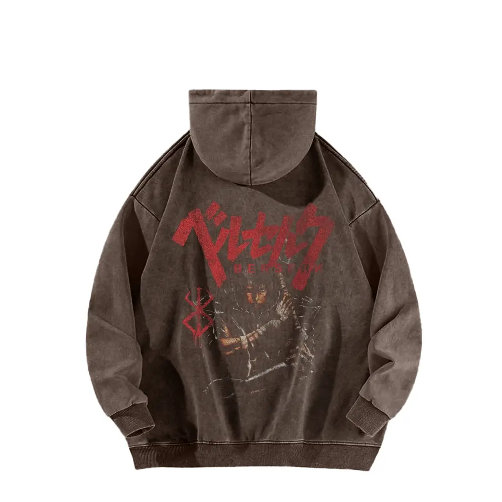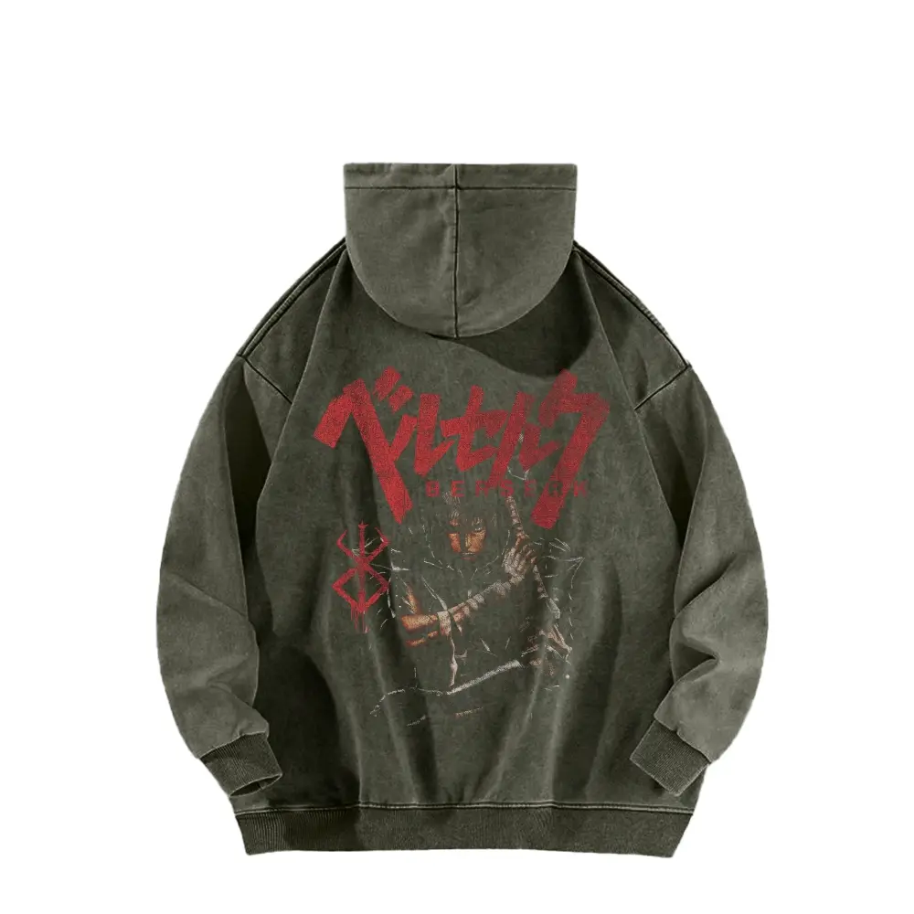 Berserk, a hooded sweatshirt featuring the protagonist from street style. This long-sleeve cotton unisex vintage hoodie is perfect for everyday wear. The water-wash process gives it a vintage, worn-in look, while maintaining durability. Eco-friendly printing ensures vibrant, lasting designs.