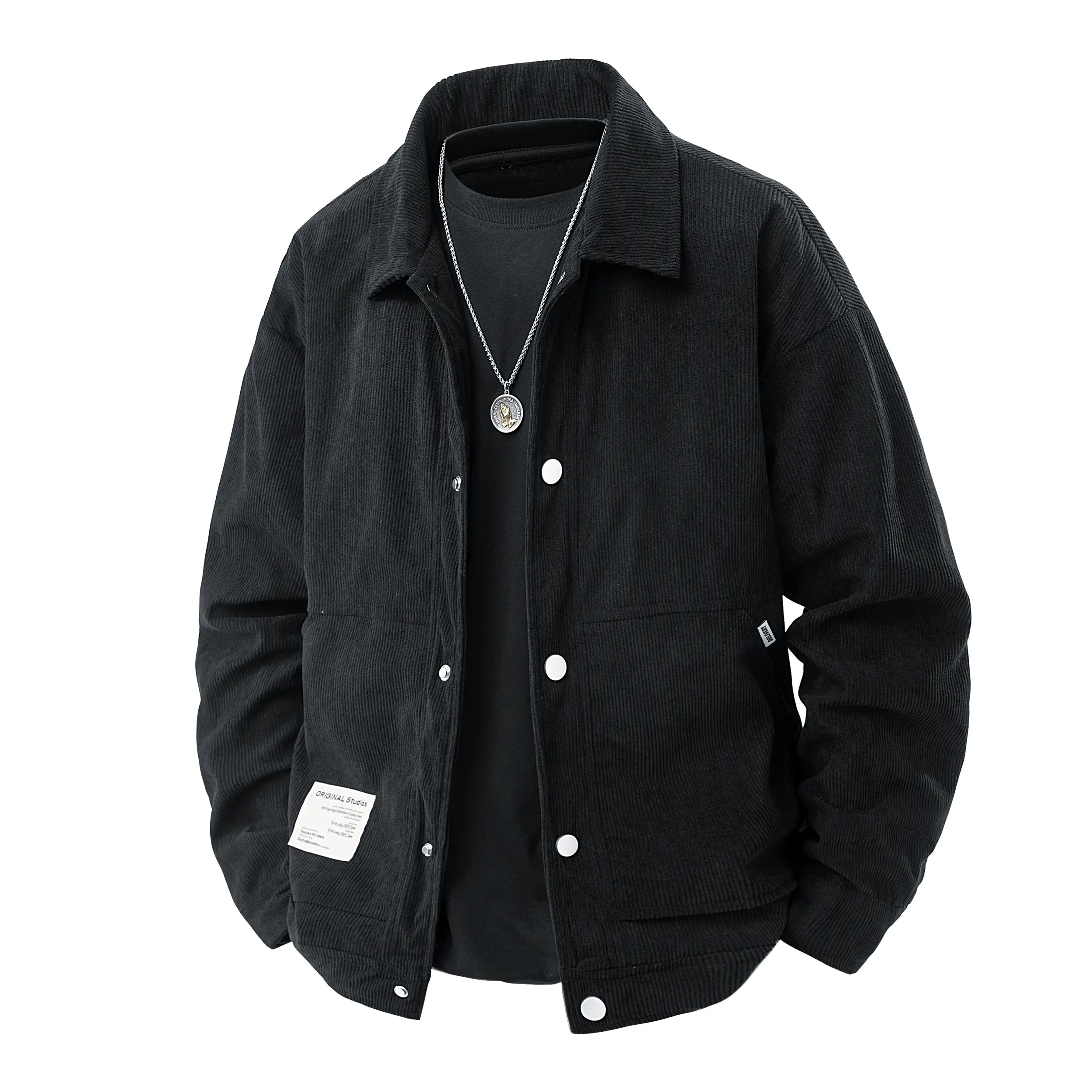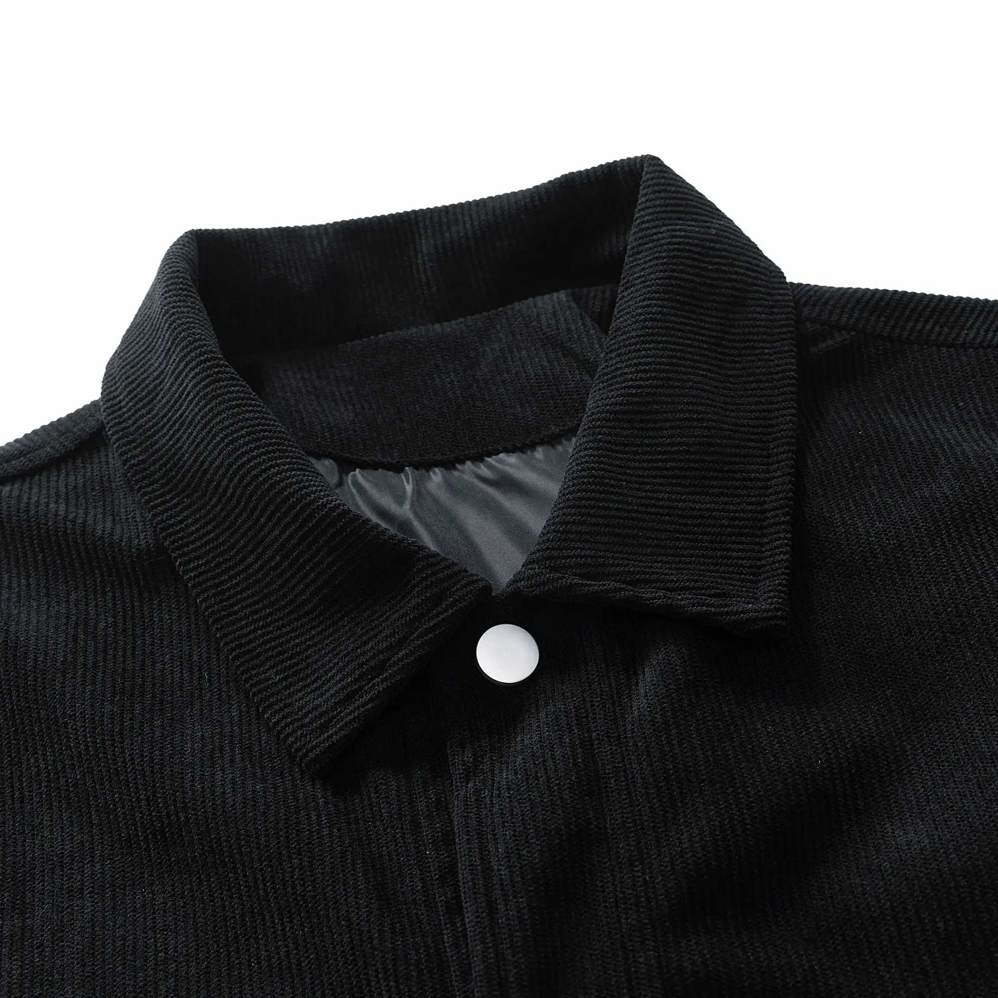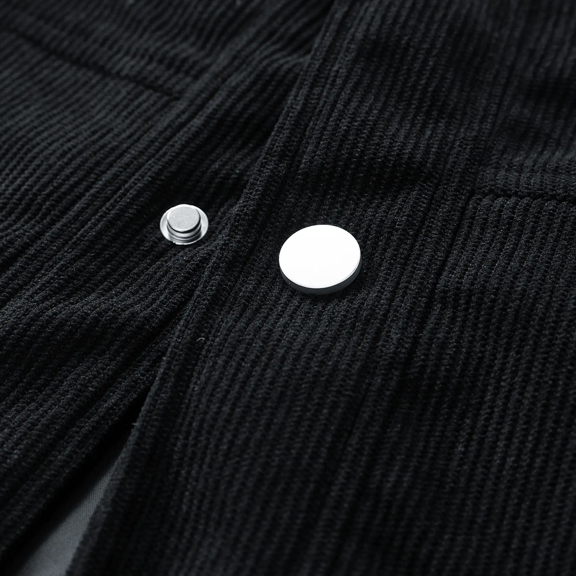 5. Men's Black Corduroy Jacket with Silver Button Accents & Included Pendant Necklace Vintage Lapel Style with Logo Patches for Casual Streetwear Medium Size