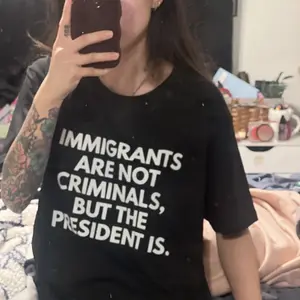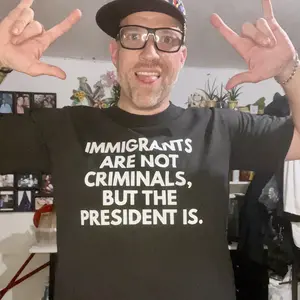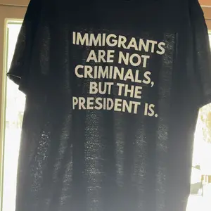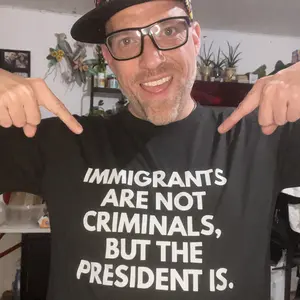 Elevate your summer wardrobe with this "Immigrants Are Not Criminals But The President Is" men's casual black T-shirt. Crafted from soft cotton, it ensures comfort and style. The crew neck design provides a classic fit, perfect for all seasons. Ideal for casual outings or relaxing at home, this T-shirt is your go-to for everyday wear.