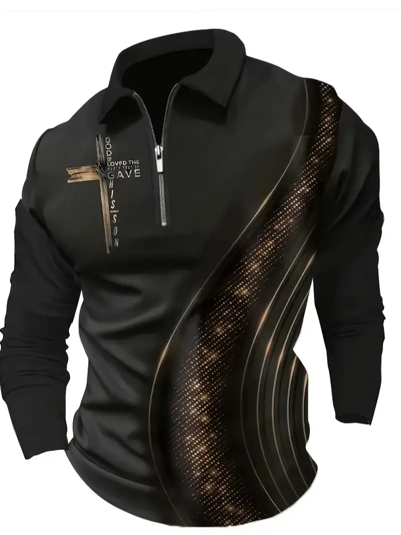 Upgrade your autumn wardrobe with this head-turning black & gold half-zip polo — where streetwear edge meets light luxury style. Designed for the modern guy who wants to stand out, this slim-fit top blends bold contrast details, a meaningful cross graphic, and everyday comfort to create a versatile piece you’ll reach for on repeat.