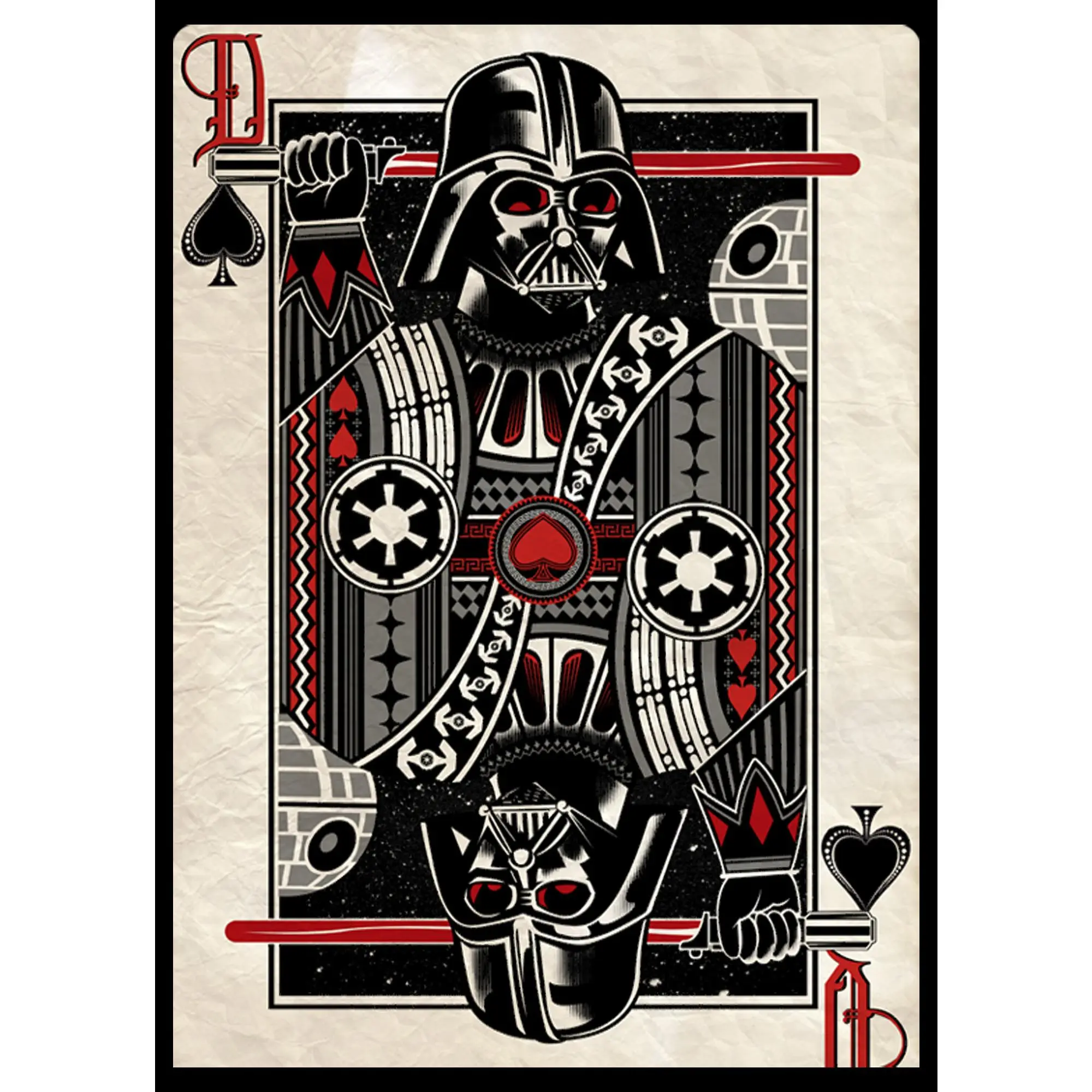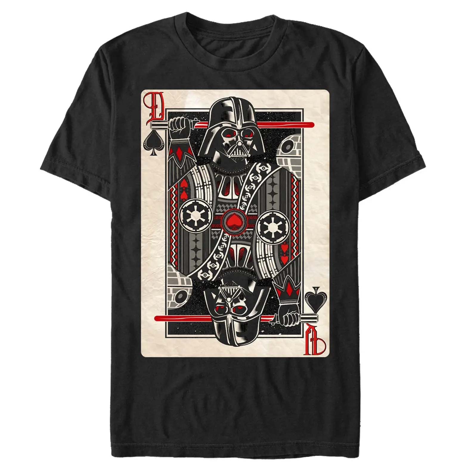 The classic playing card gets an Empire-themed makeover to bring you the Star Wars Vader King of Spades Black T-Shirt. Darth Vader takes the role of king on this unique Star Wars t-shirt, with his famous red lightsaber in hand.