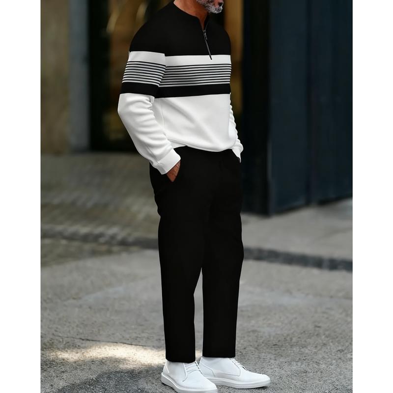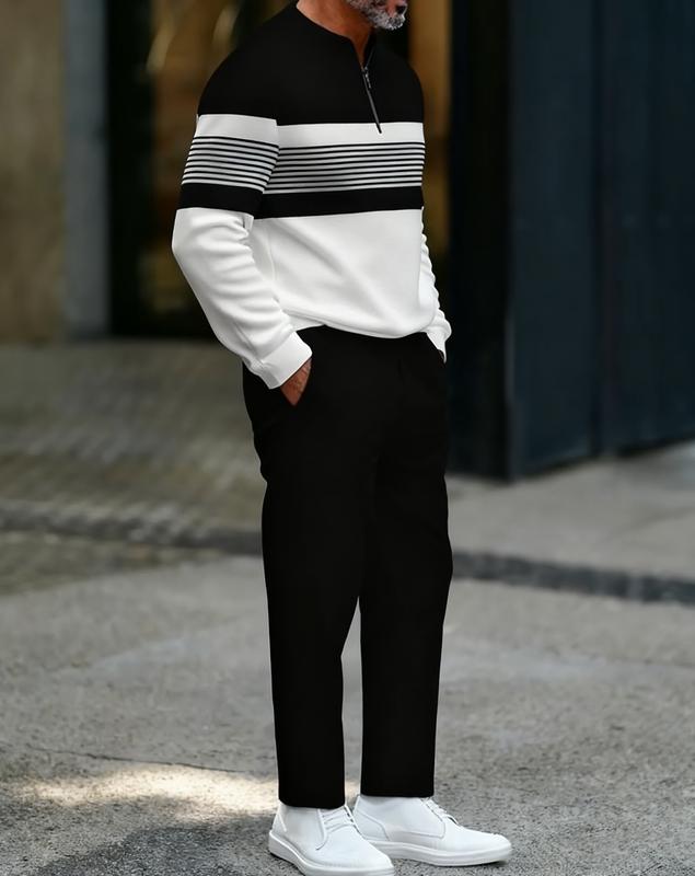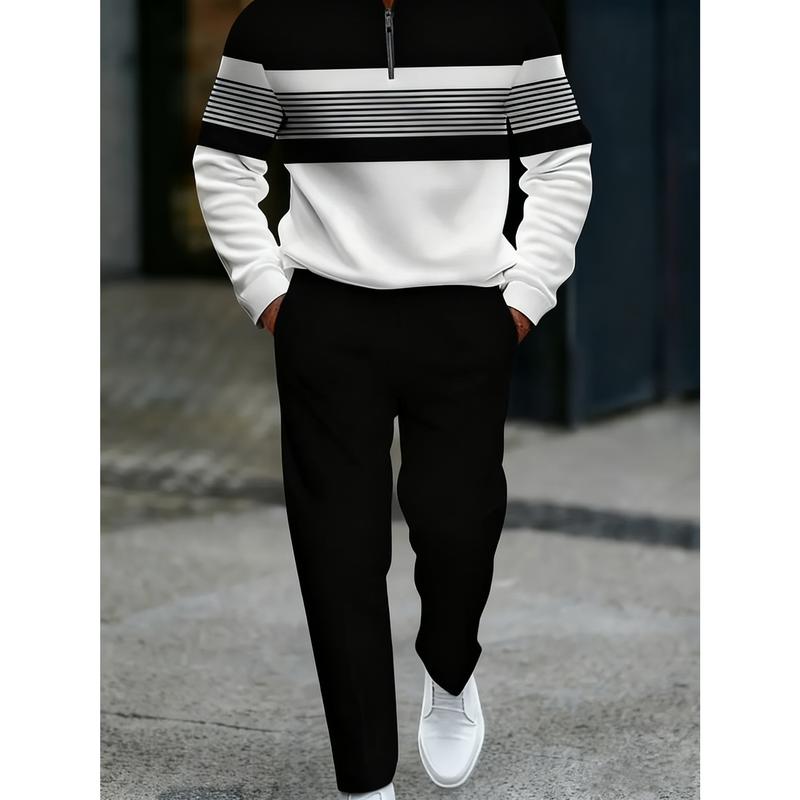 ·This men's sports suit combines black and white contrast for a modern look. The half-zip digital print pattern top adds a unique touch. Paired with black casual pants, it offers a minimalist yet fashionable ensemble. Perfect for daily commuting or casual outings.