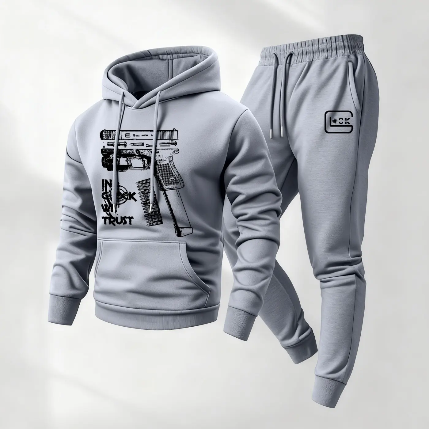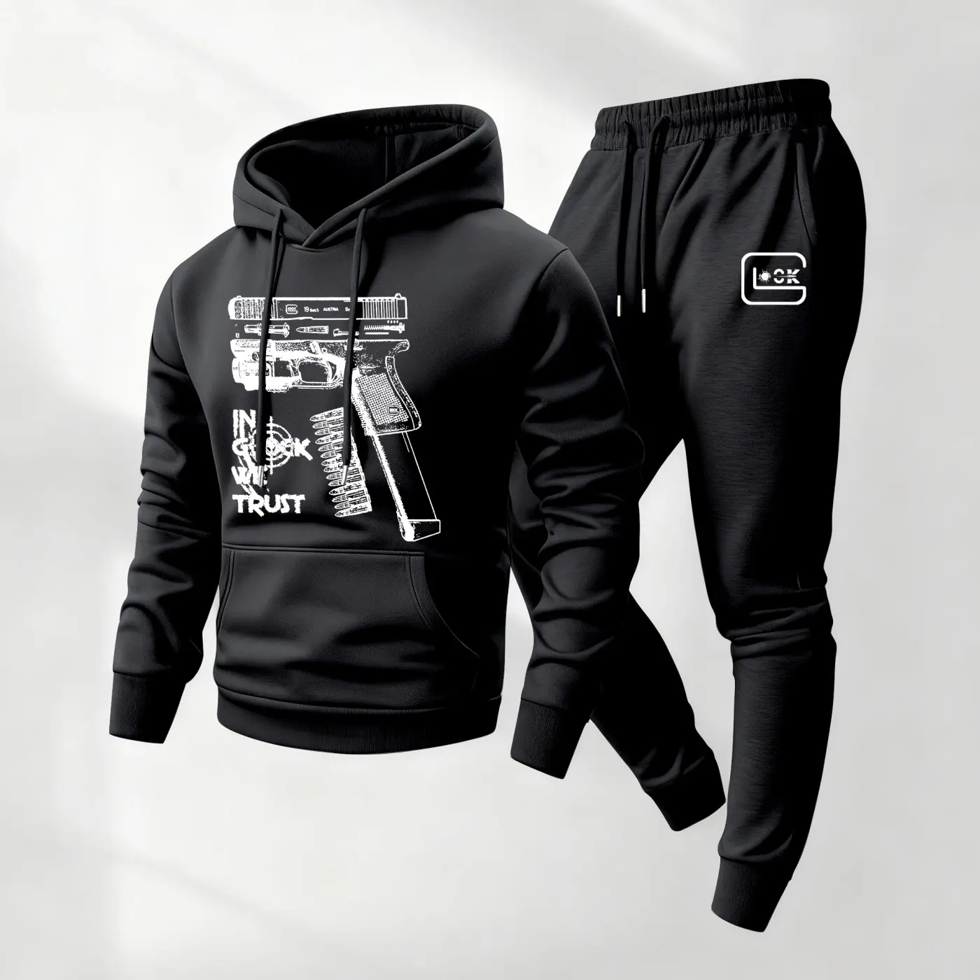 Men’s Bold Gun Print Hoodie And Drawstring Sweatpants Set #inglockwetrusthoodie #Gun #Bold #set #viral