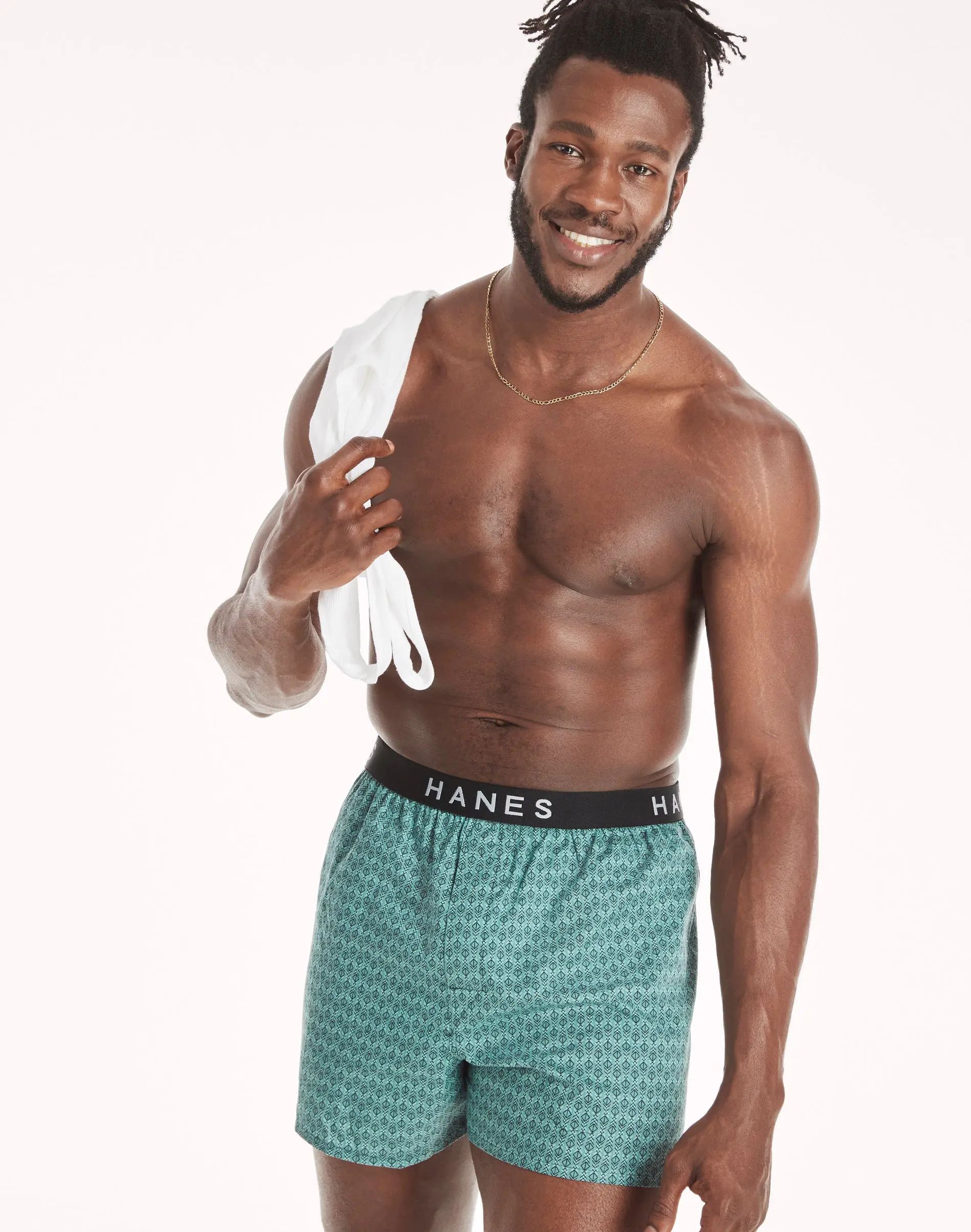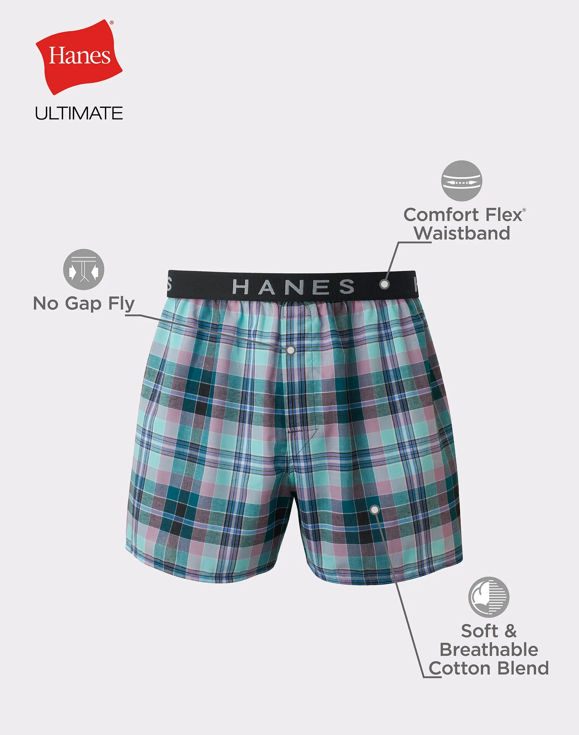 STAY COOL, STAY COMFORTABLE Boxer wearers will welcome a 5-pack of plaid and print cotton-blend boxers, part of the Hanes Ultimate® collection. These assorted print boxers are woven from Cool Comfort® fabric that wicks away moisture to keep you cool and comfortable all day. Even better, these lightweight woven boxers are styled with an improved ultra-soft waistband that now adjusts to fit you. Other thoughtful details designed into these cool woven print boxers are the no-gap fly that stays flat and the Tagless® design, which means no annoying tag to itch or bunch up. There's a lot to like about this men's boxer underwear, available in a convenient 5-pack.