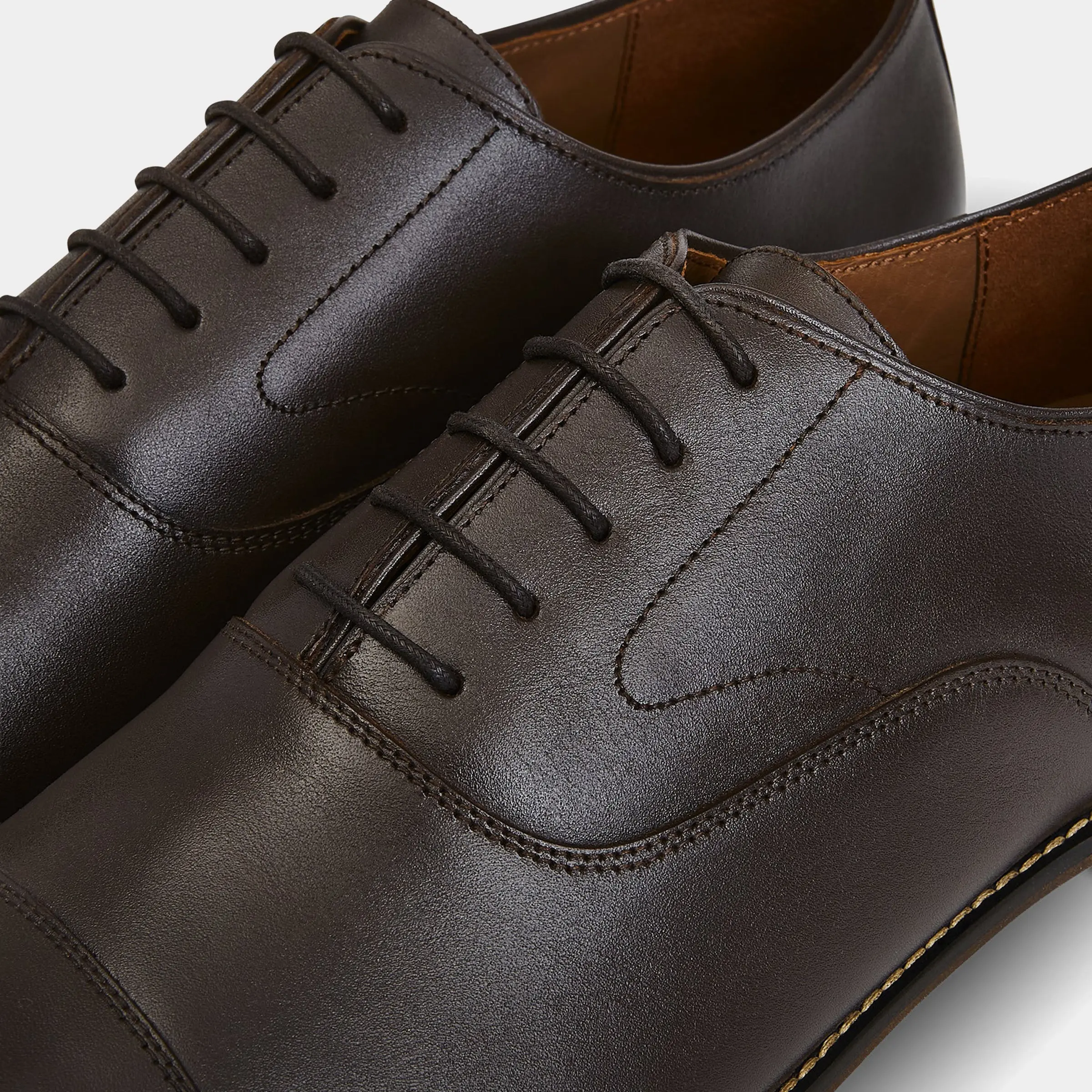 Tradition meets the modern moment with these essential dark brown oxfords. Crafted with Italian leather in a smooth two-tone chocolate finish for added depth and rich color, a cap toe, and elevated stitch detailing, this classic dress shoe promises luxe style and a clean silhouette. This timeless espresso oxford shoe is perfect to pair with a full suit, dress pants, or more casual looks, easily dressed up or down. A leather lining and insole keep you comfortable on the dance floor, through the wedding weekend, during the workday, and at any occasion.