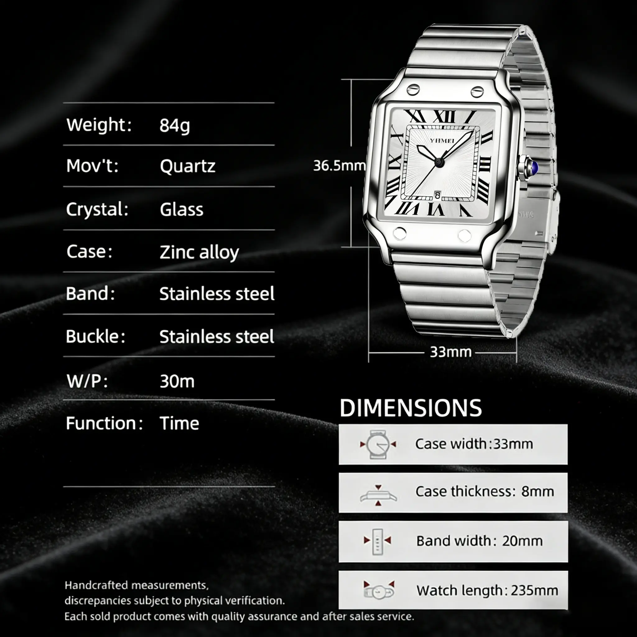 ·Silver Tone: 33mm diameter, 8mm ultra-thin classic white square textured dial.