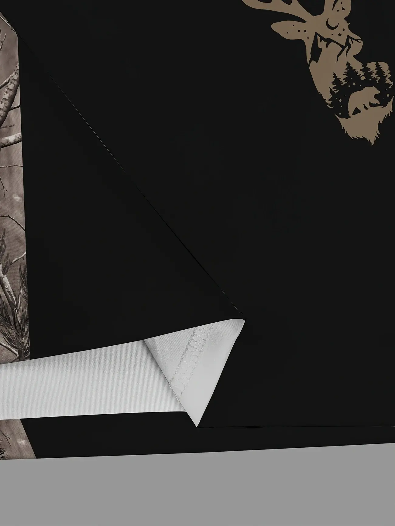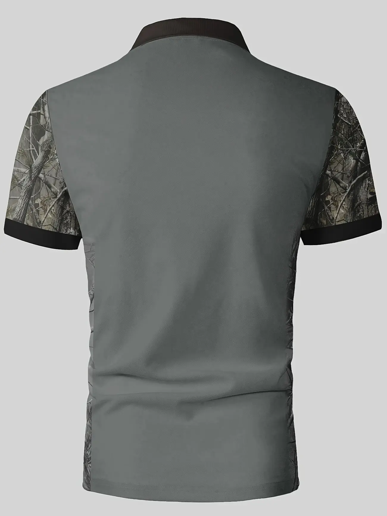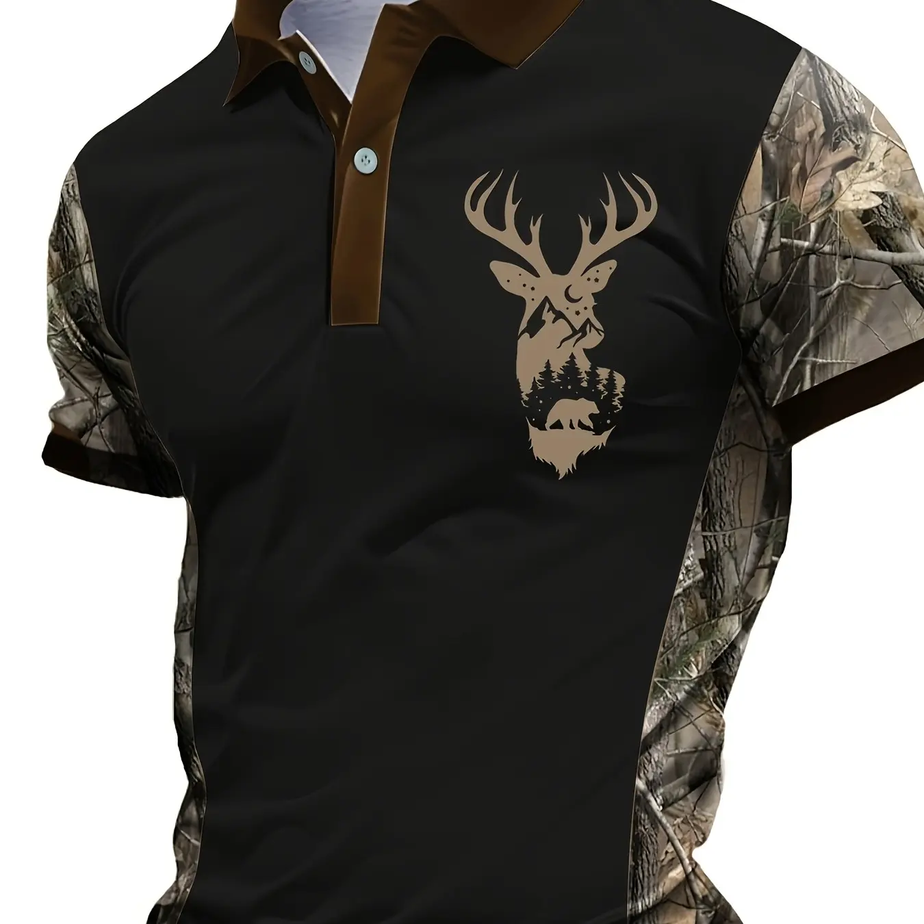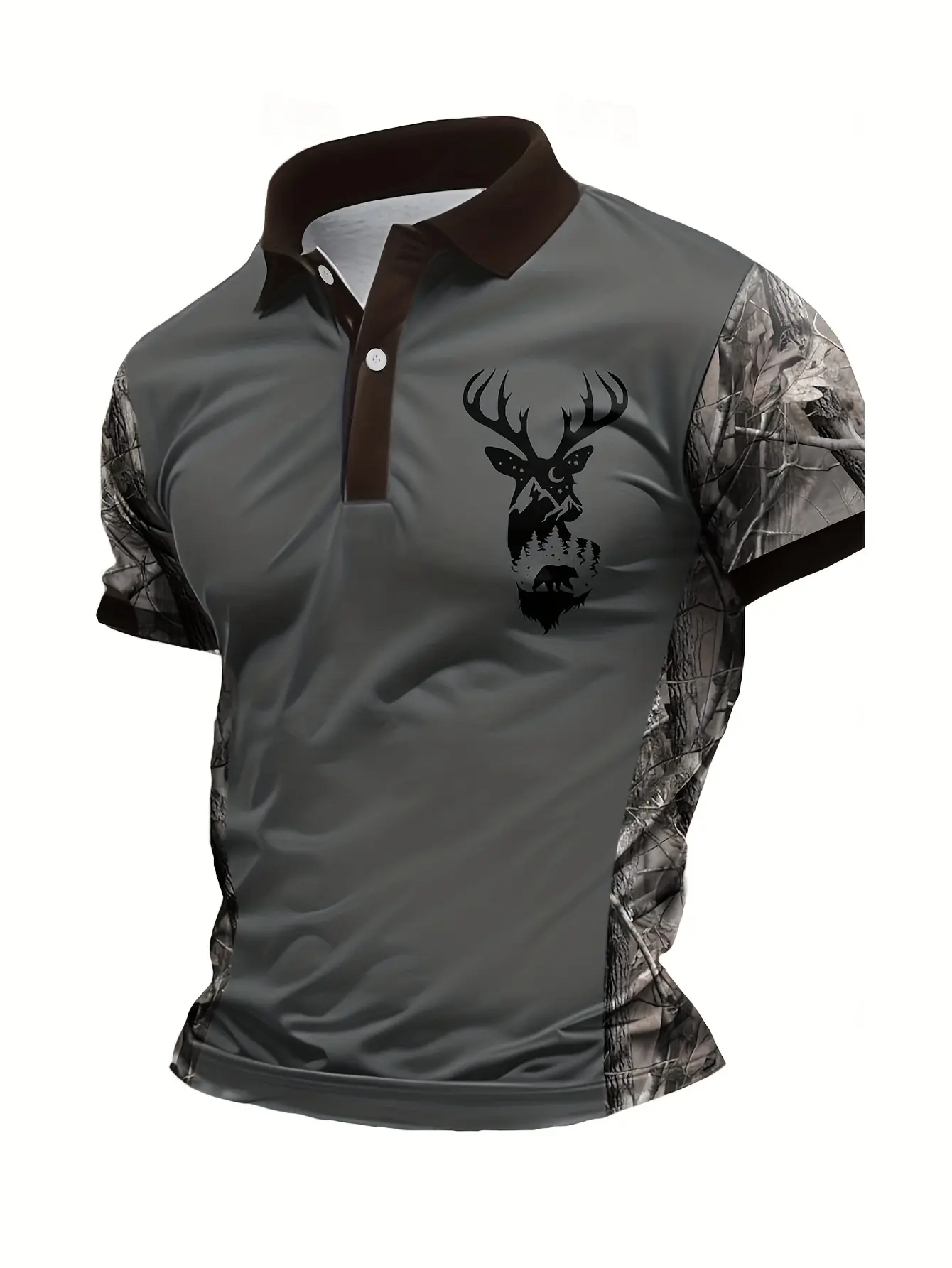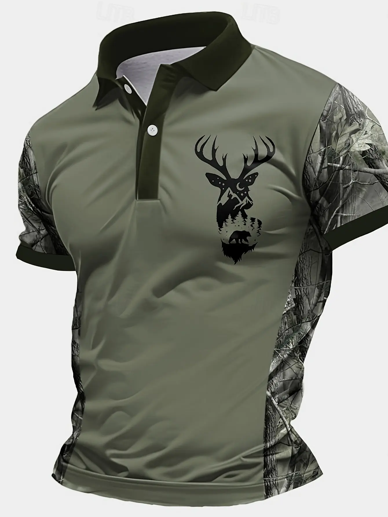 Men's Camouflage Quick Drying Shirt - Casual Outdoor Style, Deer Head Print, Short Sleeve, Button Neck, Summer Hunting and Hiking Clothing, Hiking Equipment Golf Polo Golf Apparel